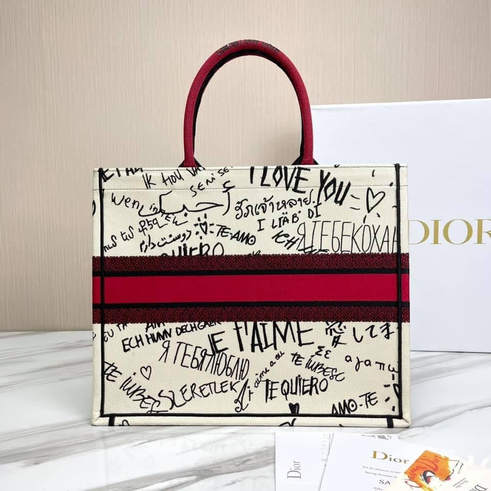 Introduced by Maria Grazia Chiuri, Creative Director of Christian Dior, the Dior Book Tote has become a staple of the Dior aesthetic. Designed to hold all the daily essentials, the black style is fully embroidered with a white Dior Around the World motif, further embellished with a play on shiny and matte thread. The design is adorned with the 'CHRISTIAN DIOR' signature on the front and exemplifies the House's signature savoir-faire. The tote may be carried by hand or over the shoulder.