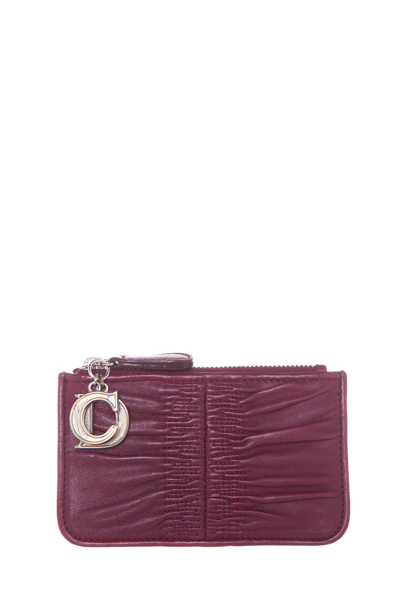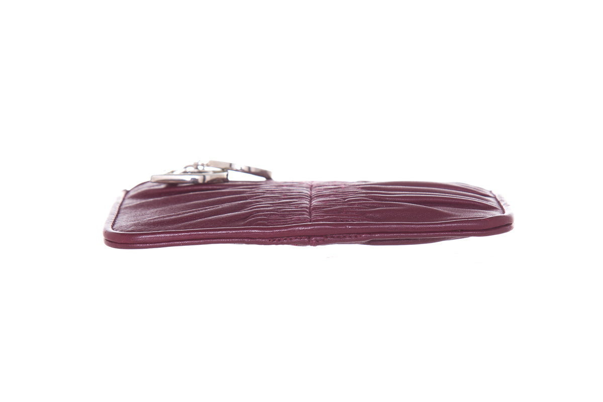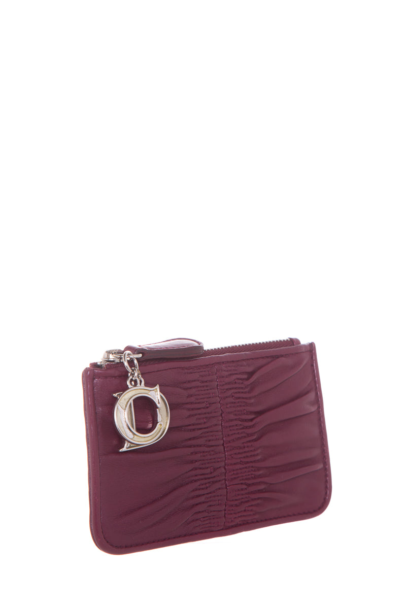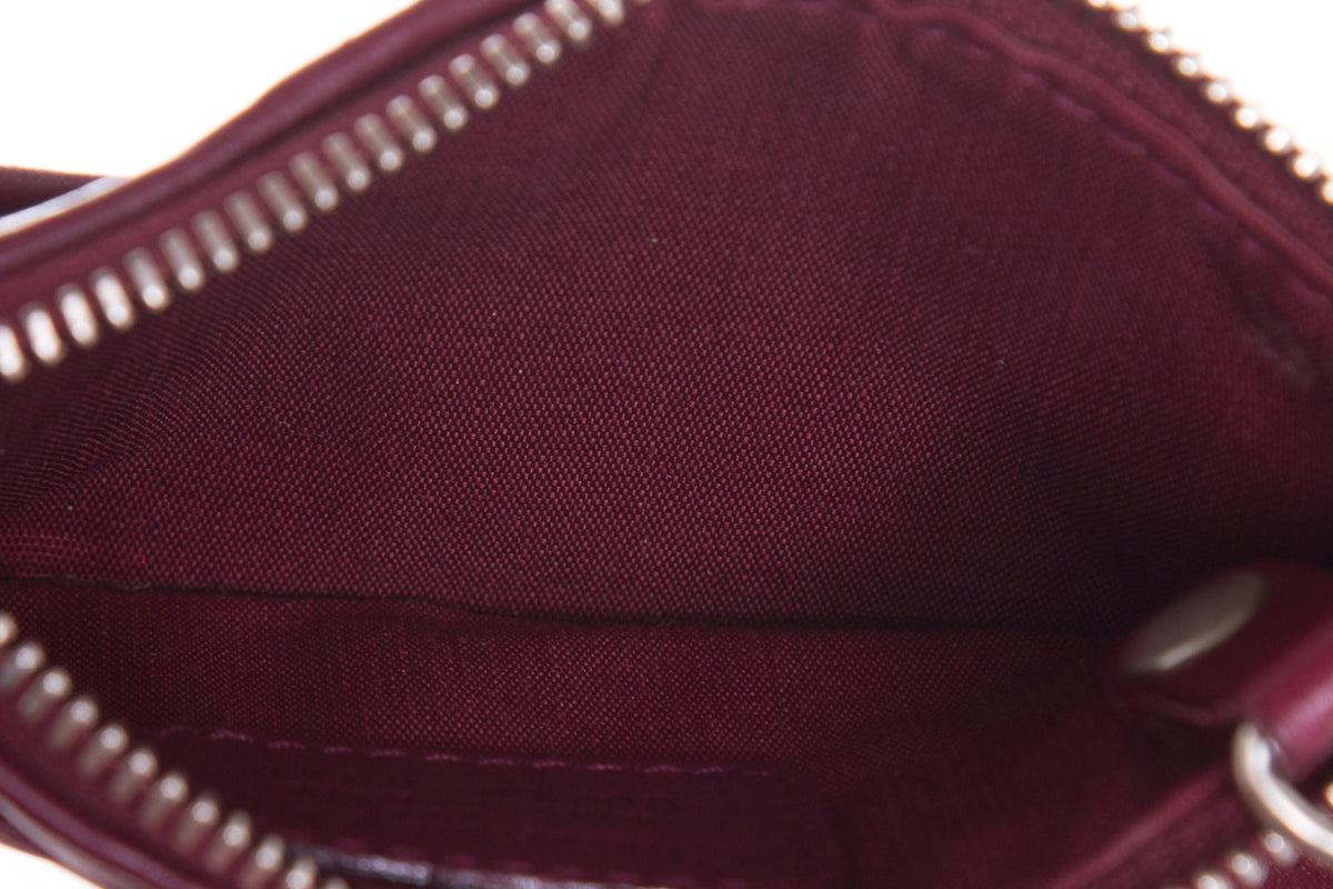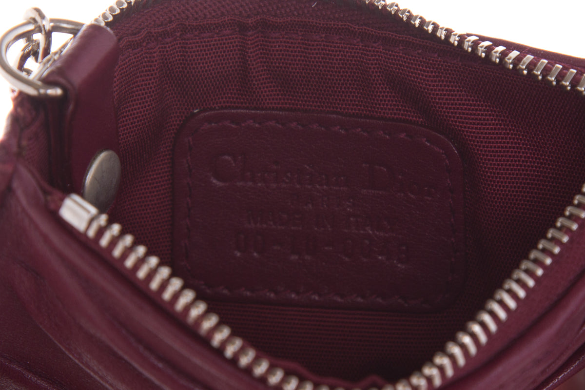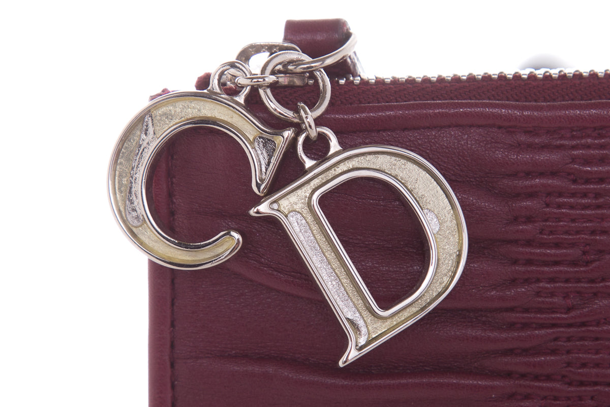 Christian Dior Burgundy Key Chain Wallet with top zipper silver charm. This item is in fair condition; CD charm missing acetate details.