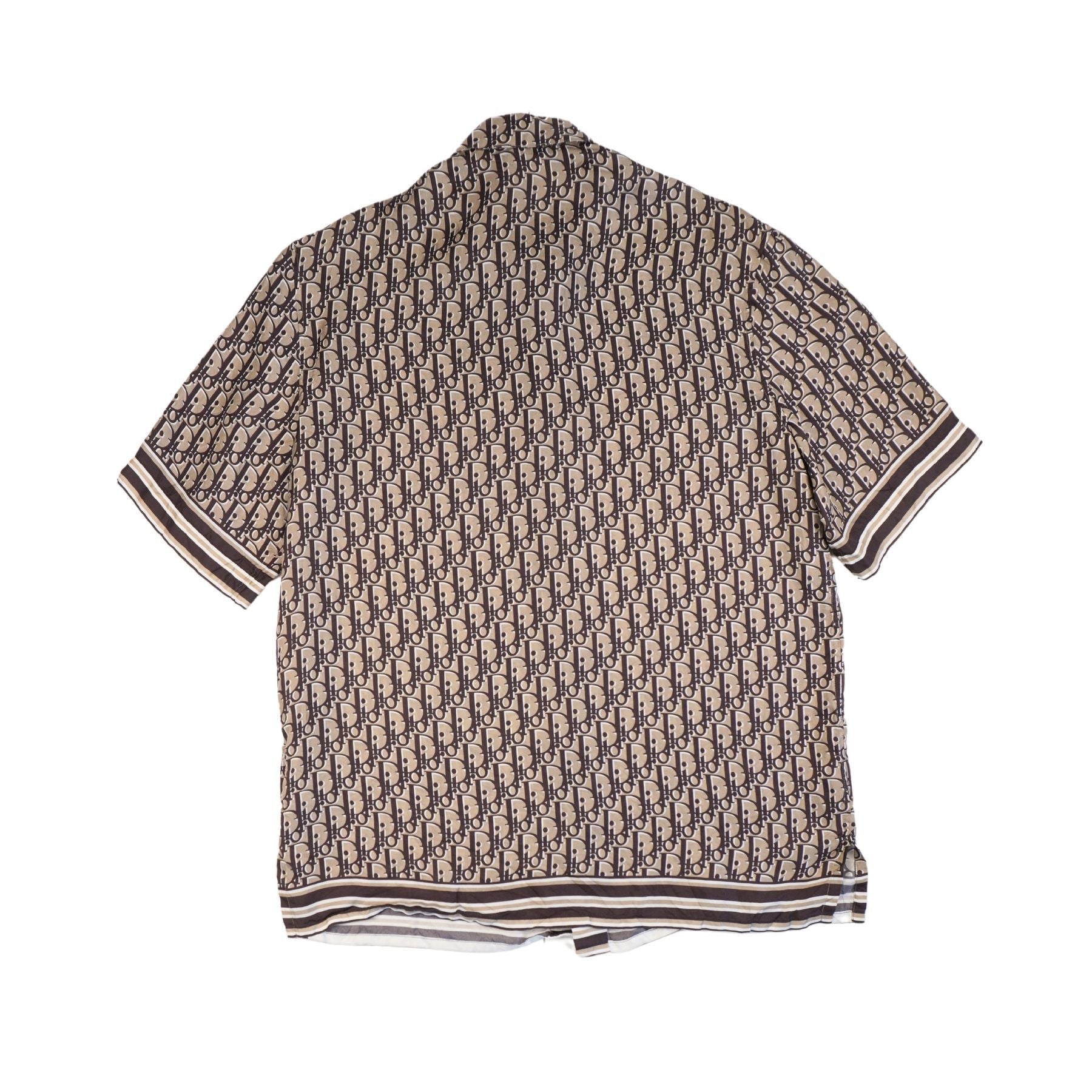 Christian Dior button-down shirt in brown and beige oblique logo monogram printed silk with a striped trim, a pointed collar, and a hidden front-button opening.