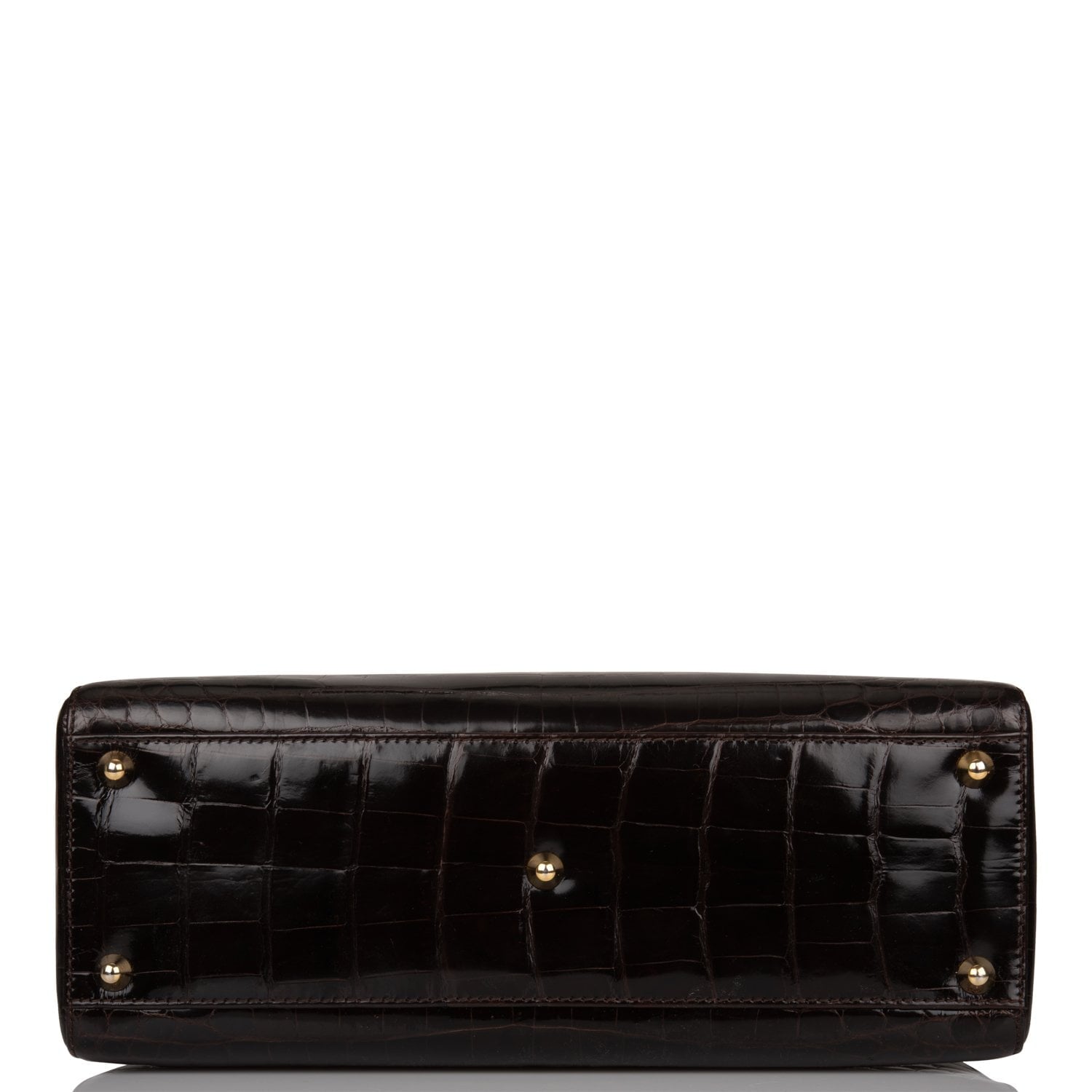 This Lady Dior Tote is in dark brown alligator with gold hardware and has two top handles, five bottom feet, Dior logo charms, dark brown shoulder strap with gold tone hardware and zip top closure.