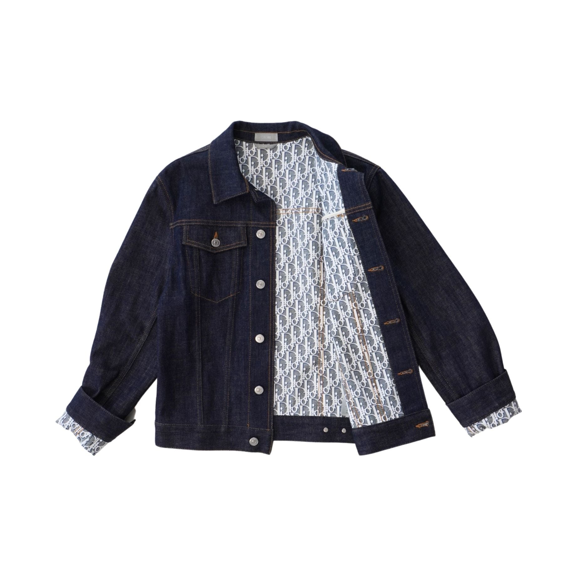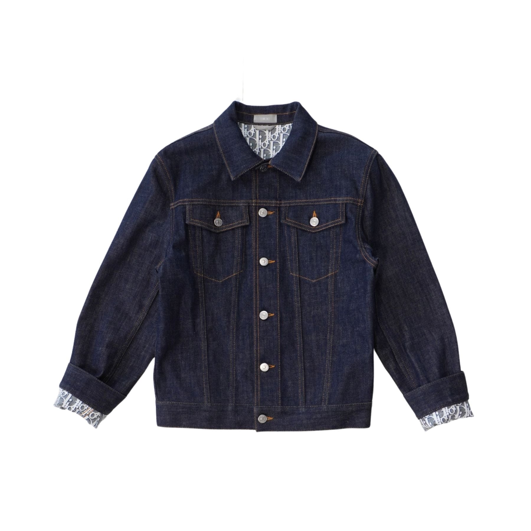 Christian Dior jean jacket in dark washed blue denim with a front-button closure with silver hardware, brown contrast stitching, and an oblique monogram printed interior.