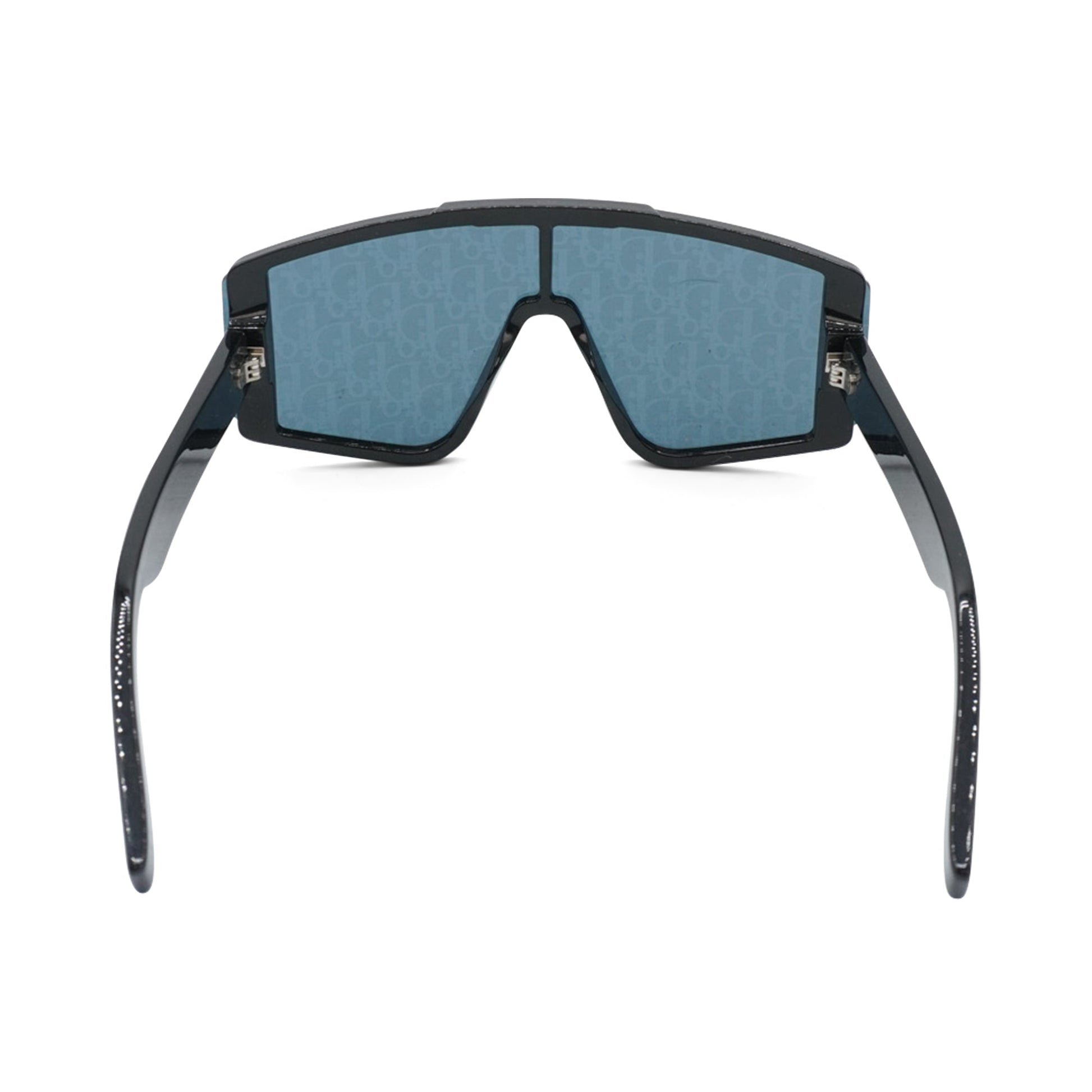 Christian Dior 'Diorxtrem' shield sunglasses in black acetate with an oblique monogram print on the lens, silver stud hardware on the sides, and fuzzy patches on the arms.