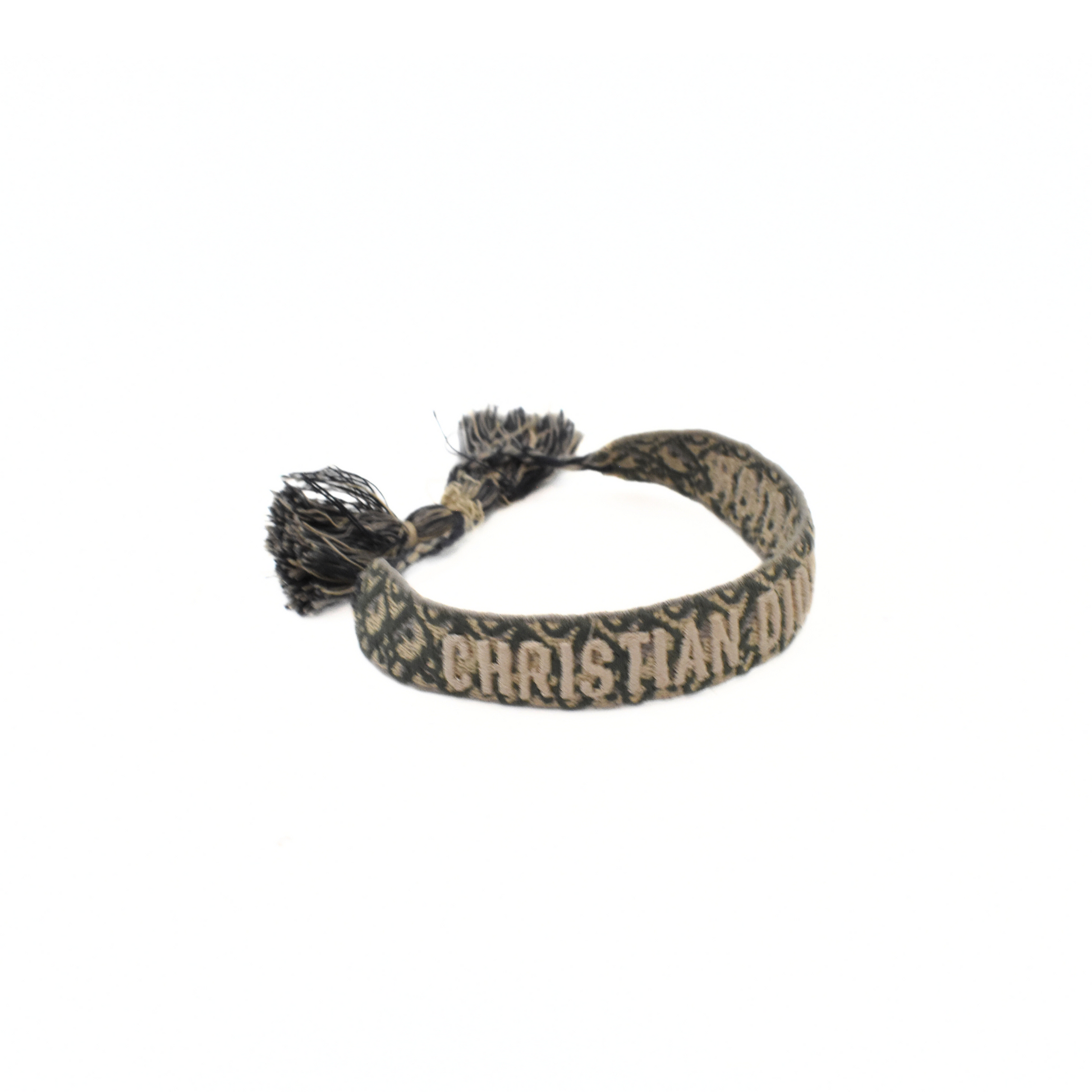 Christian Dior friendship bracelet in grey and cream woven 'Diorissimo' pattern with 'CHRISTIAN DIOR J'ADIOR' embroidered in cream. Adjustable size with tassel ends.