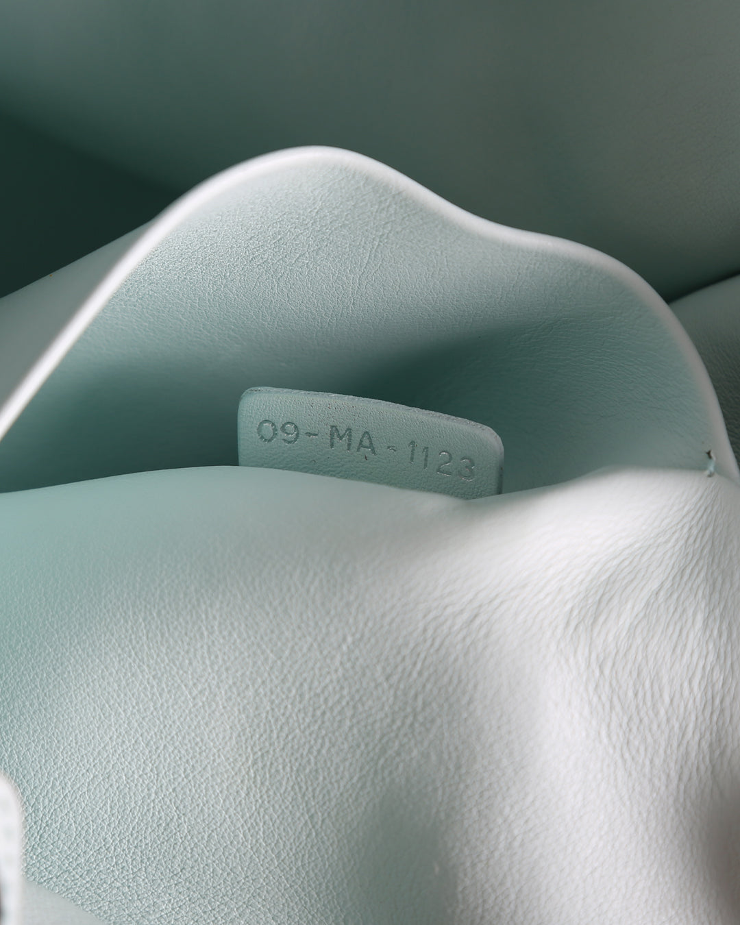 It features double leather handles with the signature brand letter charms dangling from one side, detachable/adjustable buckled leather shoulder strap, top magnetic snap button which opens to a light blue leather lined interior compartment with two patch pockets and a detachable zipped pouch, five protective base studs, and silver tone hardware.