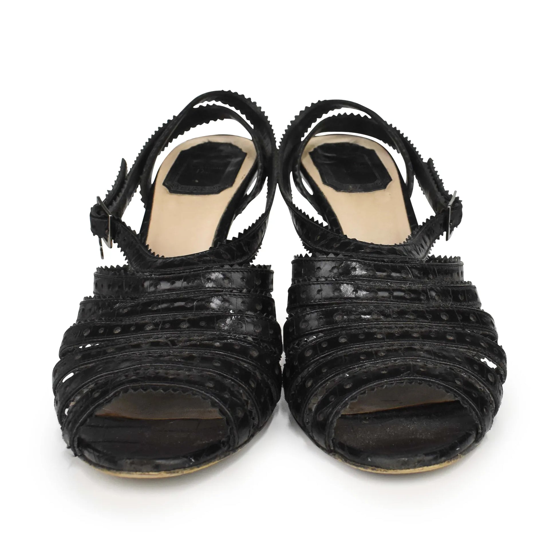 Christian Dior strappy peep-toe heels in black croc-embossed leather with triangle trim in black patent leather. Features perforated circle details, a stiletto heel, and an adjustable ankle strap with logo charm in silver hardware.