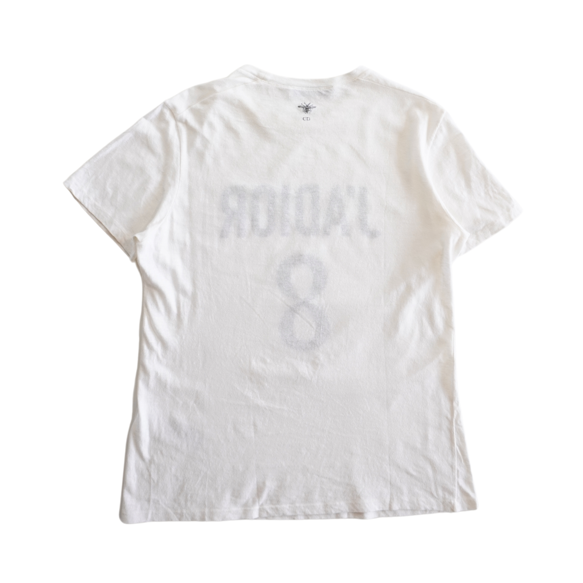 Christian Dior white semi-sheer t-shirt with 'J'ADIOR 8' graphic printed on the inside to give a faded look. The top also features signature bee and CD logo print at the nape of the neck.