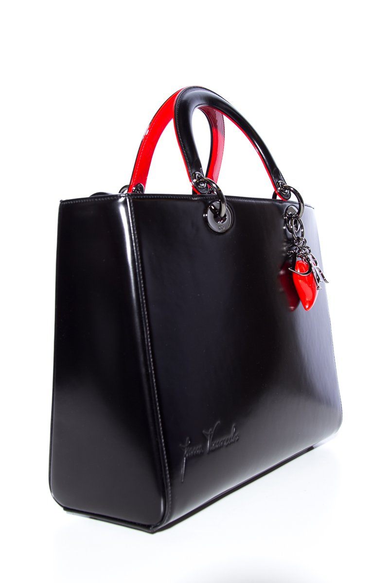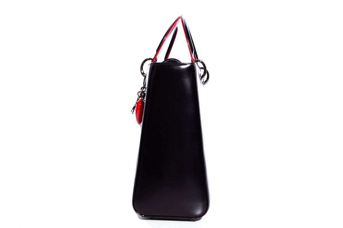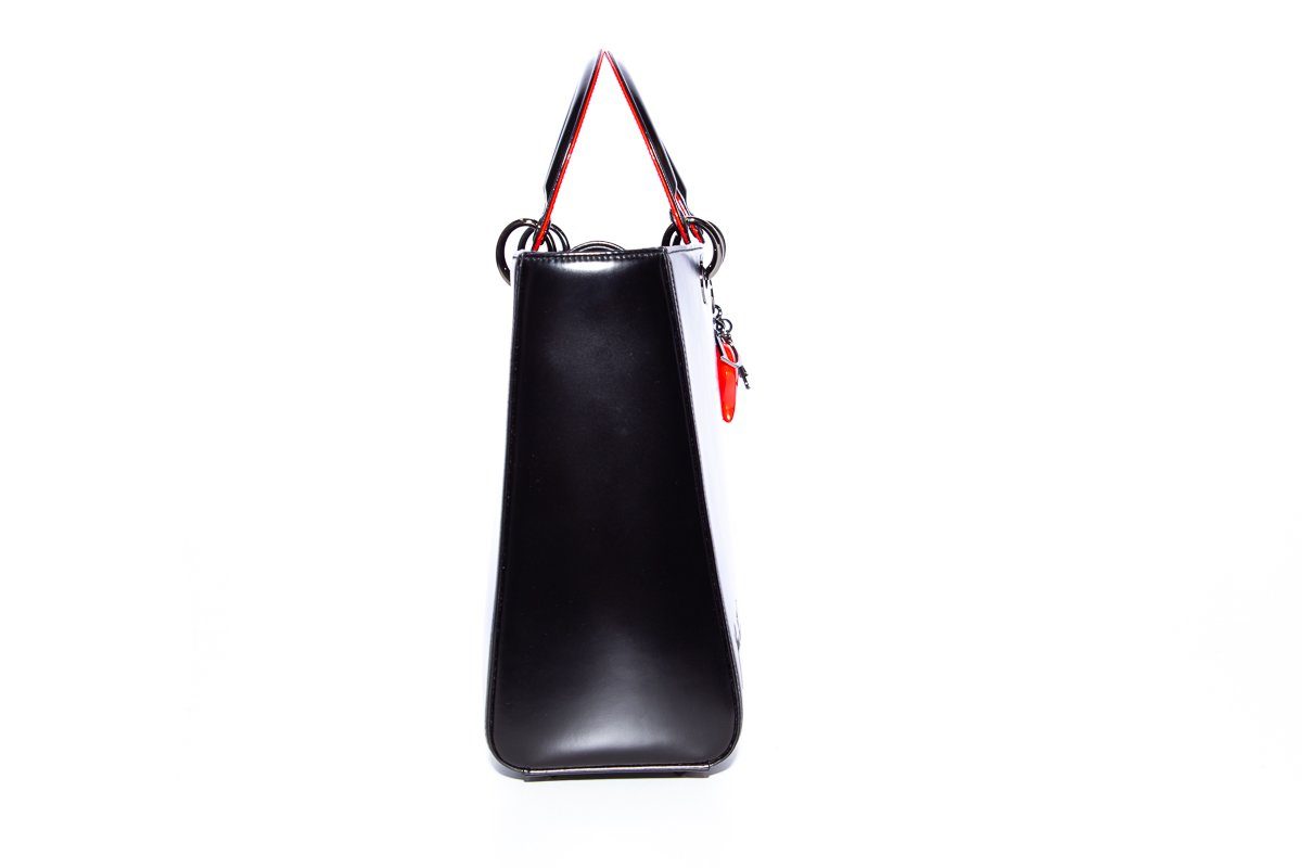 Christian Dior black smooth leather art Lady Dior handle bag with patent leather red trim throughout, detachable strap, silver tone hardware, and a speaker at back. This item is in excellent condition.