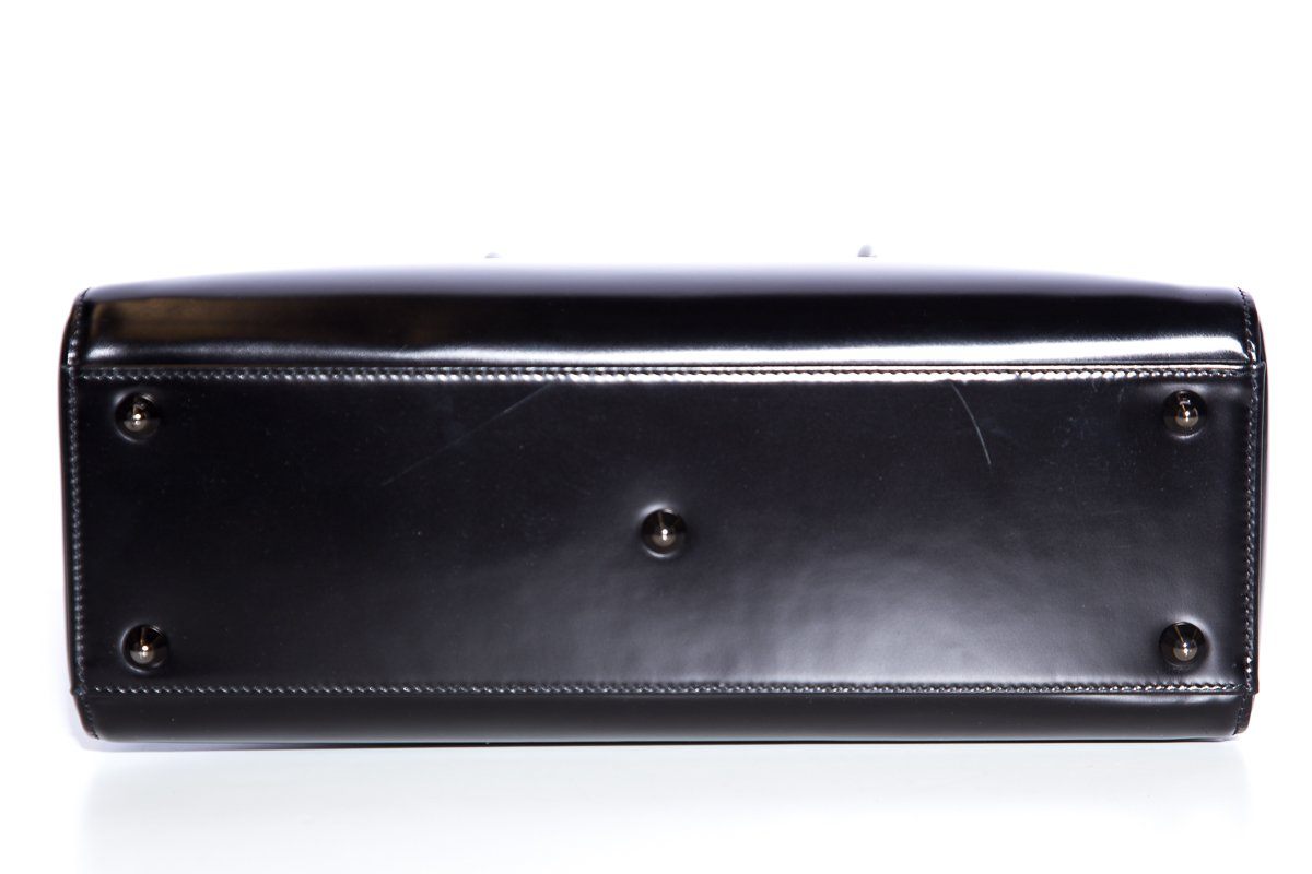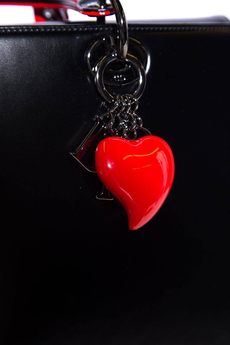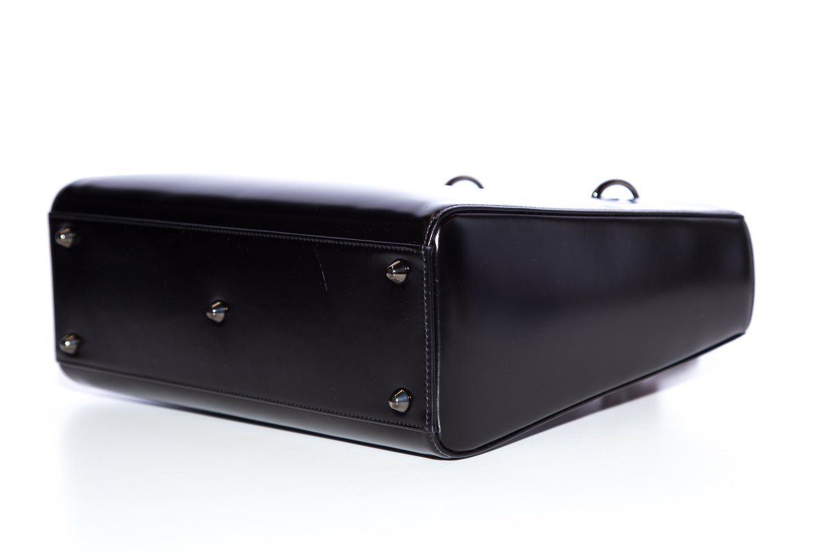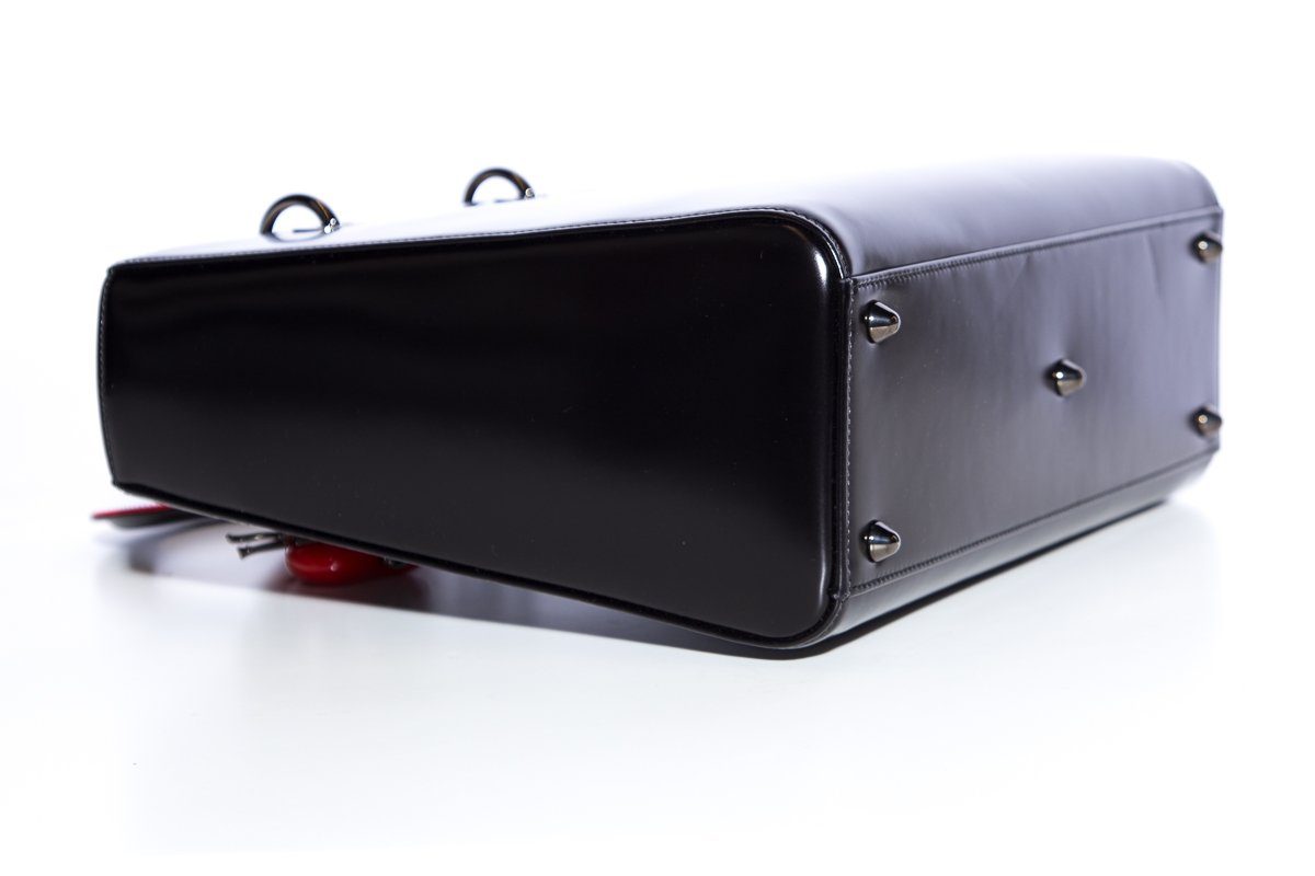 Christian Dior black smooth leather art Lady Dior handle bag with patent leather red trim throughout, detachable strap, silver tone hardware, and a speaker at back. This item is in excellent condition.