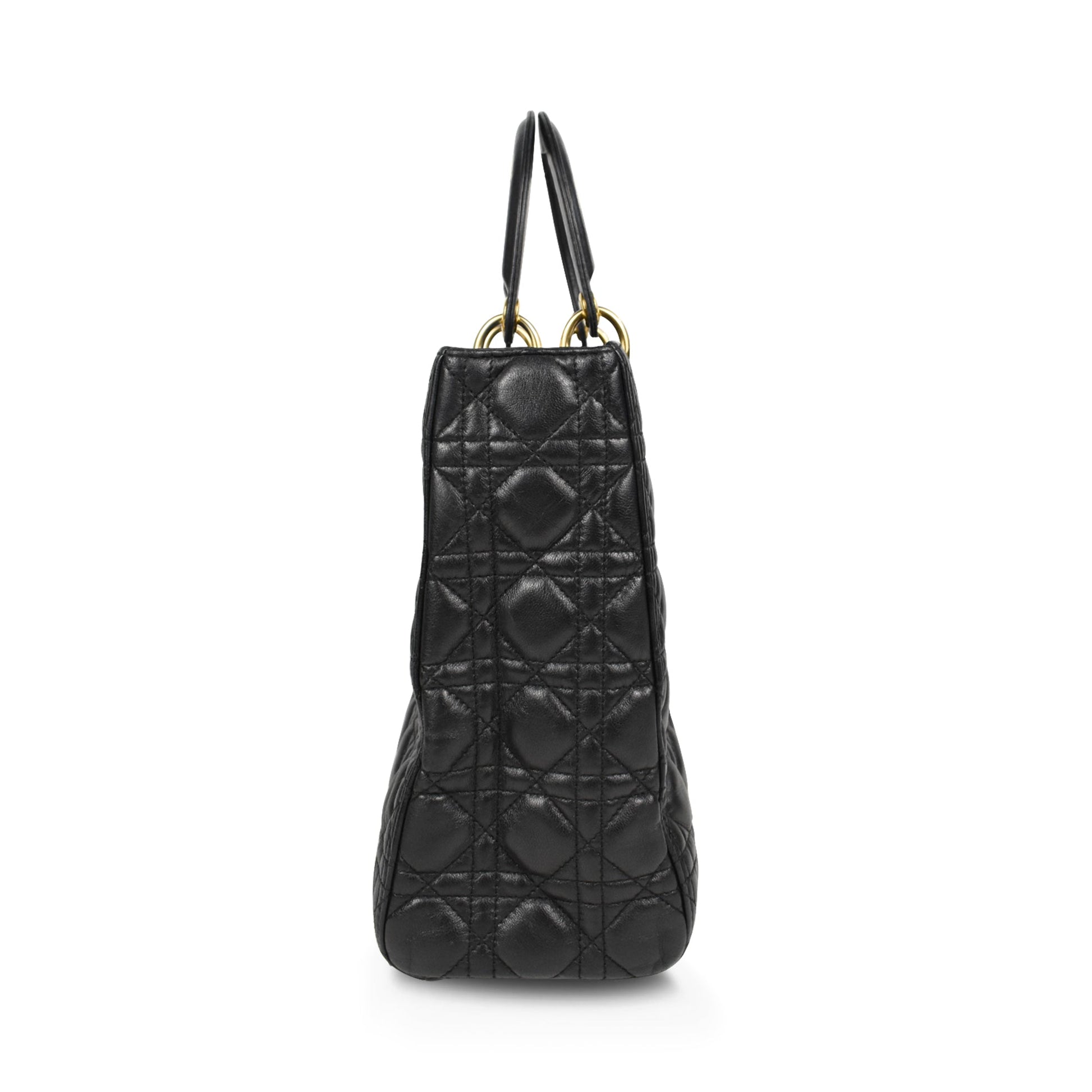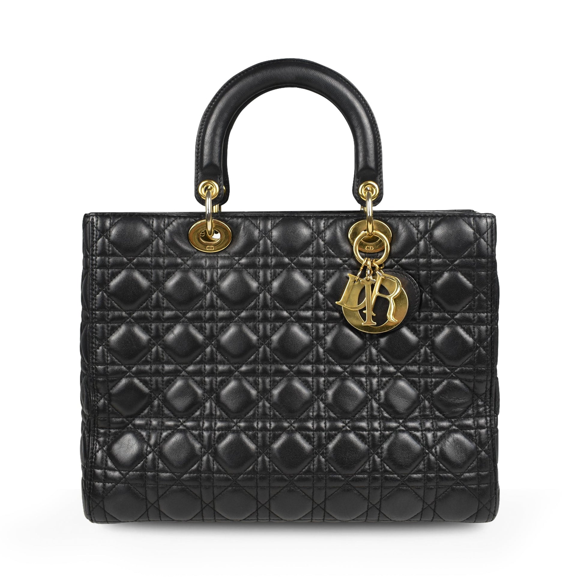 Christian Dior 'Large Lady Dior' bag in black calfskin leather with quilted cannage stitching, dual top handles, and 'D.I.O.R.' charms in gold metal hardware. Features a removable shoulder strap, a top zip closure, and red monogram canvas lining with an inner zip pocket.