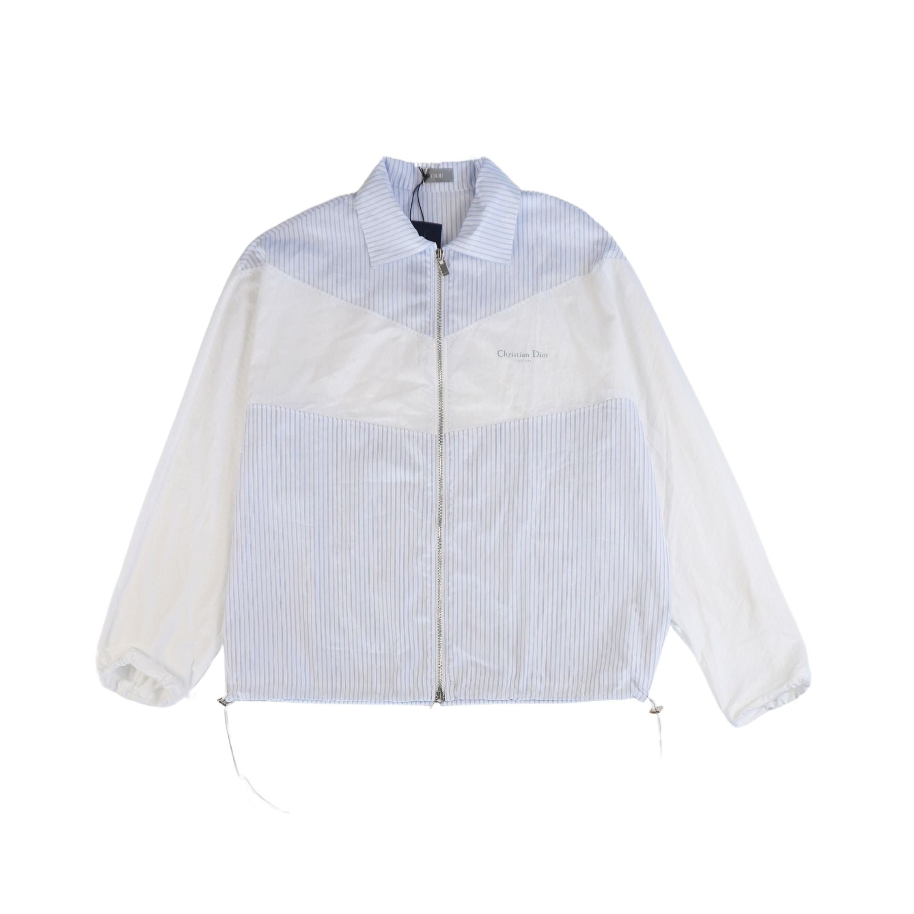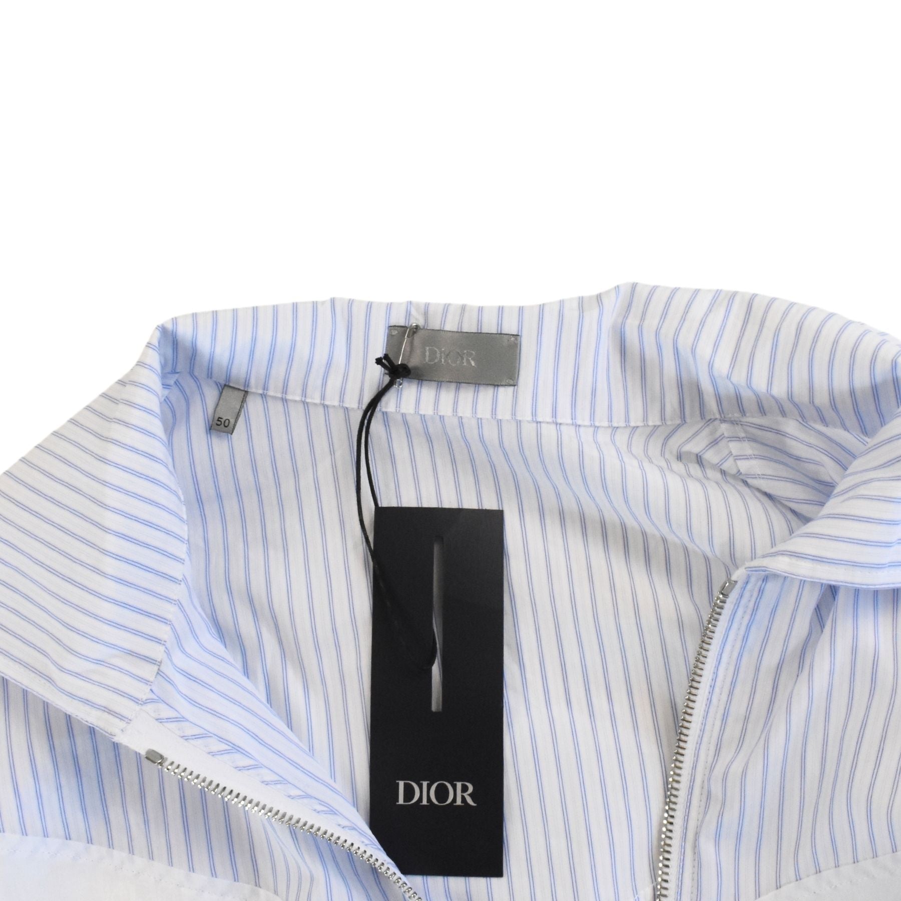 Christian Dior zip-up jacket in blue and white stripes and white 'Diorissimo' logo white patterned panel across the chest and on the sleeves. Features a silver double-zip closure, an adjustable drawstring waistband, side slip pockets, and adjustable elastic sleeve cuffs.