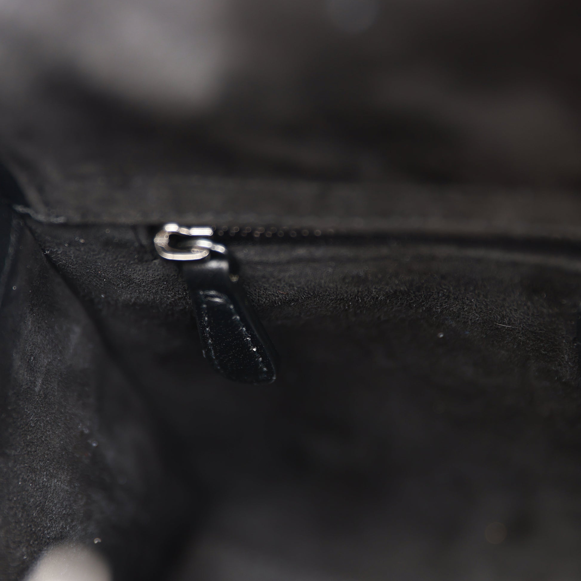 The interior is lined in black fabric and has one pocket and one zip pocket on the rear wall.
