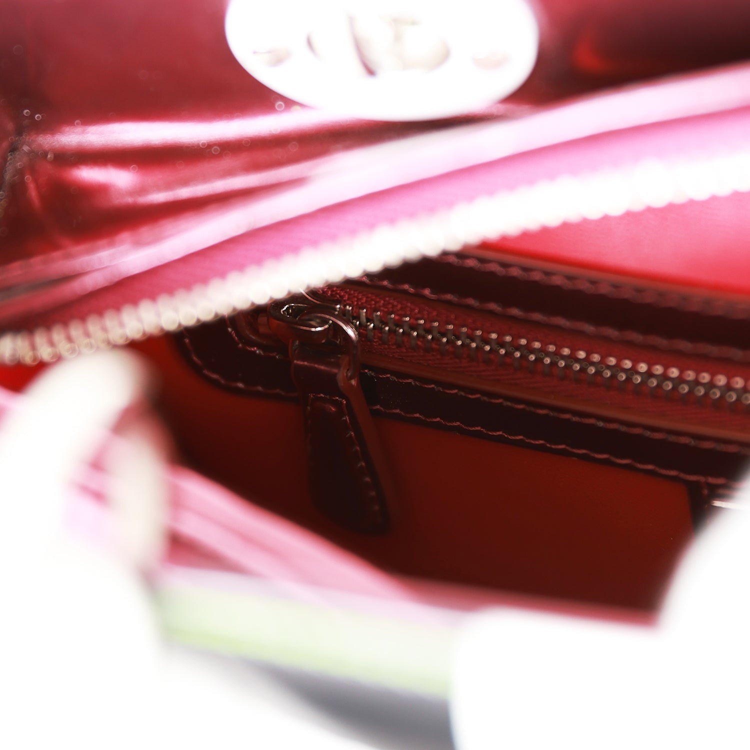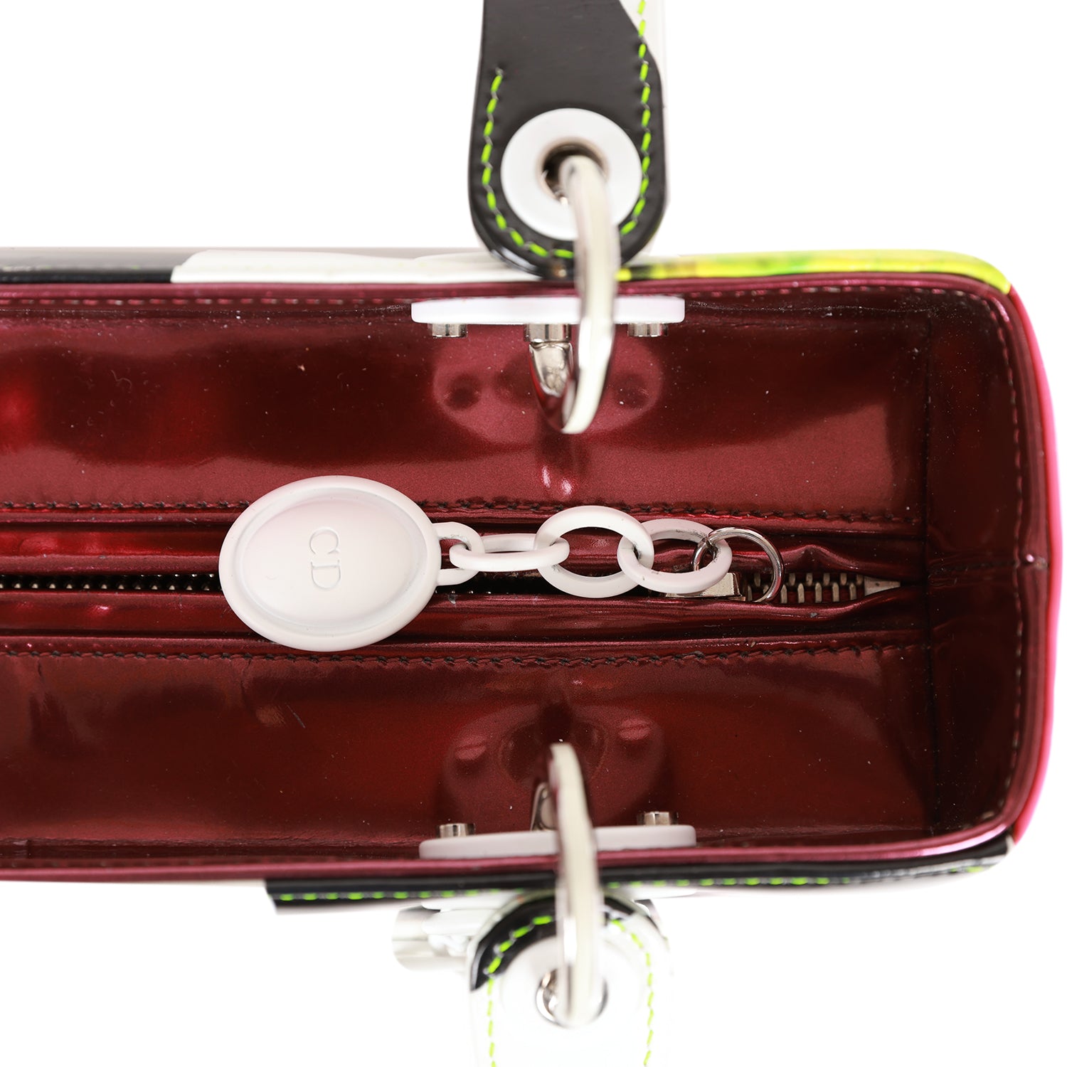 This Medium Lady Dior Tote is in multicolor patent leather with silver hardware and has floral motifs, two top handles, four bottom feet, Dior logo charms, a limited edition Mark Quin logo charm, a pink metallic removable shoulder strap with silver tone hardware and zip closure. This bag was designed in 2016 as part of a collaboration with British contemporary artist Mark Quinn.