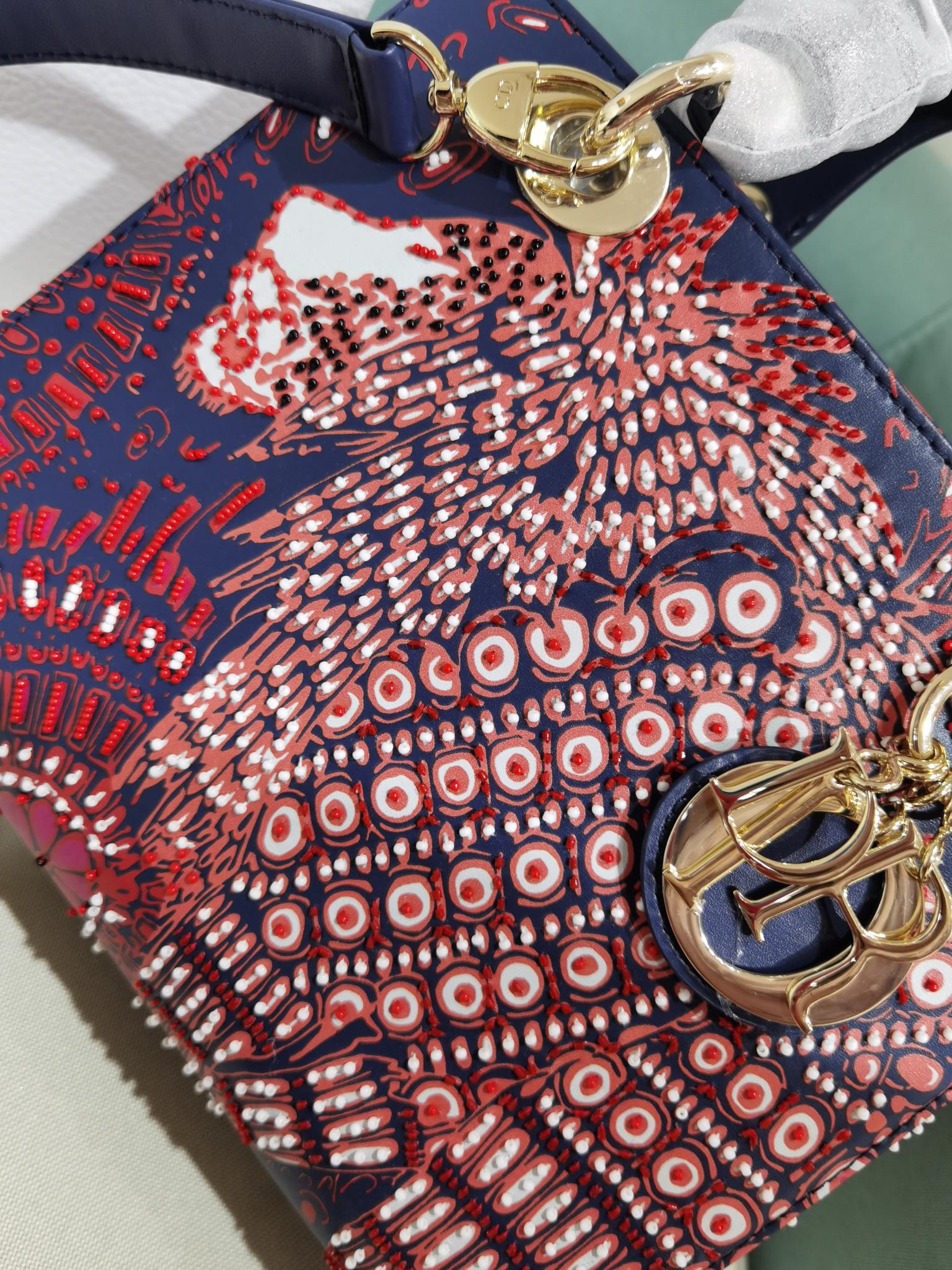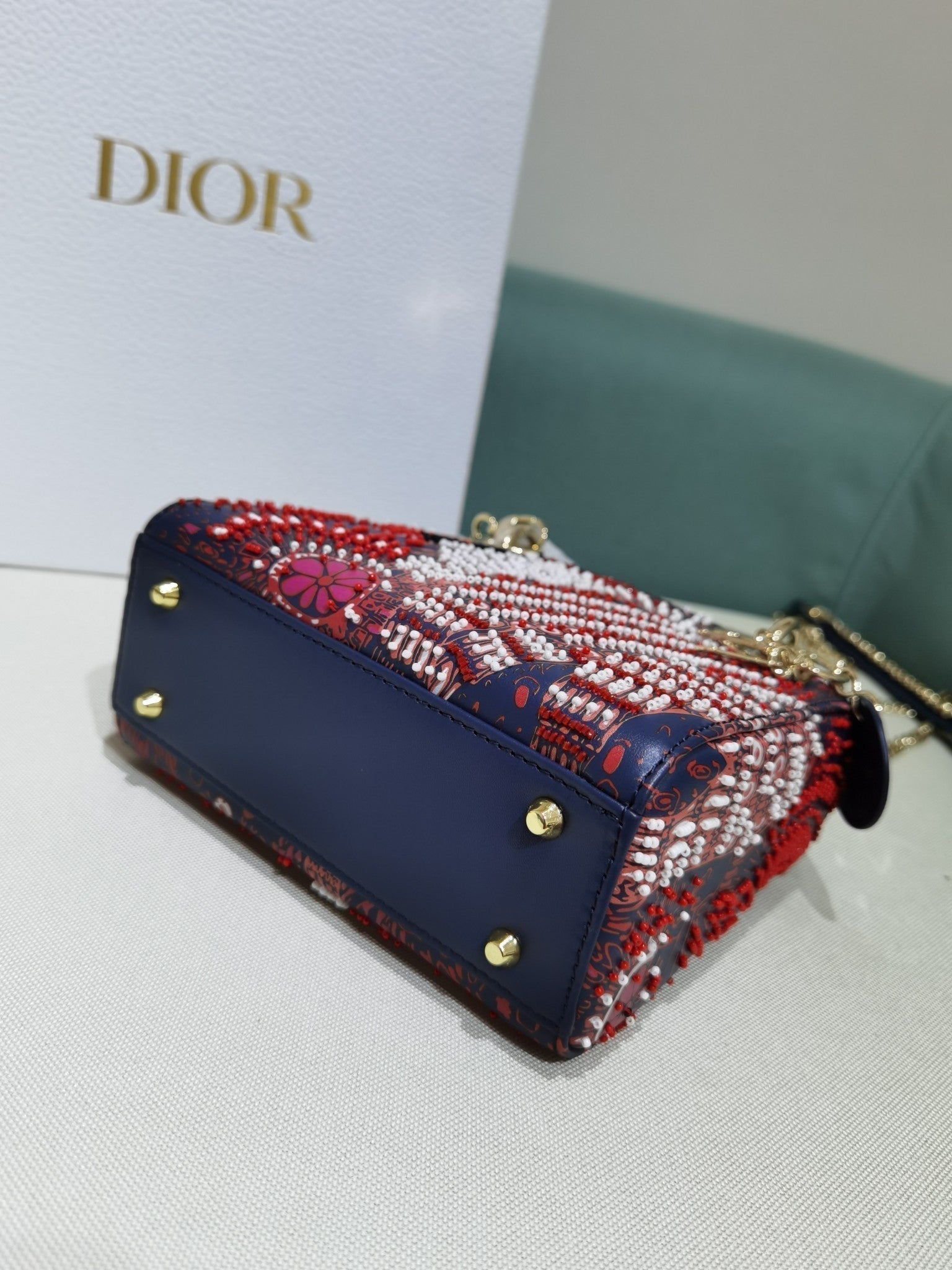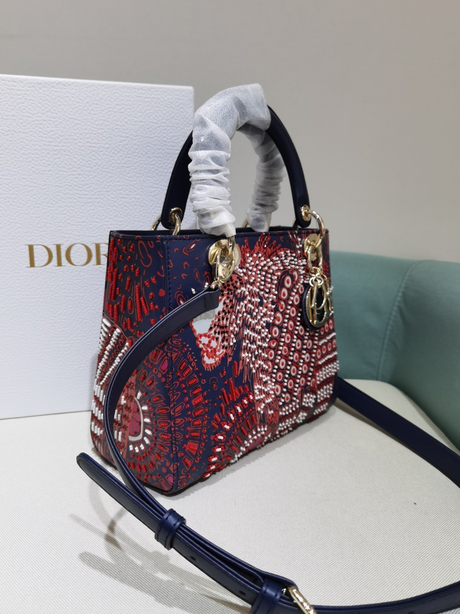 The Lady D-Lite bag combines classic elegance with House modernity. The style is fully embroidered with the Rose des Vents houndstooth motif, a play on the hallmark House pattern. The front features a 'CHRISTIAN DIOR' signature while the thick 'D.I.O.R.' charms in pale gold-finish metal embellish and illuminate the silhouette. Equipped with a wide, reversible and removable embroidered shoulder strap, the medium Lady D-Lite bag can be carried by hand, over the shoulder or crossbody.