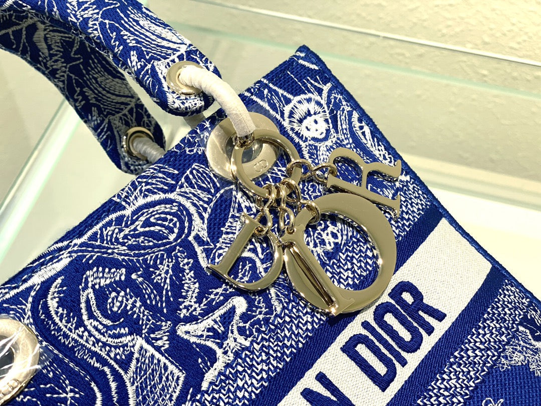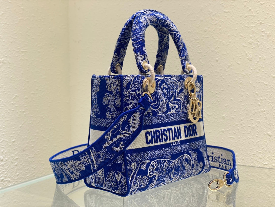 The Lady D-Lite bag combines classic elegance with House modernity. Part of the Dioriviera 'CHRISTIAN DIOR PARIS' signature on the front, while 'D.I.O.R.' charms in pale gold-finish metal enhance and illuminate the silhouette. Equipped with a wide reversible and removable embroidered shoulder strap, the medium Lady D-Lite bag can be carried by hand or crossbody, and can be coordinated with other Dioriviera creations.