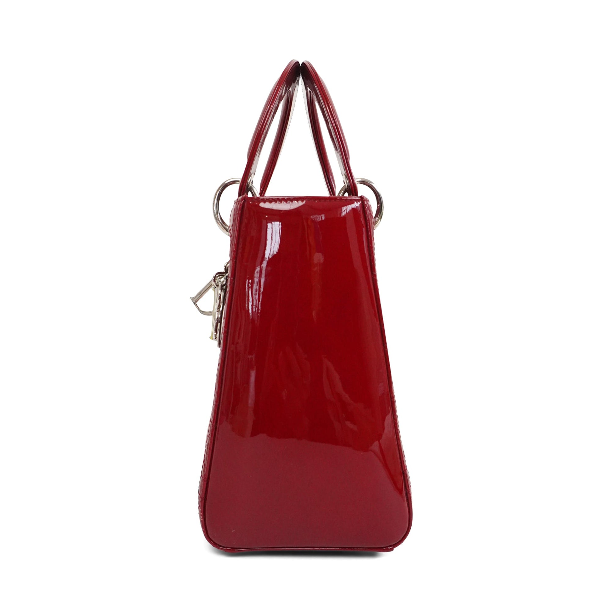 Christian Dior 'Medium Lady Dior' handbag in cannage quilted cherry red patent leather with silver hardware and dangling logo charms. Features structures top handles and a removable shoulder strap. The bag has a zip closure and fabric lined pocket with interior flat zip pocket.