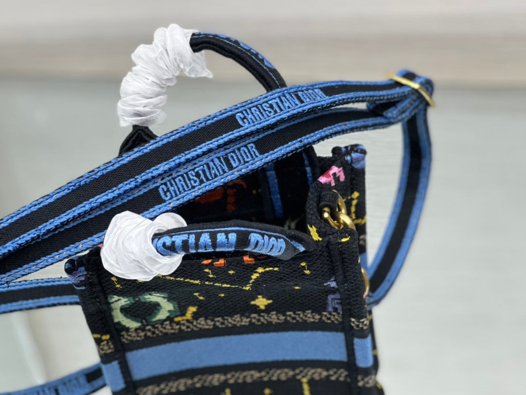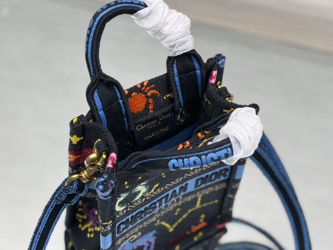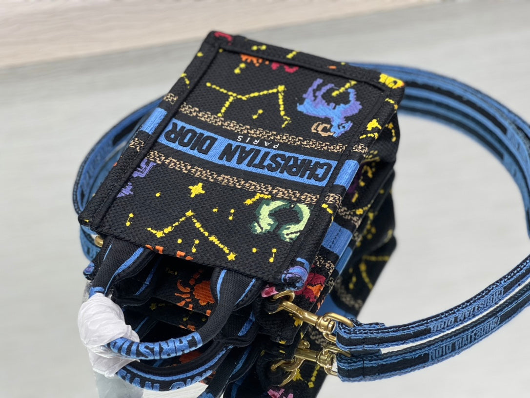 ?ÿMaria Grazia Chiuri's phone bag enriches the iconic Dior Book Tote line with an ideal example of the House's savoir-faire. The yellow style is entirely embroidered with the multicolor Dior Pixel Zodiac motif, offering a new take on astrological signs in a whimsical and colorful universe. Enhanced by the 'CHRISTIAN DIOR PARIS' signature on the front, the miniature bag will accommodate a phone as well as the small daily essentials. Completed by an adjustable and removable embroidered shoulder strap, the modern accessory can be carried by hand, over the shoulder or crossbody.