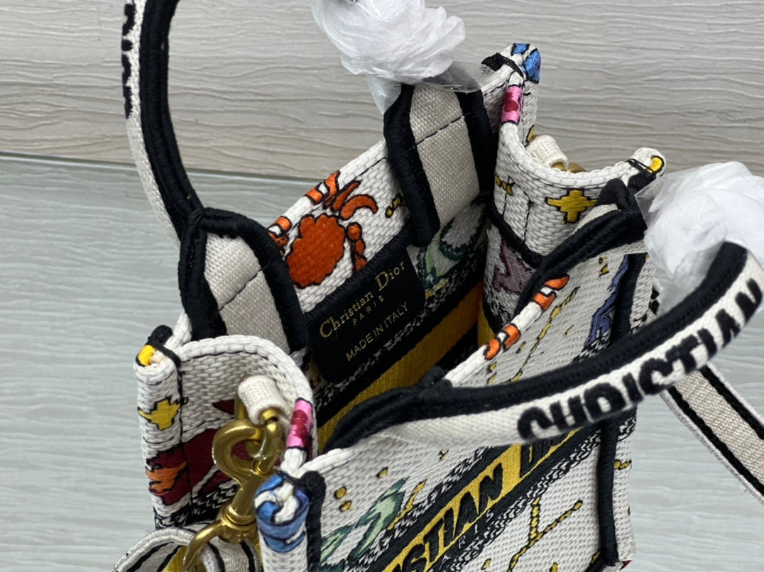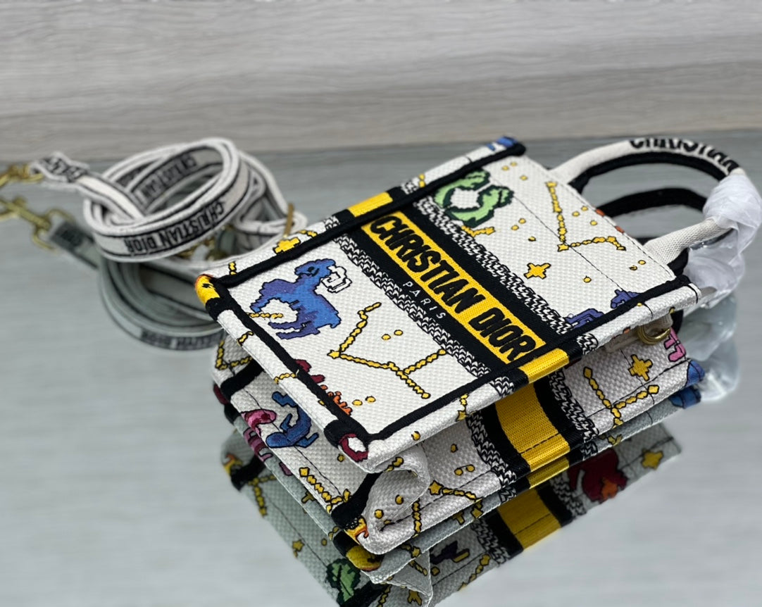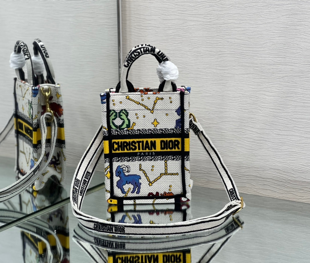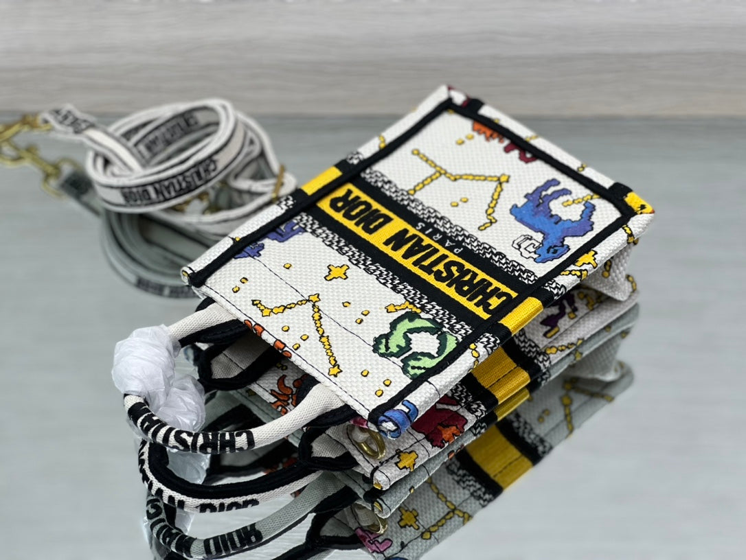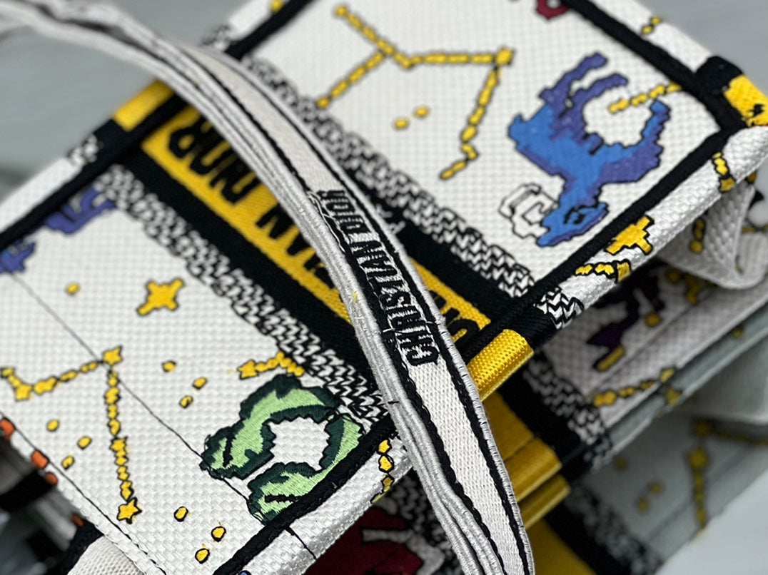 ?ÿMaria Grazia Chiuri's phone bag enriches the iconic Dior Book Tote line with an ideal example of the House's savoir-faire. The yellow style is entirely embroidered with the multicolor Dior Pixel Zodiac motif, offering a new take on astrological signs in a whimsical and colorful universe. Enhanced by the 'CHRISTIAN DIOR PARIS' signature on the front, the miniature bag will accommodate a phone as well as the small daily essentials. Completed by an adjustable and removable embroidered shoulder strap, the modern accessory can be carried by hand, over the shoulder or crossbody.