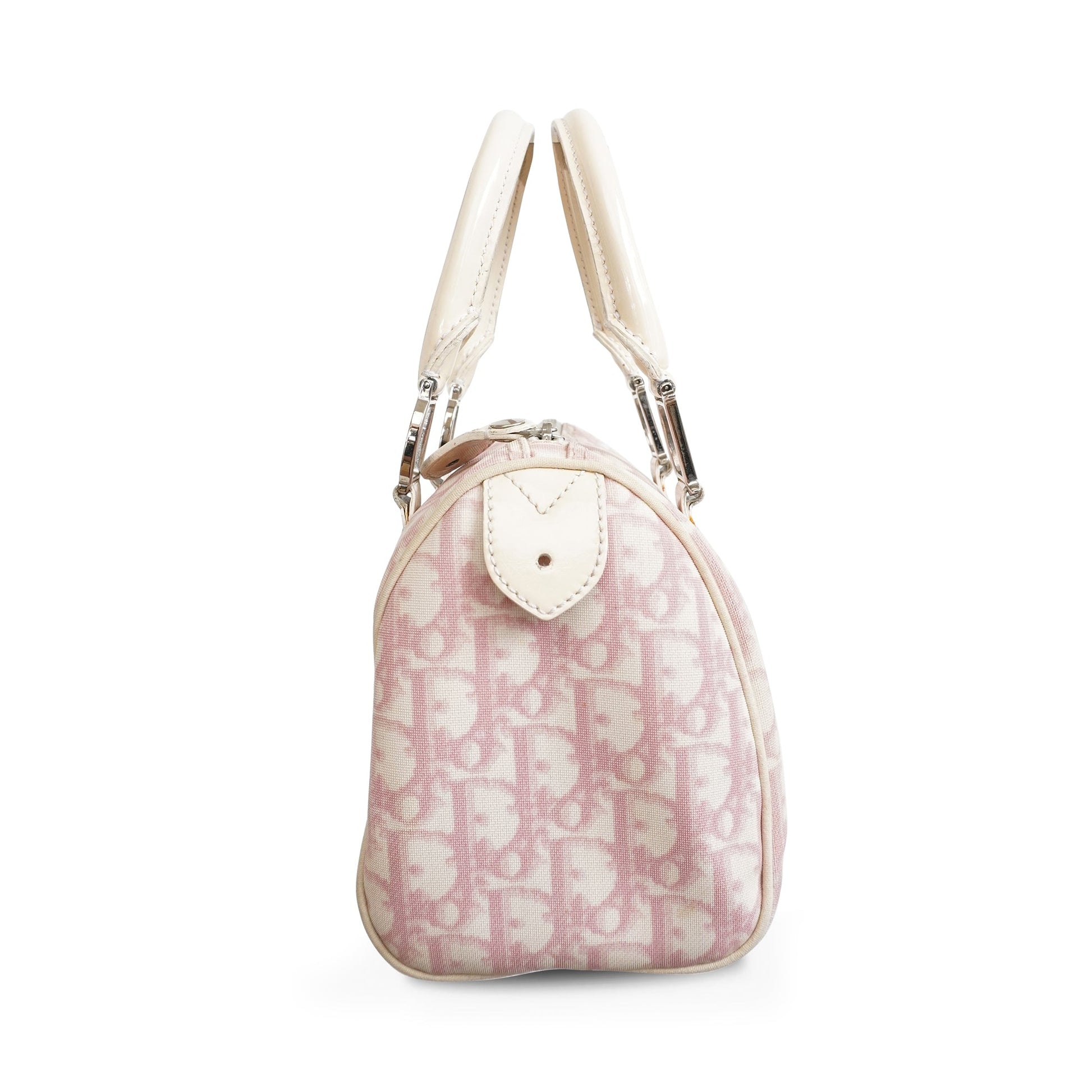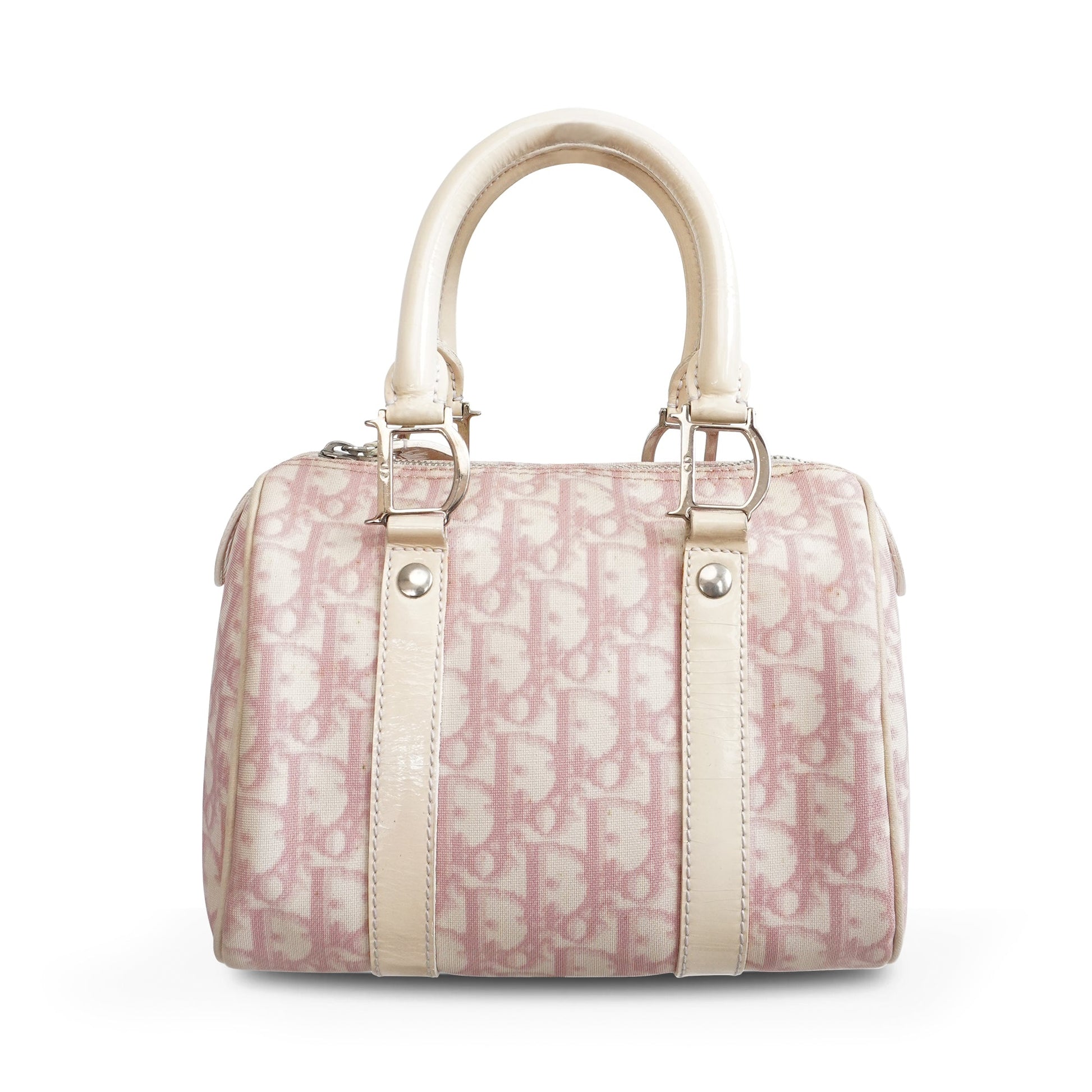 Christian Dior vintage 'Oblique Boston Mini' handbag in pink and white 'Diorissimo' oblique monogram printed coated canvas with a cream patent leather trim. The bag has dual rolled top handles with silver 'D' o-ring hardware, a top zip opening, and a pink nylon interior lining.