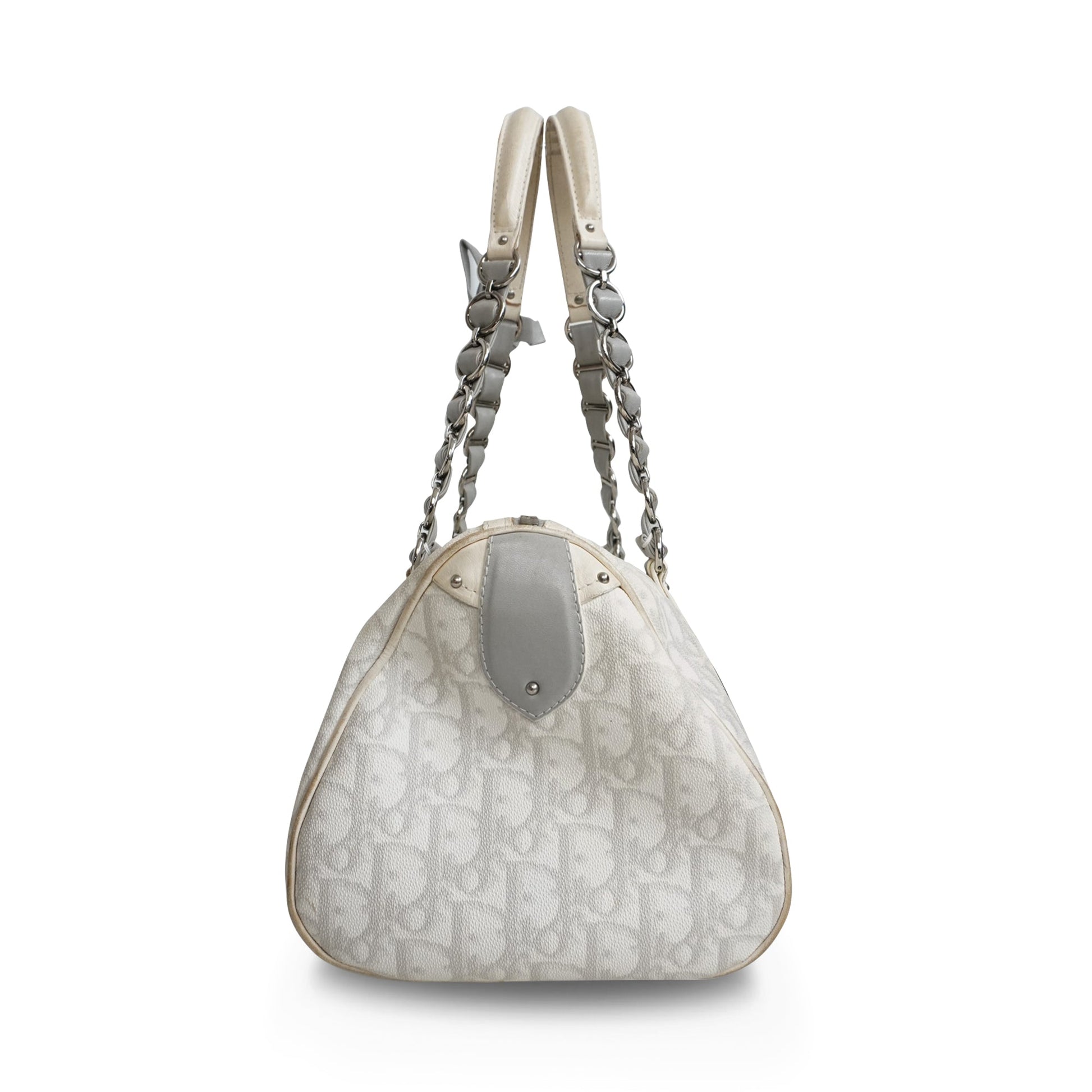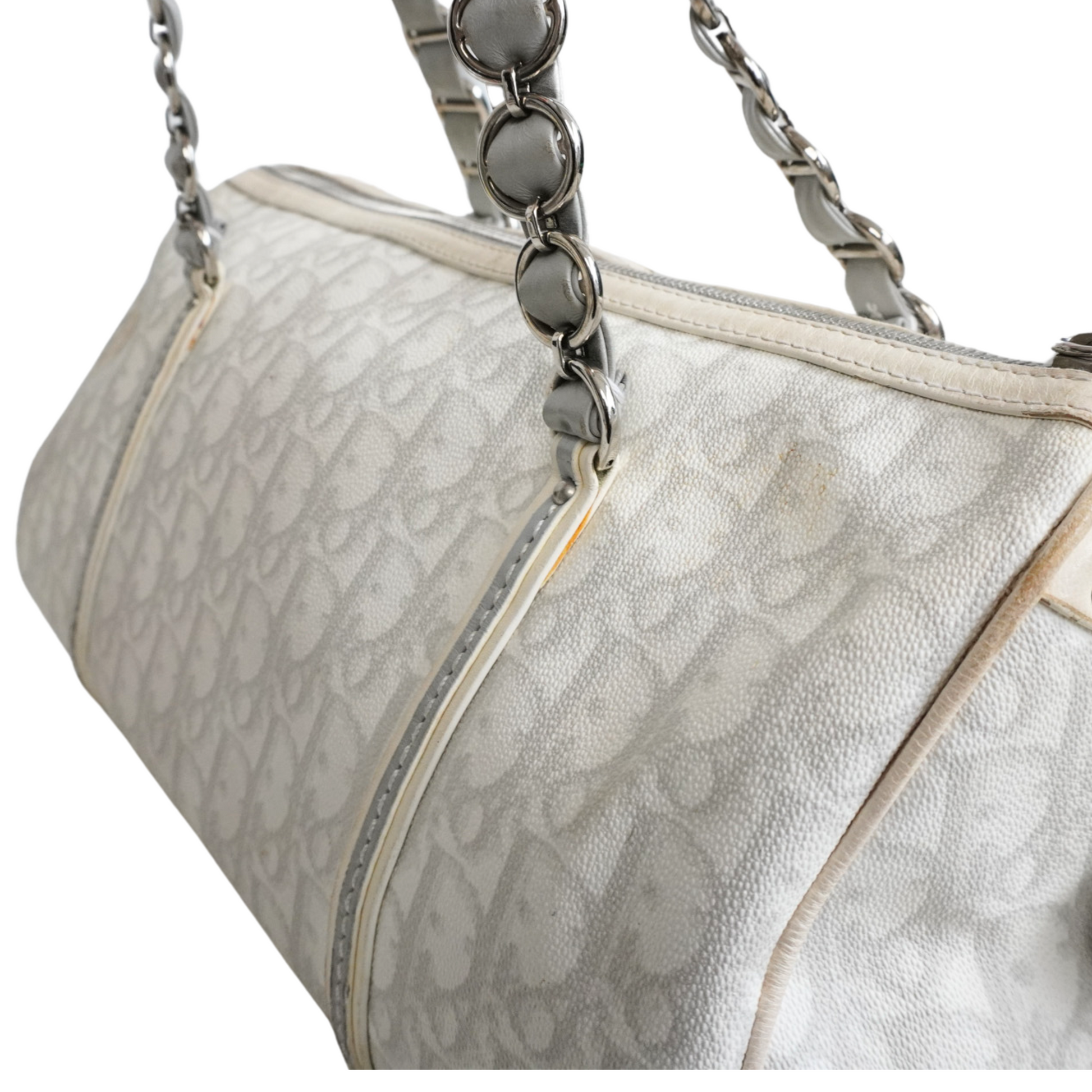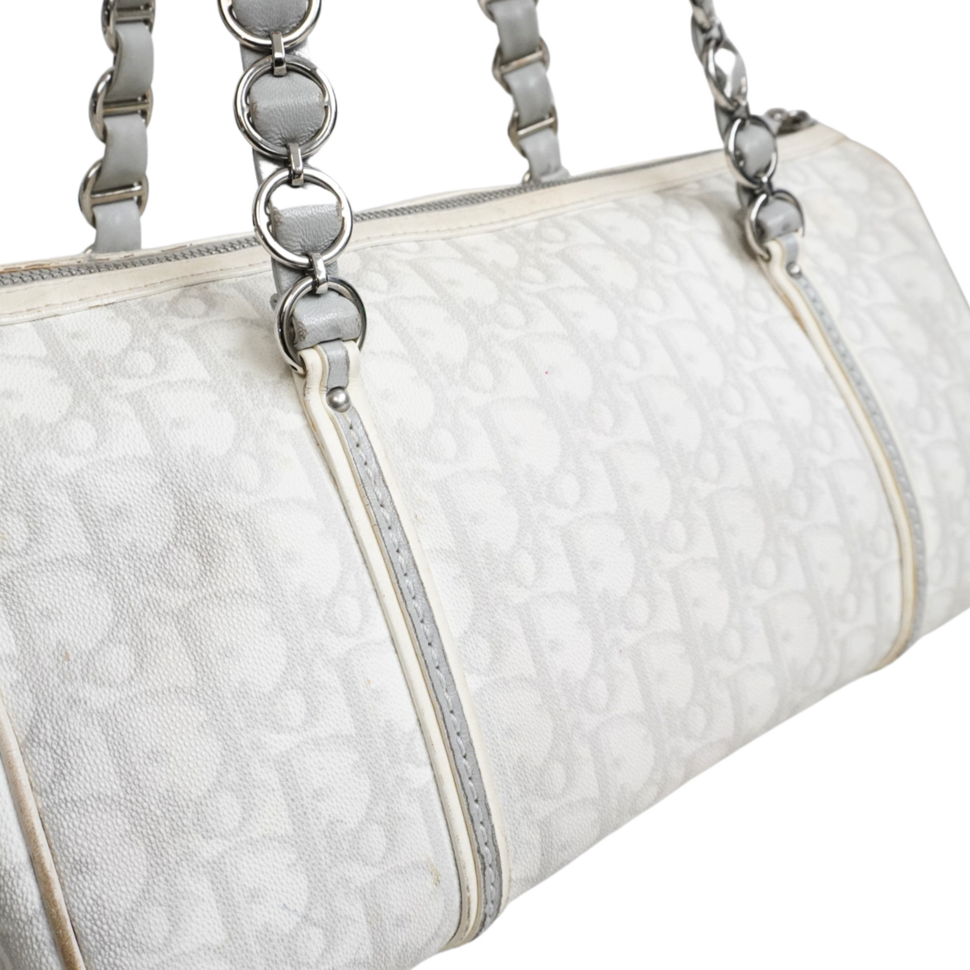 Christian Dior 'Romantique' boston bag in white and grey oblique monogram printed coated canvas with white and grey leather trim, dual chain shoulder straps with leather interweaving, and a top zip opening in silver hardware revealing a grey satin inner lining with a zip pocket.