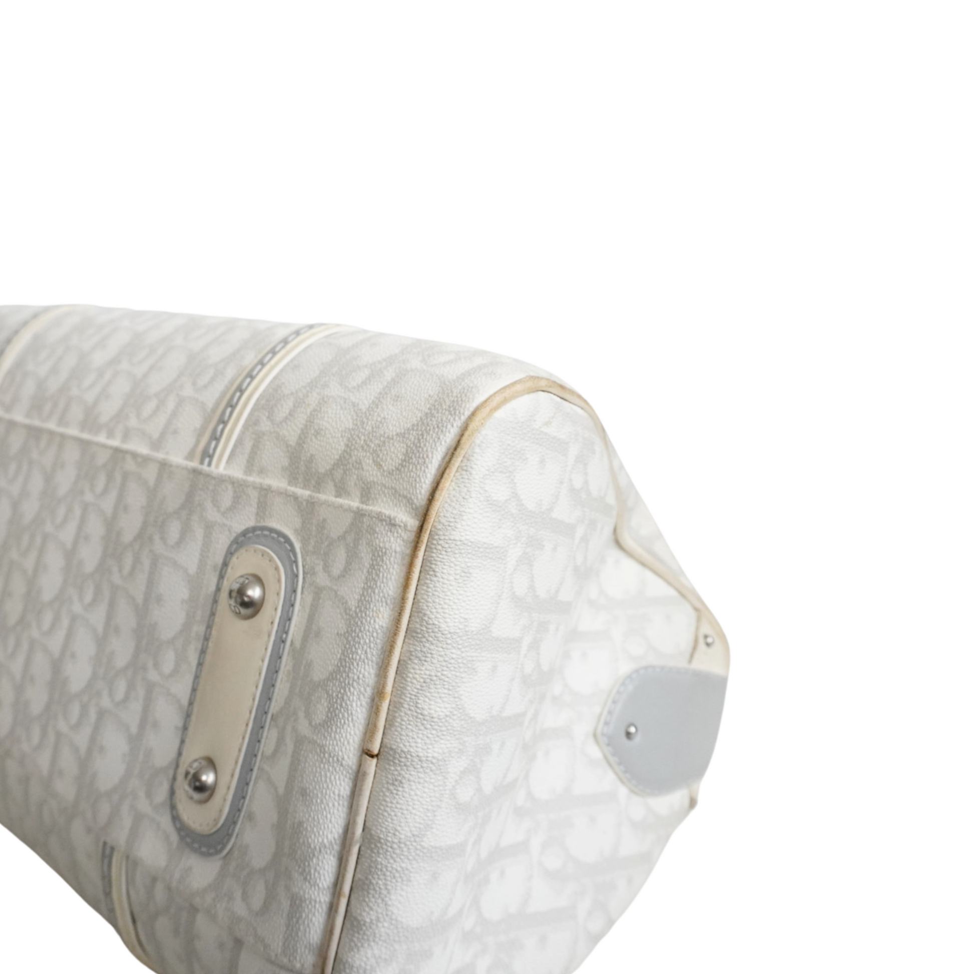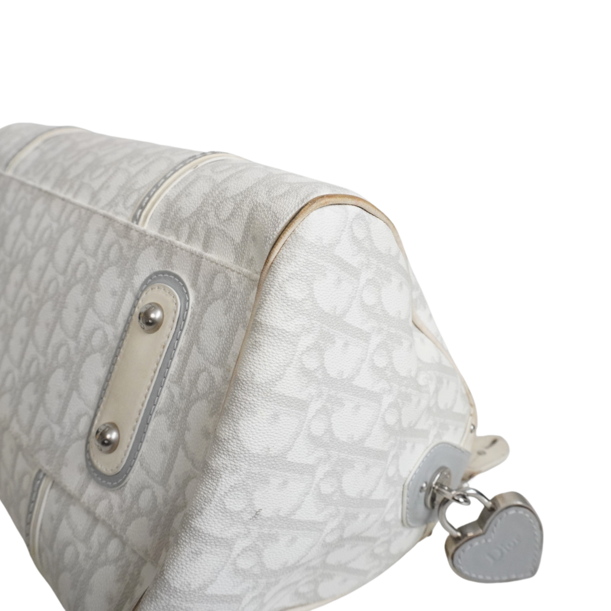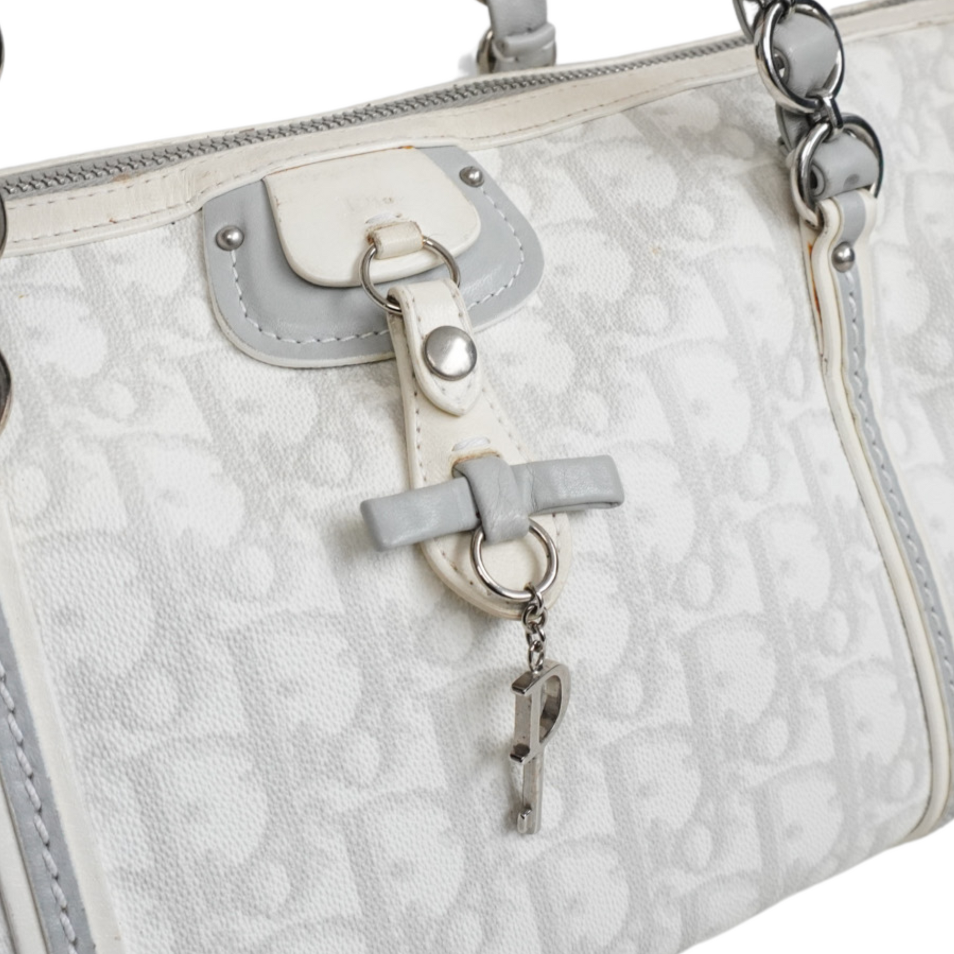 Christian Dior 'Romantique' boston bag in white and grey oblique monogram printed coated canvas with white and grey leather trim, dual chain shoulder straps with leather interweaving, and a top zip opening in silver hardware revealing a grey satin inner lining with a zip pocket.