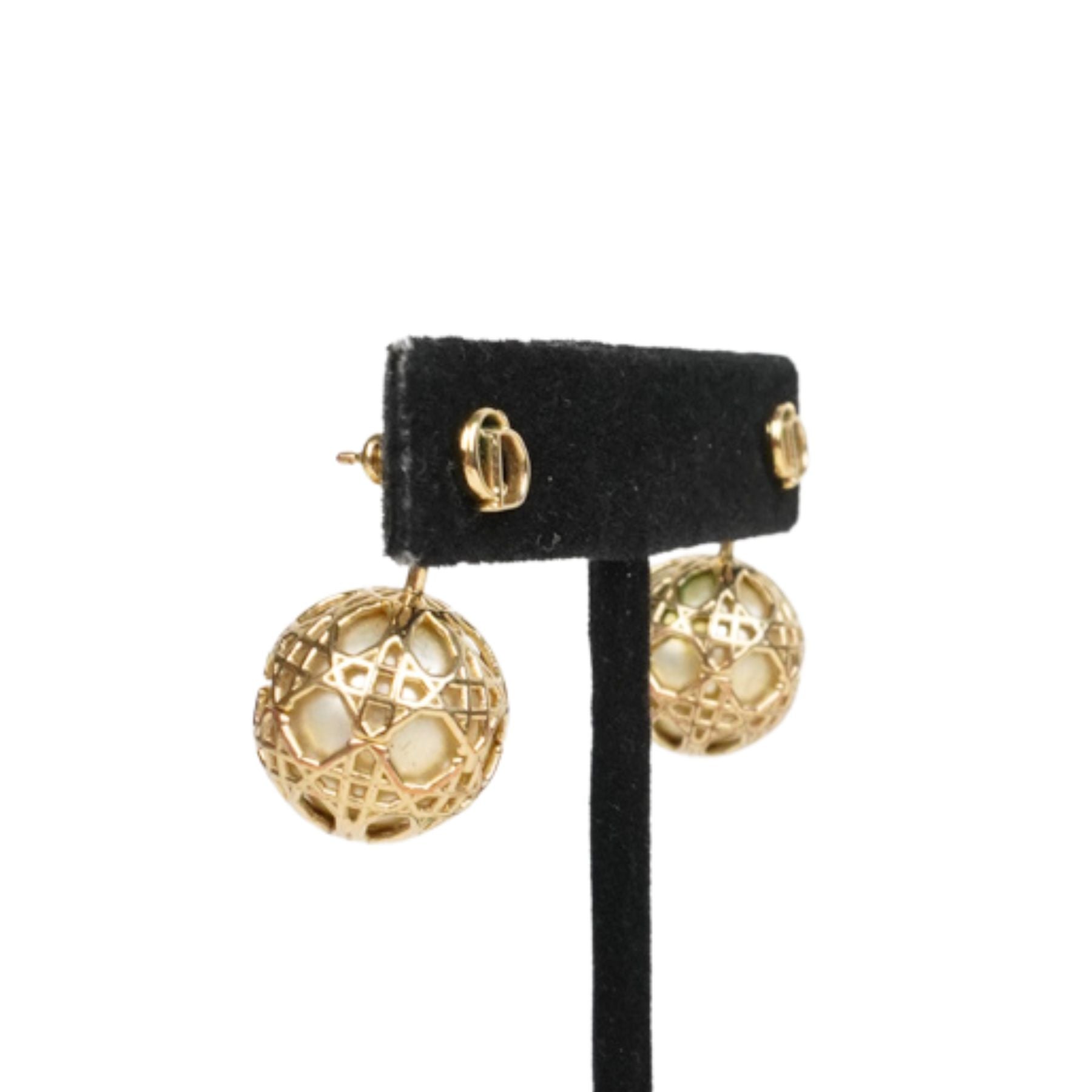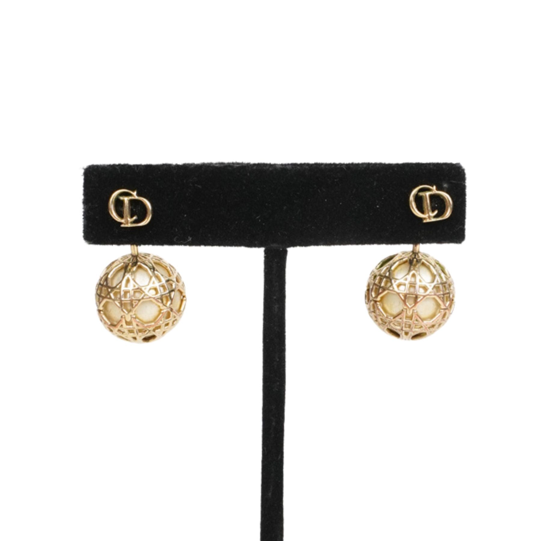 Christian Dior 'Secret Cannage Tribales' stud earrings in gold hardware. Features a large pearl encased in a gold cutout cage and logo on the front.