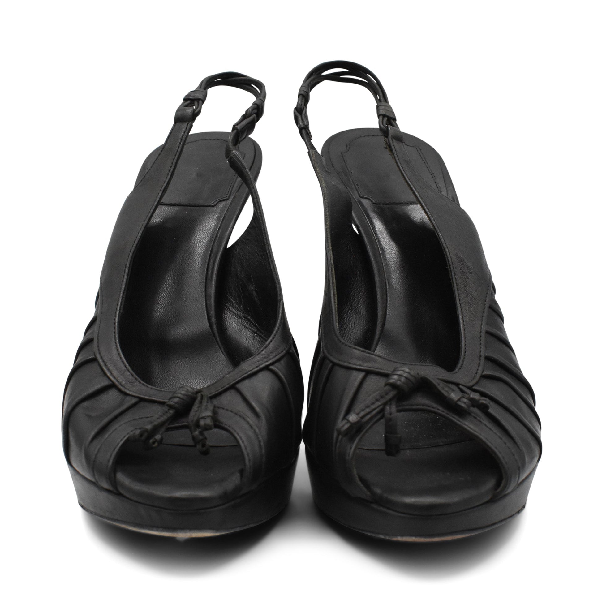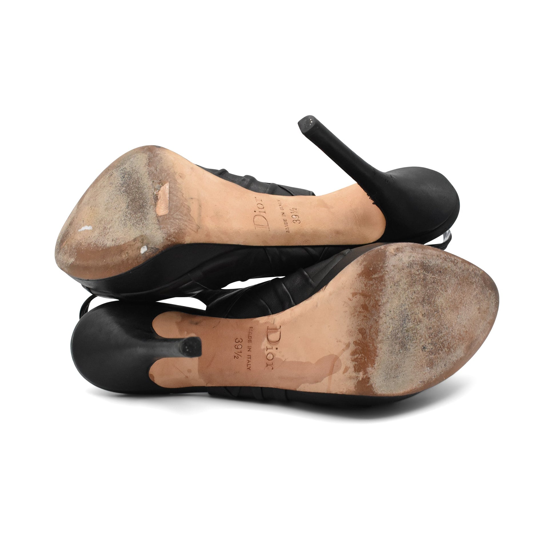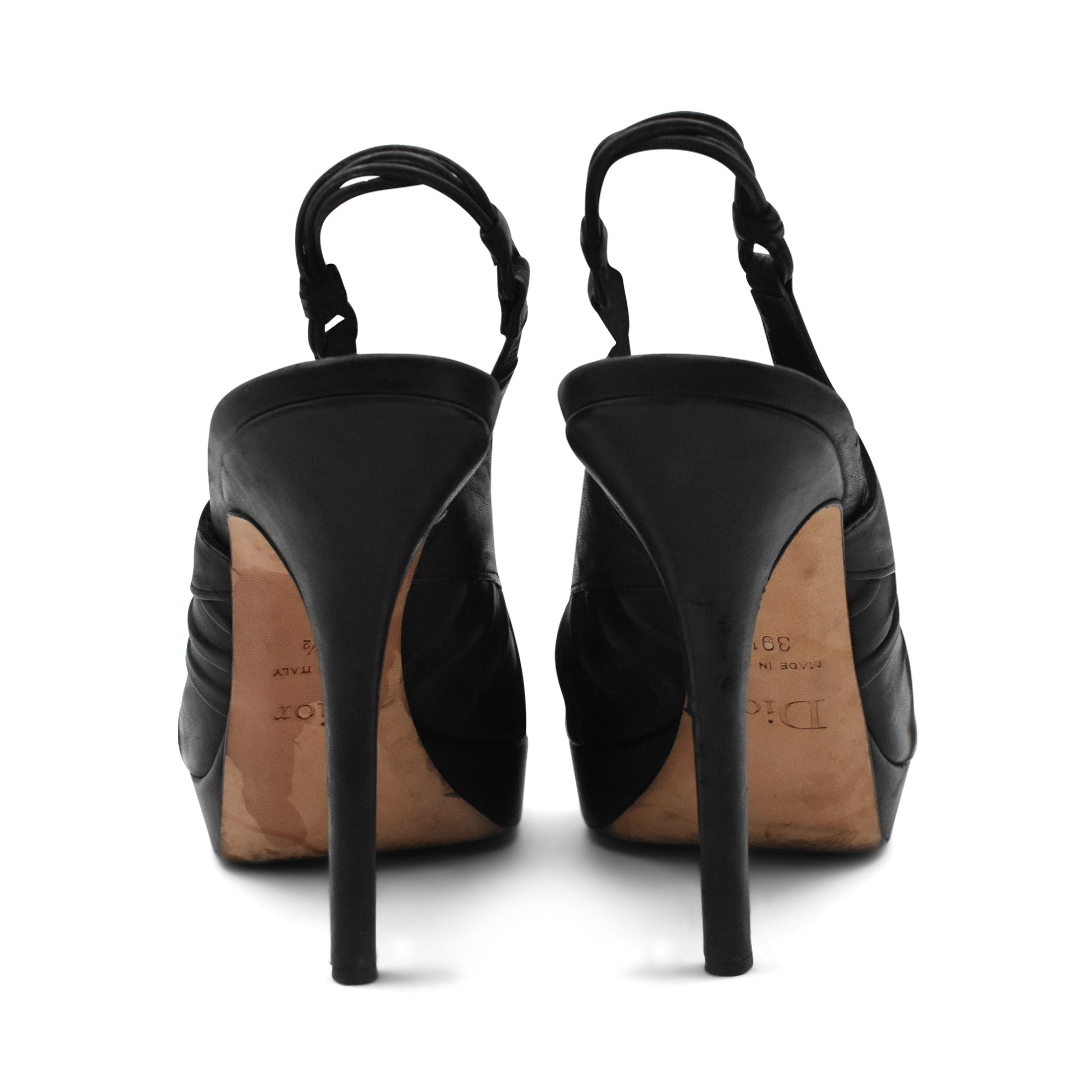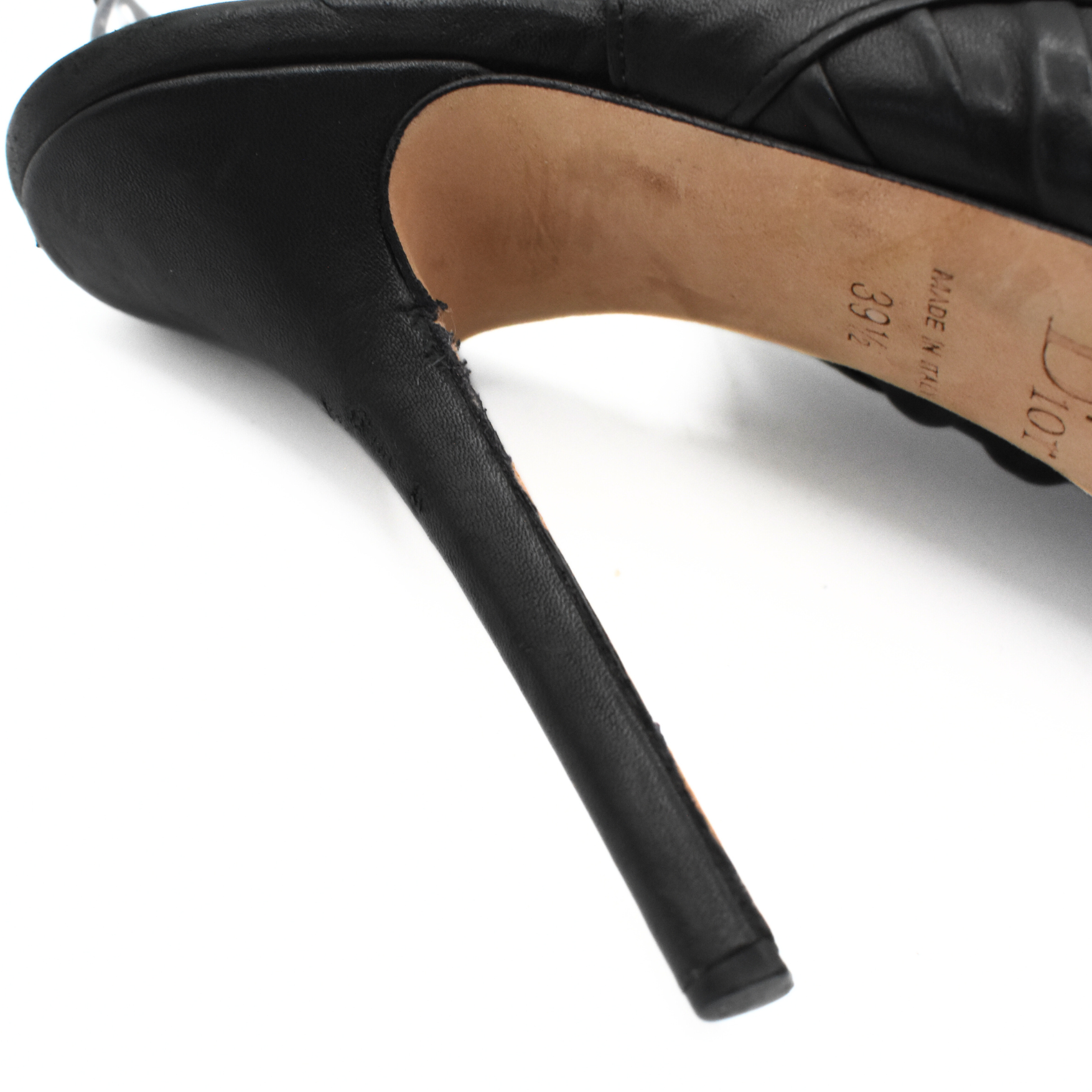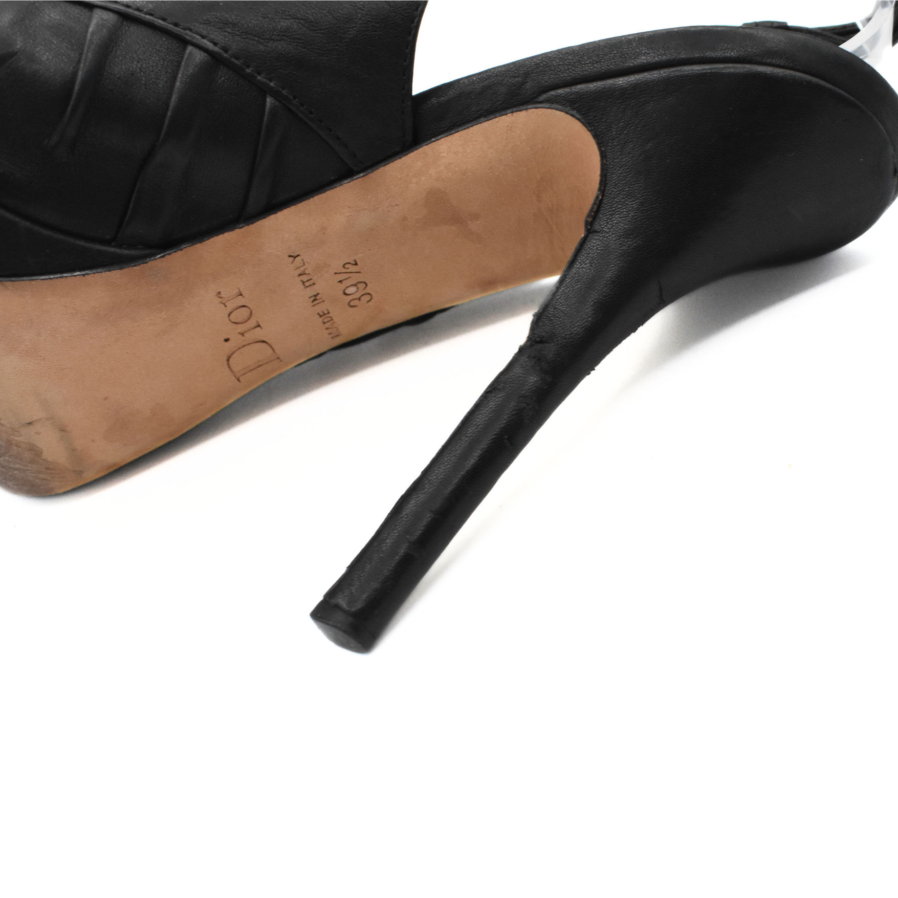 Christian Dior peep-toe platform heels in black leather with a slingback strap. Features pleated leather, stiletto heels, and a small leather bow at the toe.