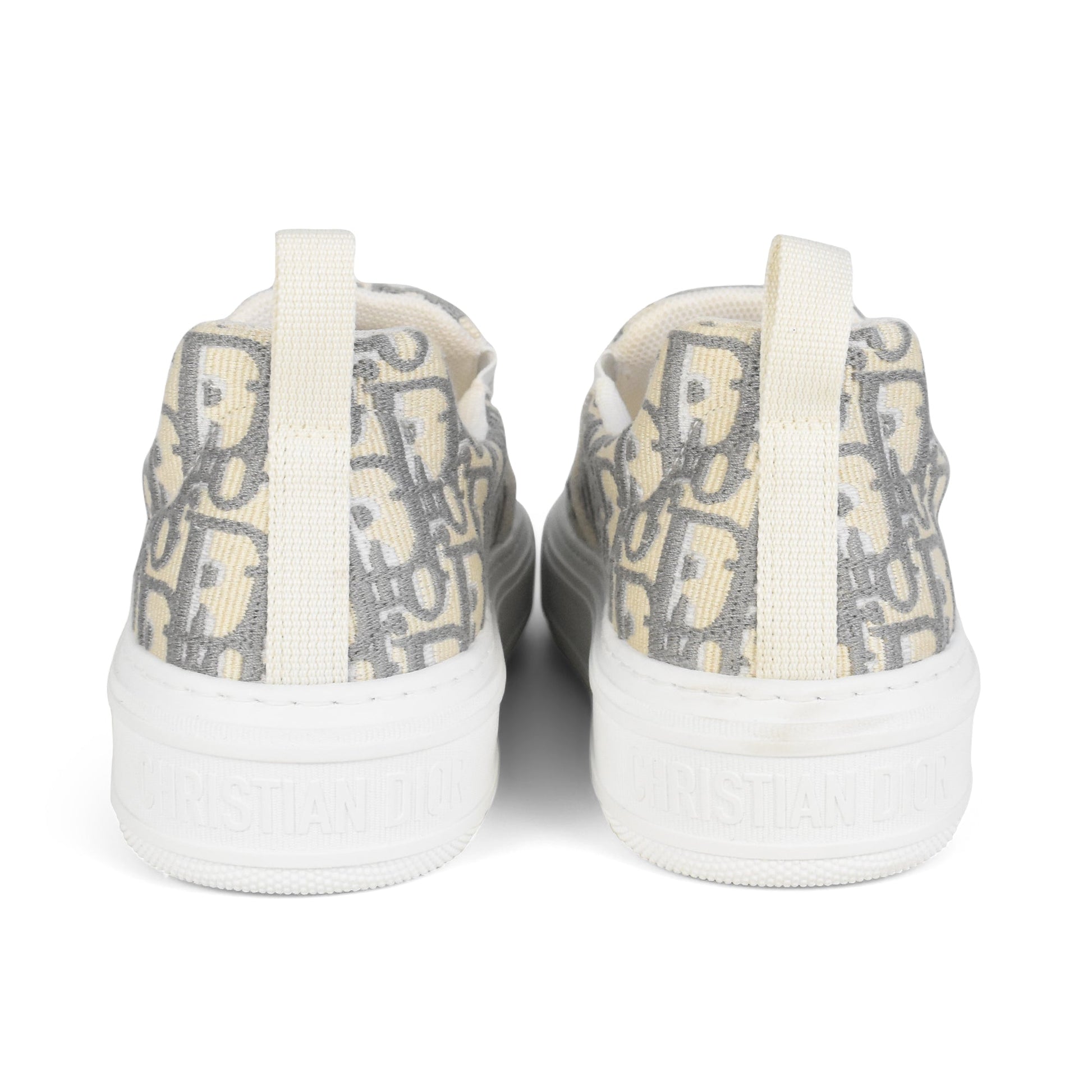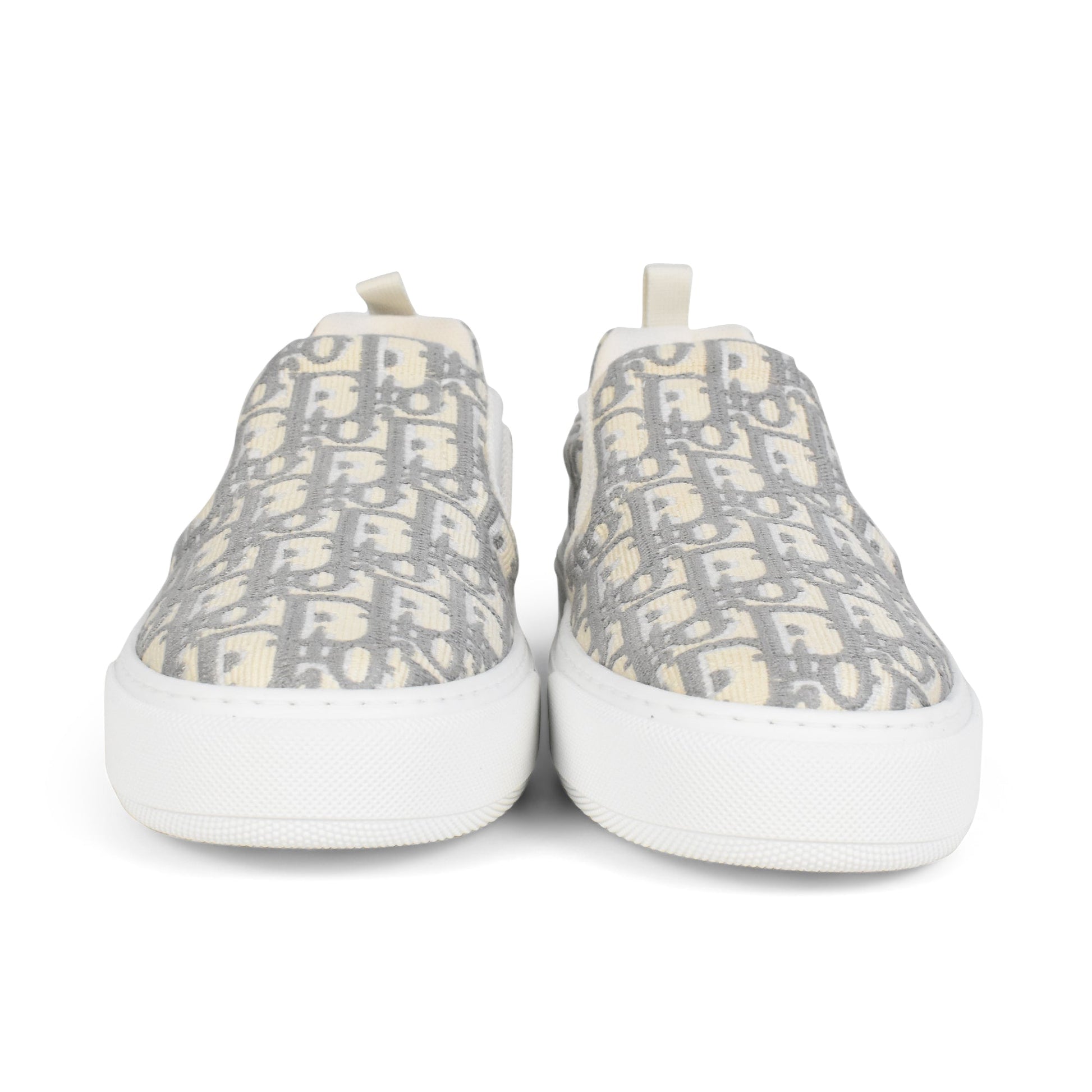 Christian Dior slip-on low-top sneakers in cream and grey with white chunky rubber soles. Features embroidered monogram oblique pattern with white mesh interior lining, engraved logo on the heel, and white heel pull-tab.