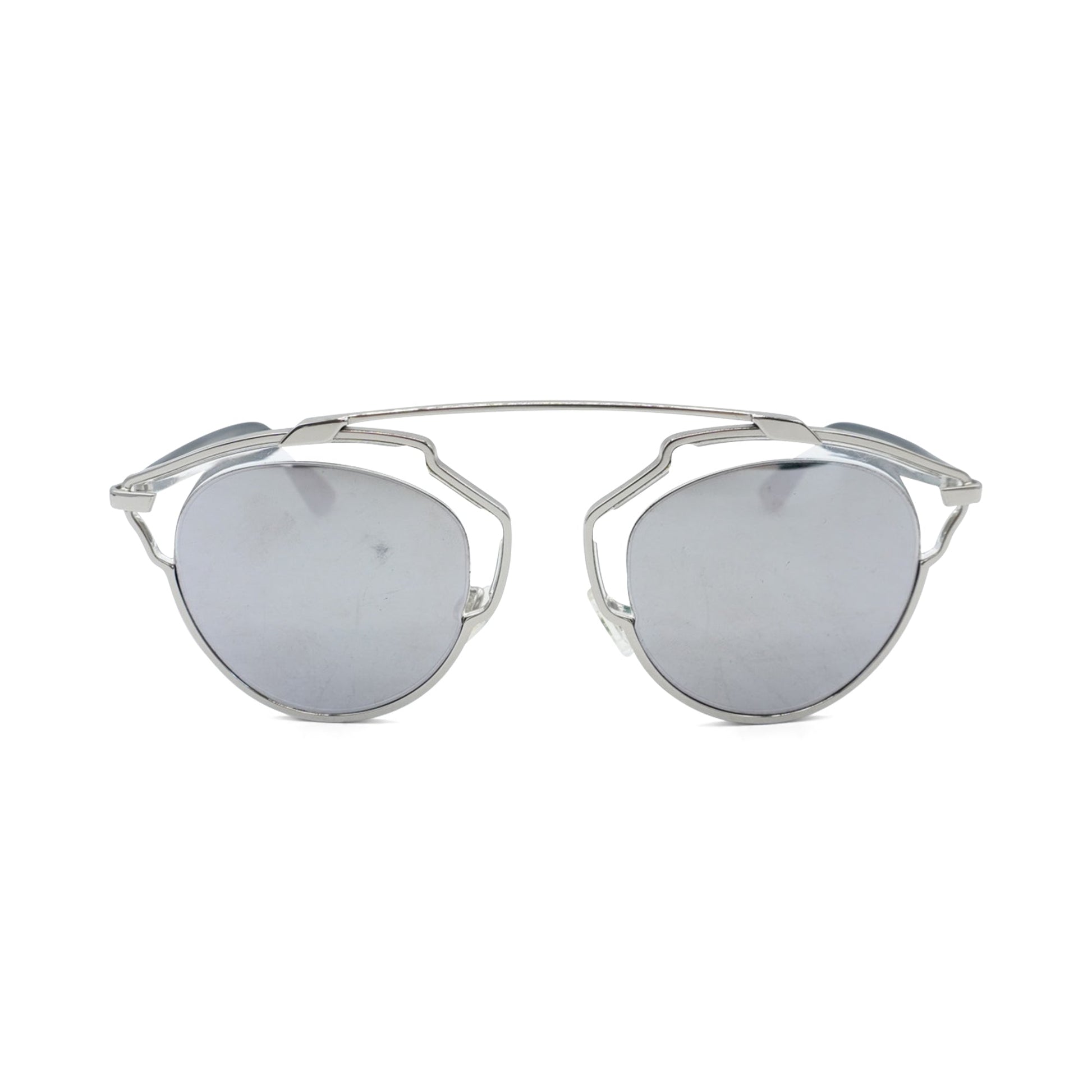 Christian Dior 'So Real' sunglasses in silver toned metal with a metallic reflective lens, metal brow trim, and black acetate arms.