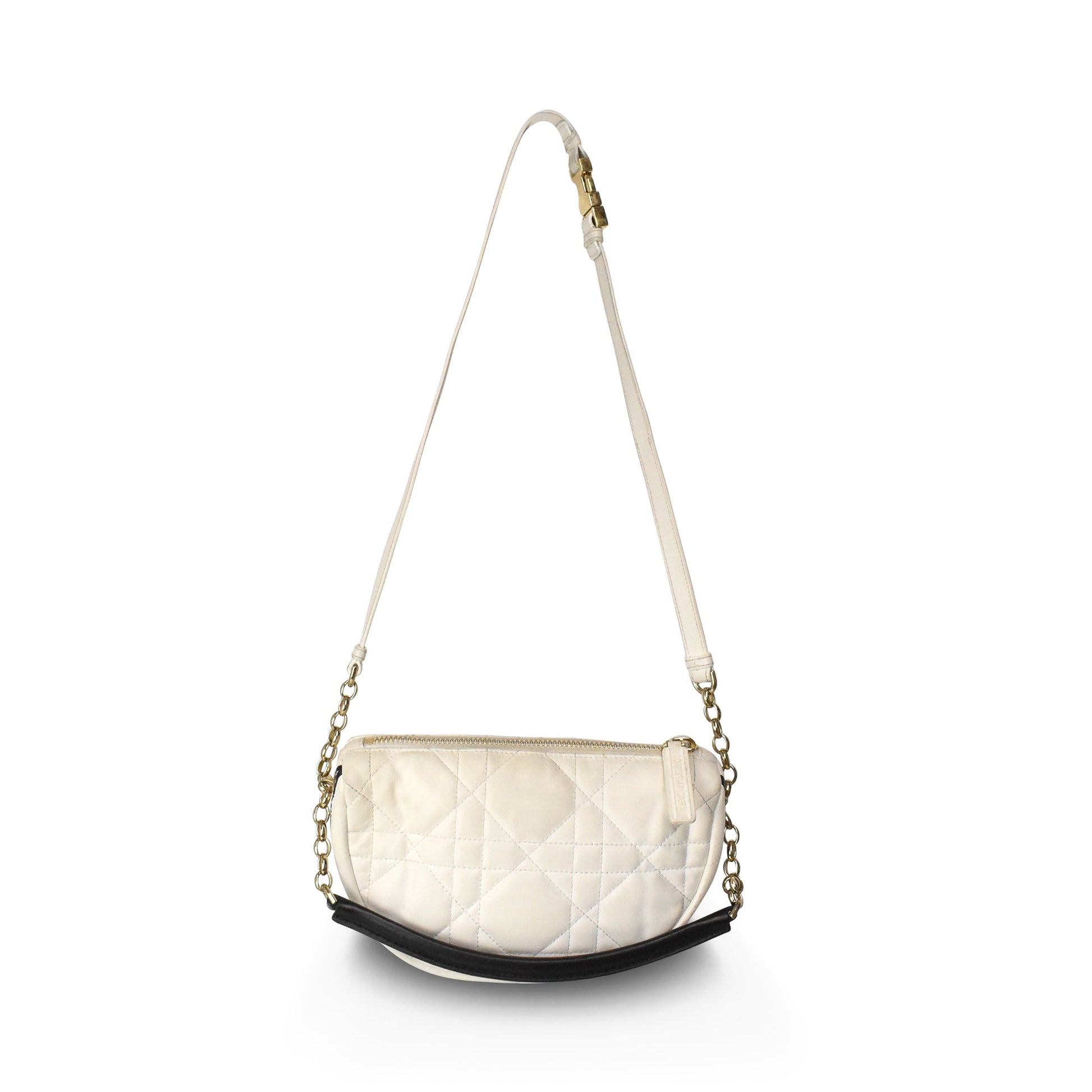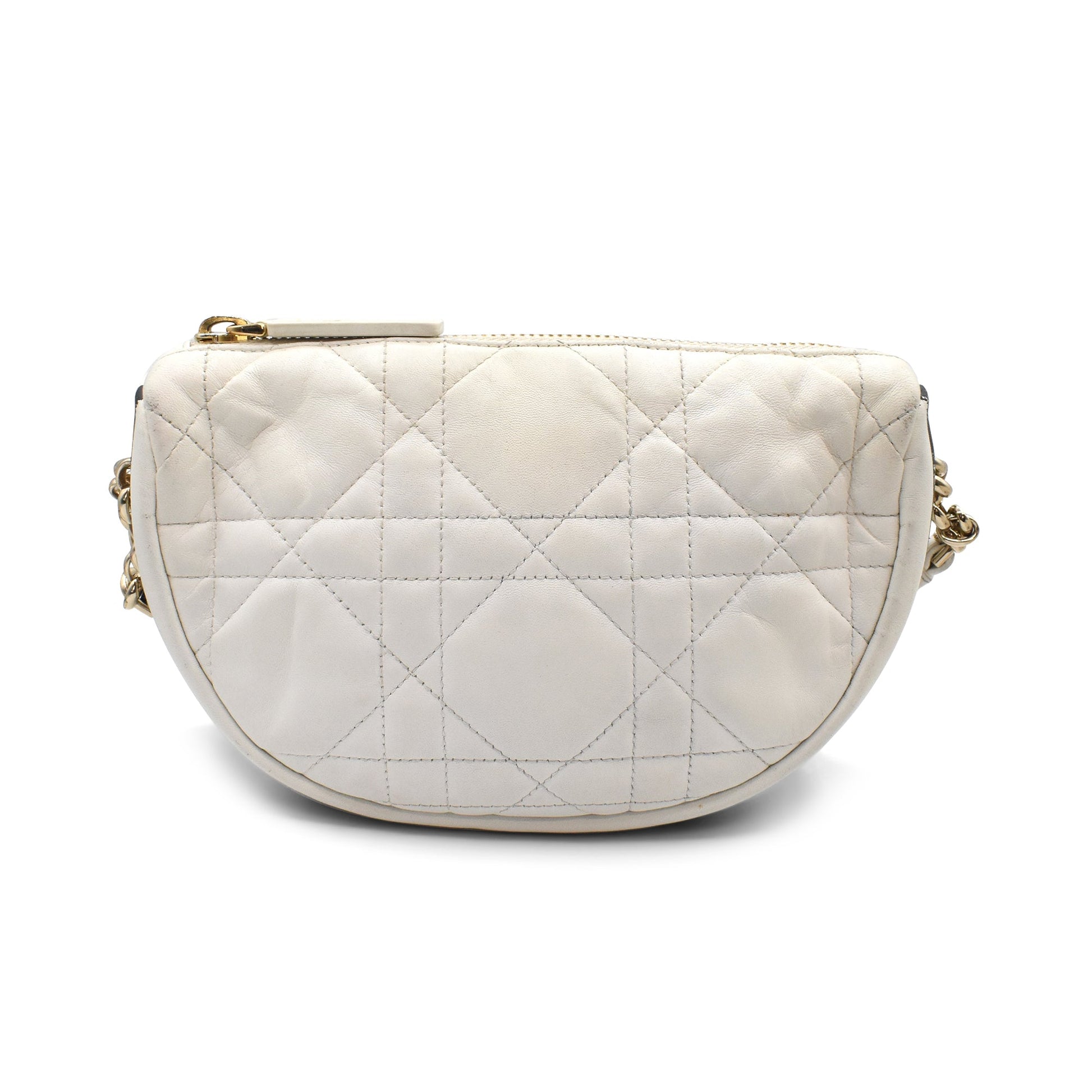 Christian Dior 'Vibe Small Hobo' shoulder bag in white cannage quilted leather. Features a navy blue leather top handle, a white leather with gold hardware chain and buckle shoulder strap, black logo along the bottom, and a top zip closure with a white rubber zipper pull. The interior is white suede lined with a card slot.