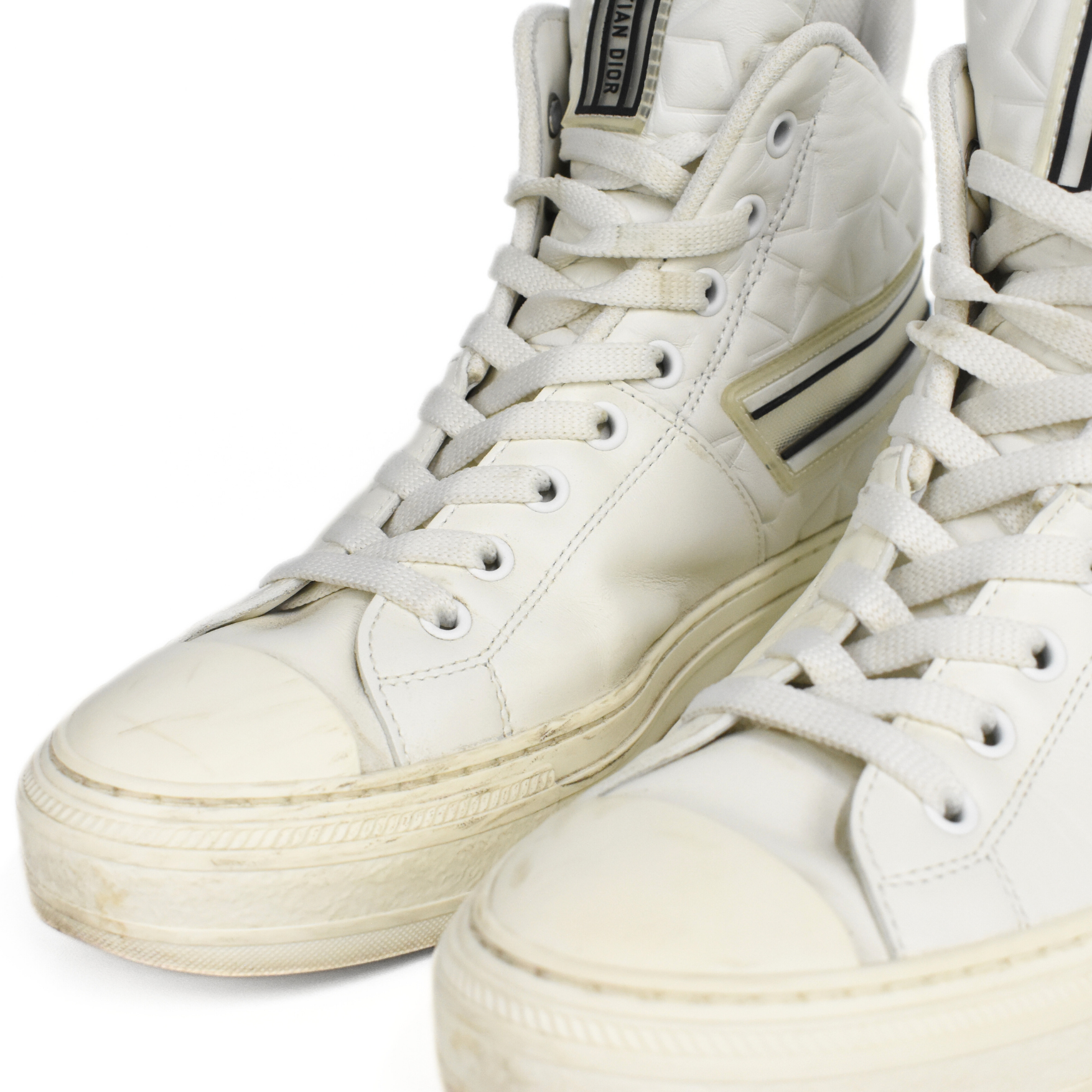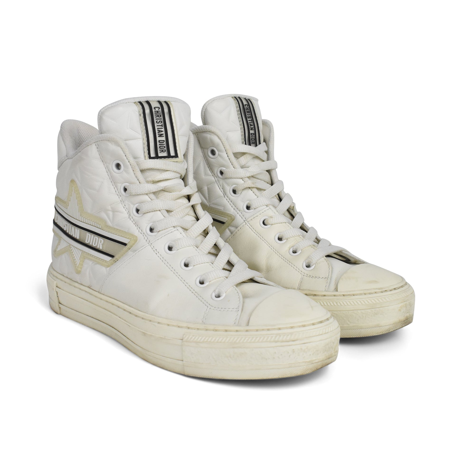 Christian Dior 'Walk'N'Dior Star' high-top sneakers in white leather and white rubber midsole. Features embossed stars in the leather, clear, white, and black logo on the sides and tongue, and white flat laces.