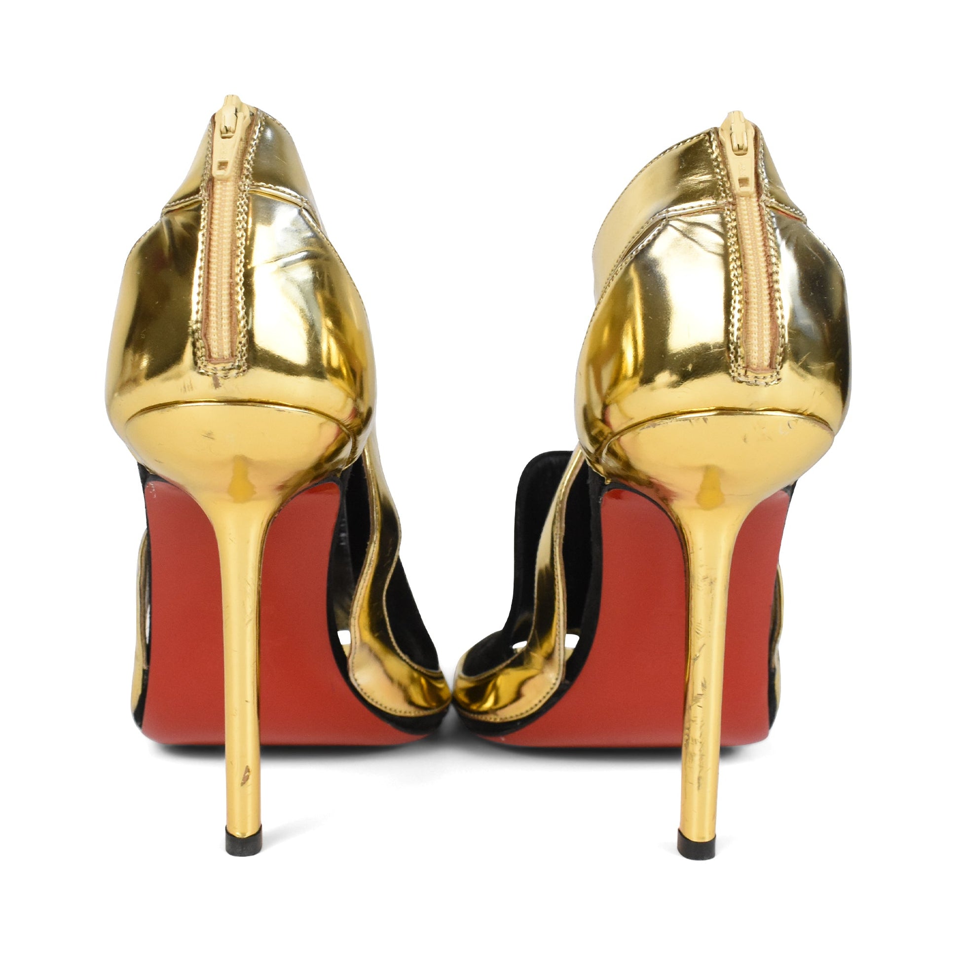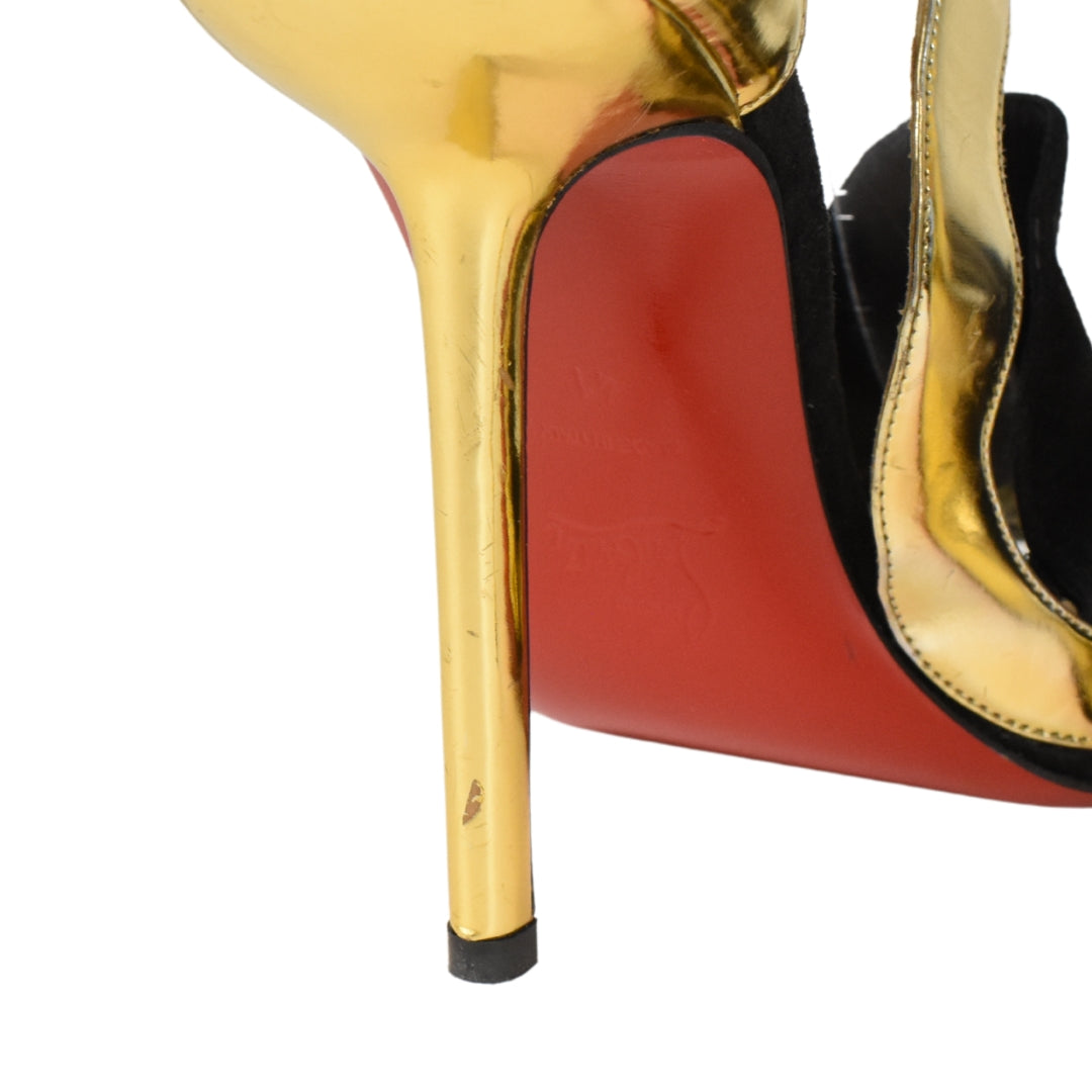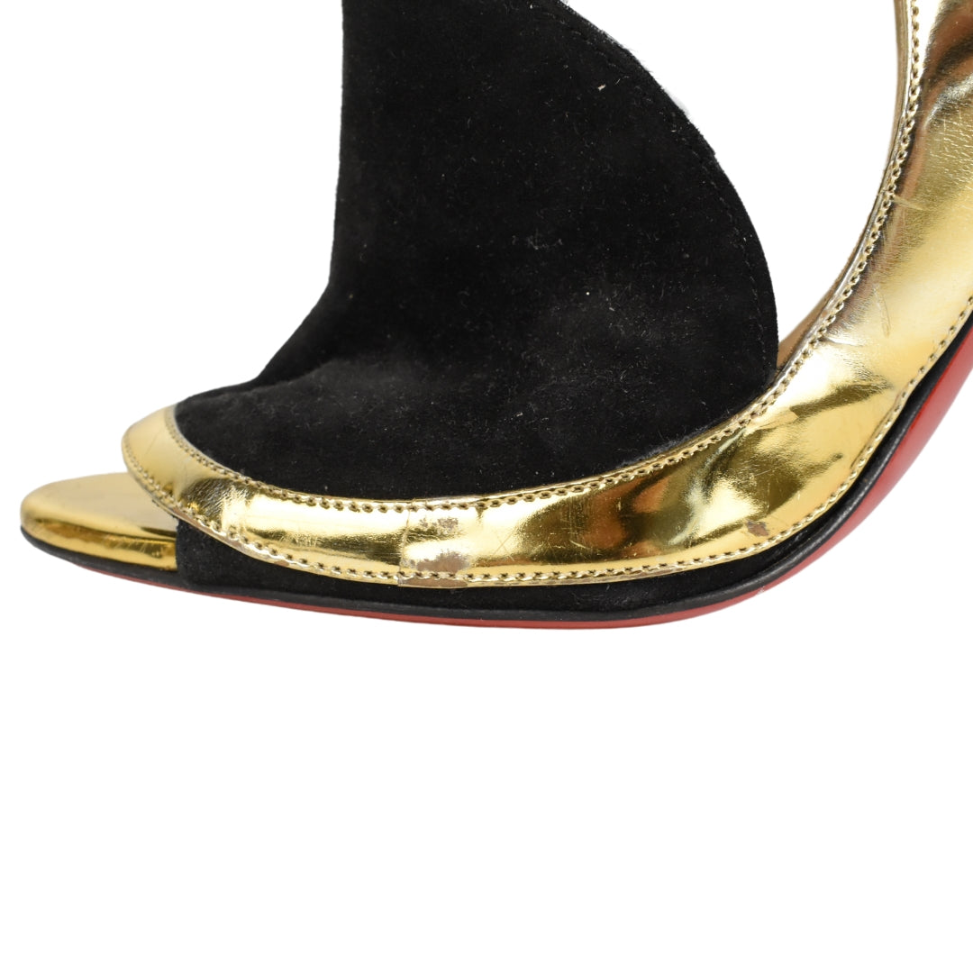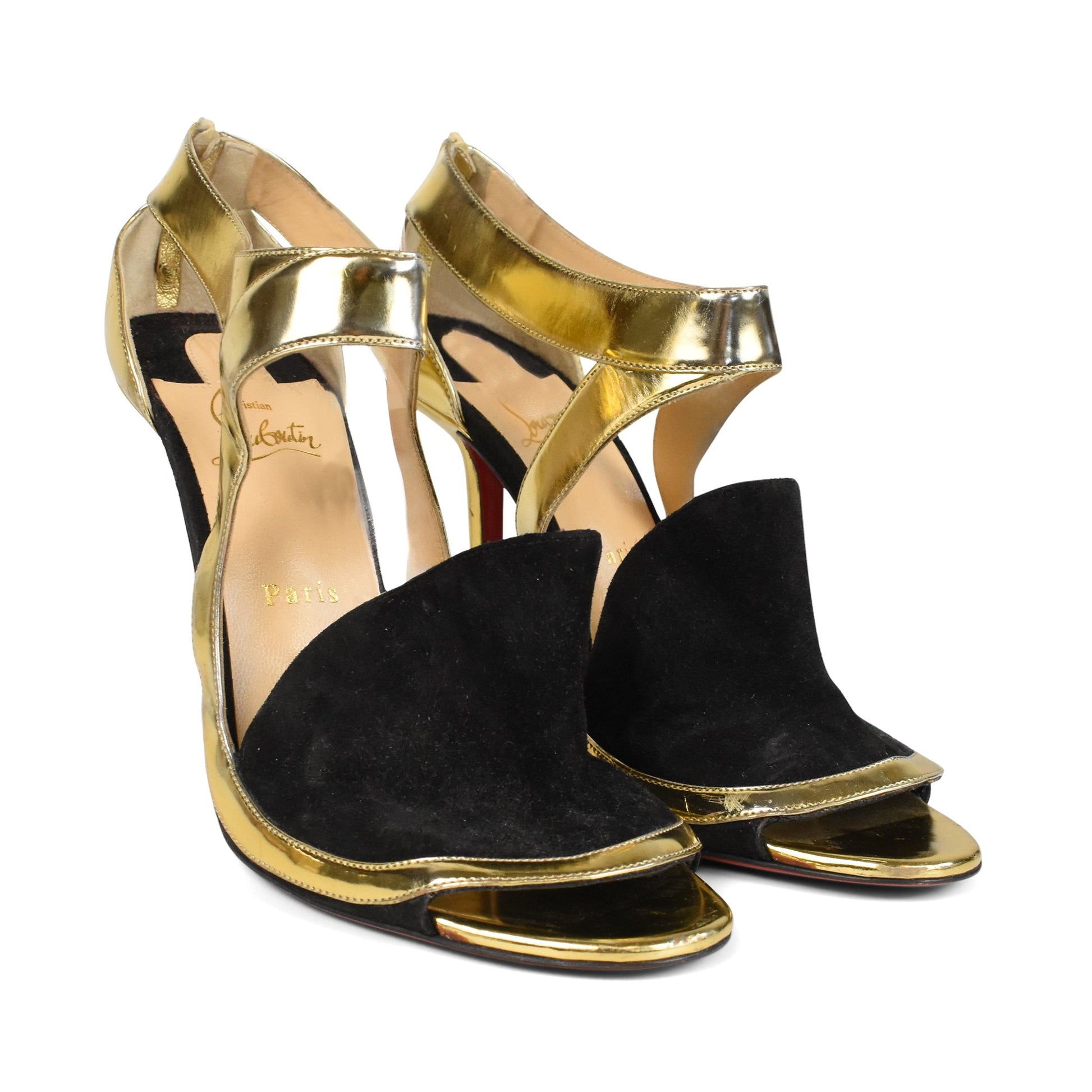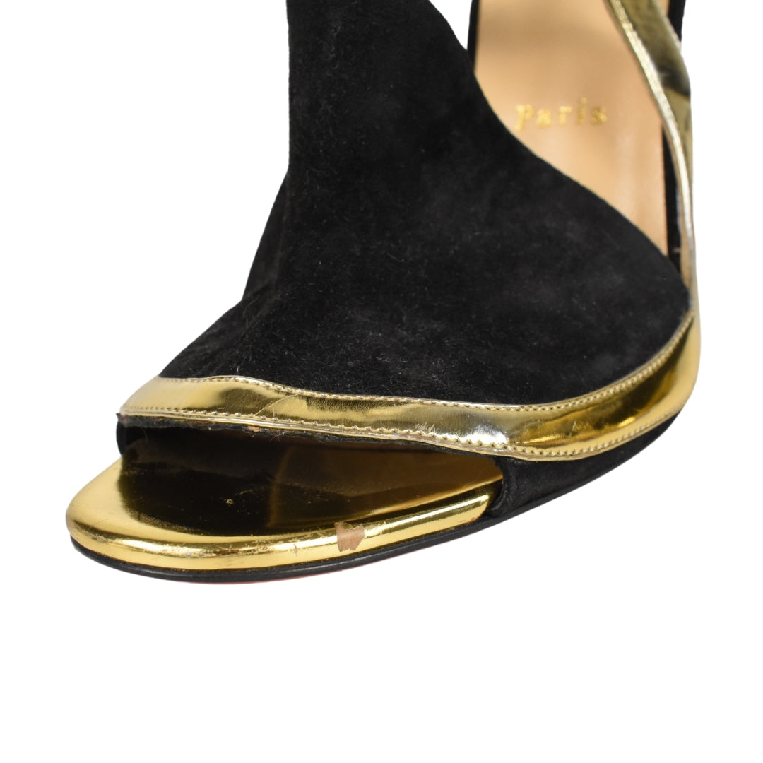 Christian Louboutin 'Phoebe' peep-toe heels in gold leather with black suede toe strap detail. Features cutouts on the sides, a stiletto heel, and a back zip closure.