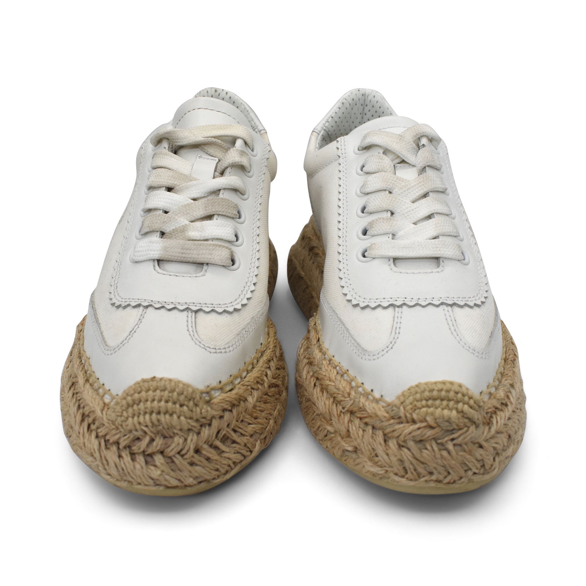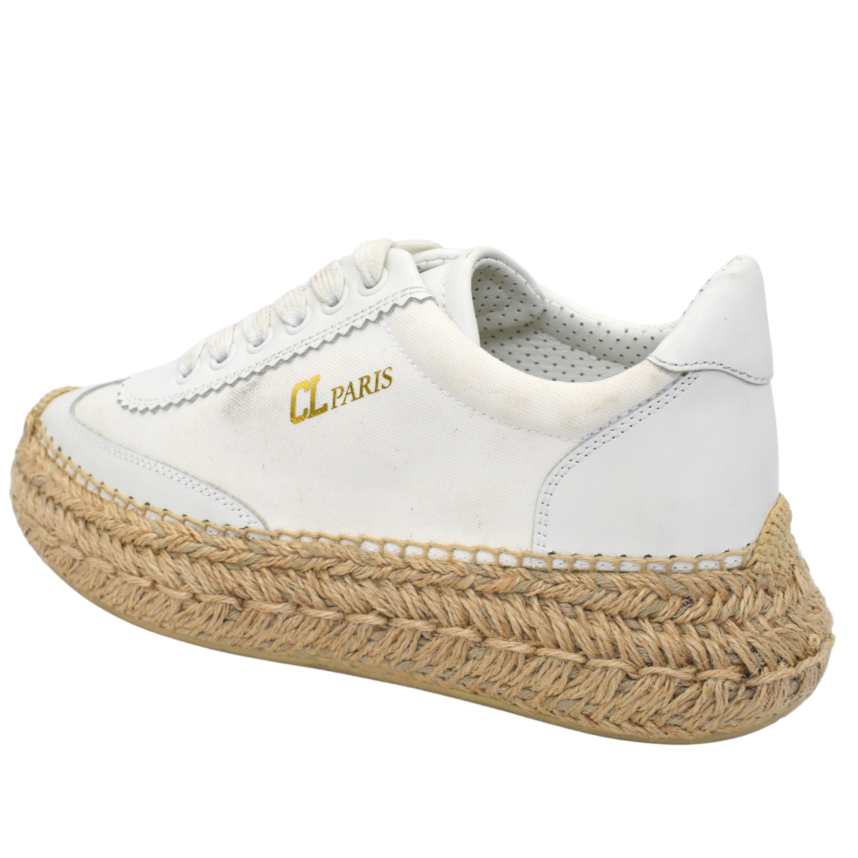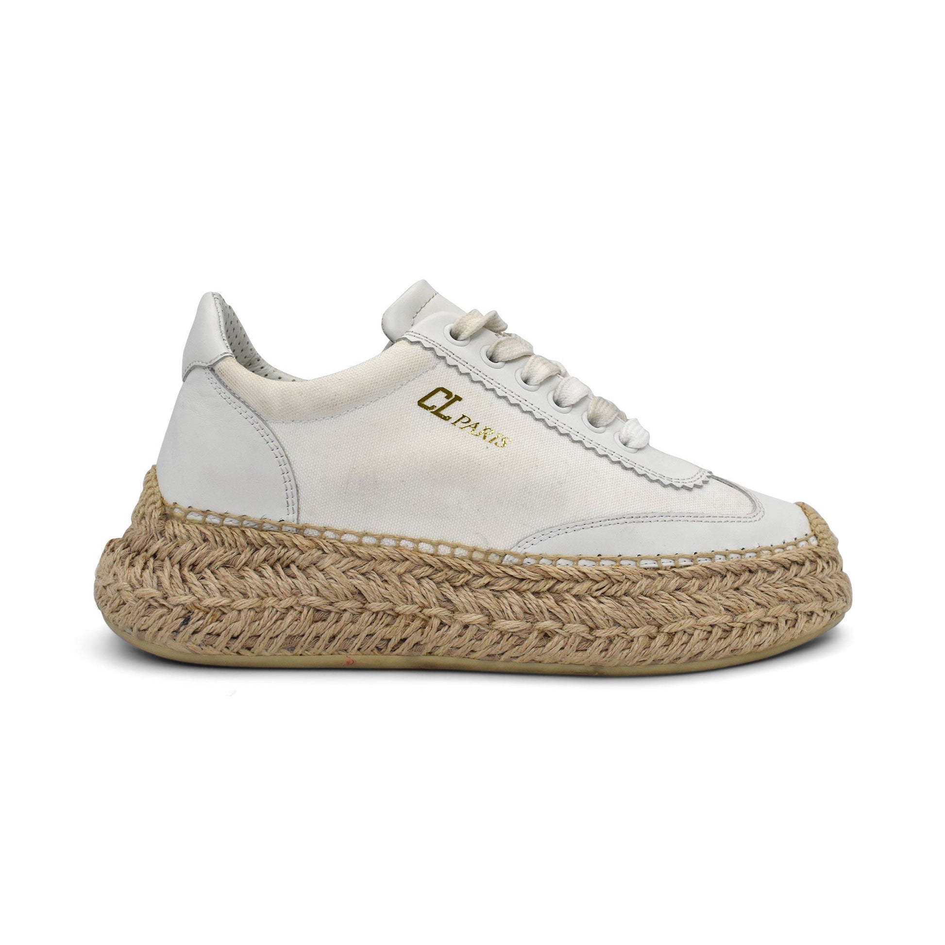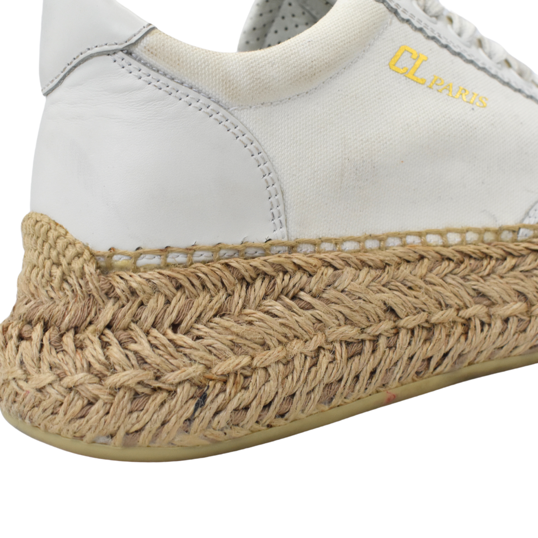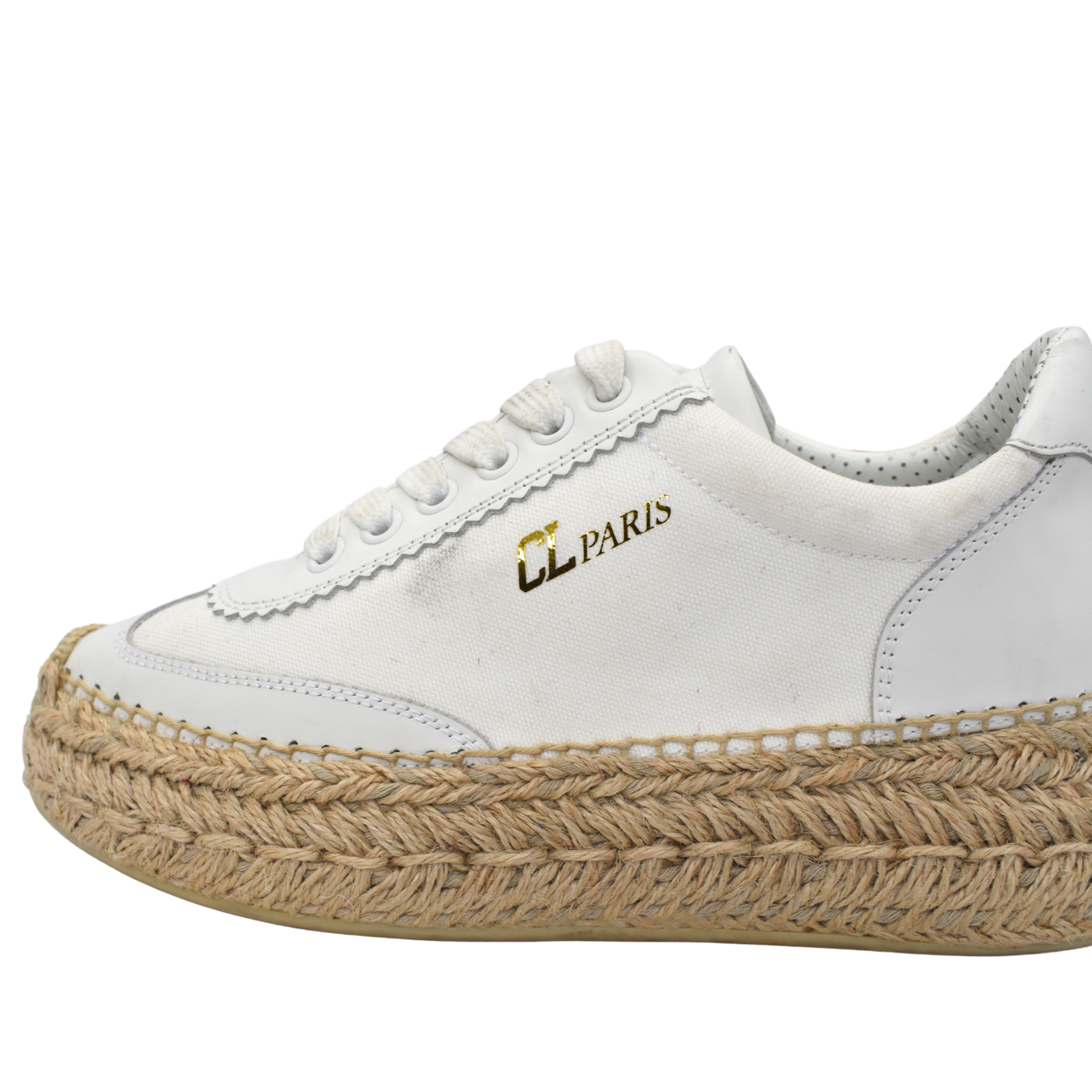 Christian Louboutin 'Espasneak' sneakers in white canvas with platform espadrille soles, leather trim, and a gold foil 'CL Paris' logo across the sides.