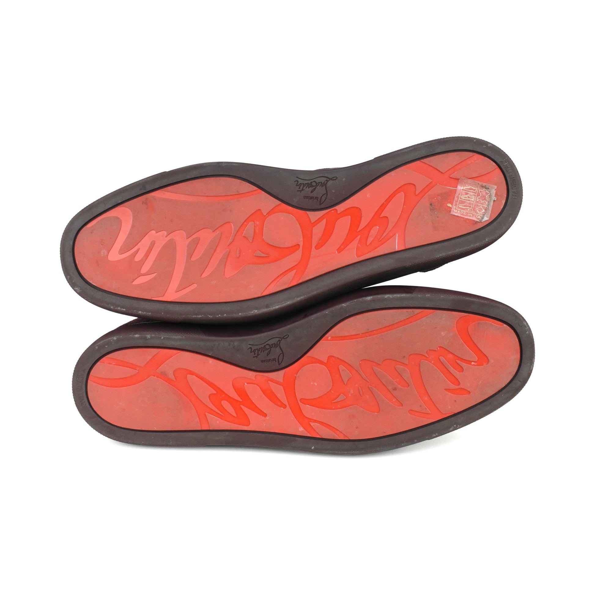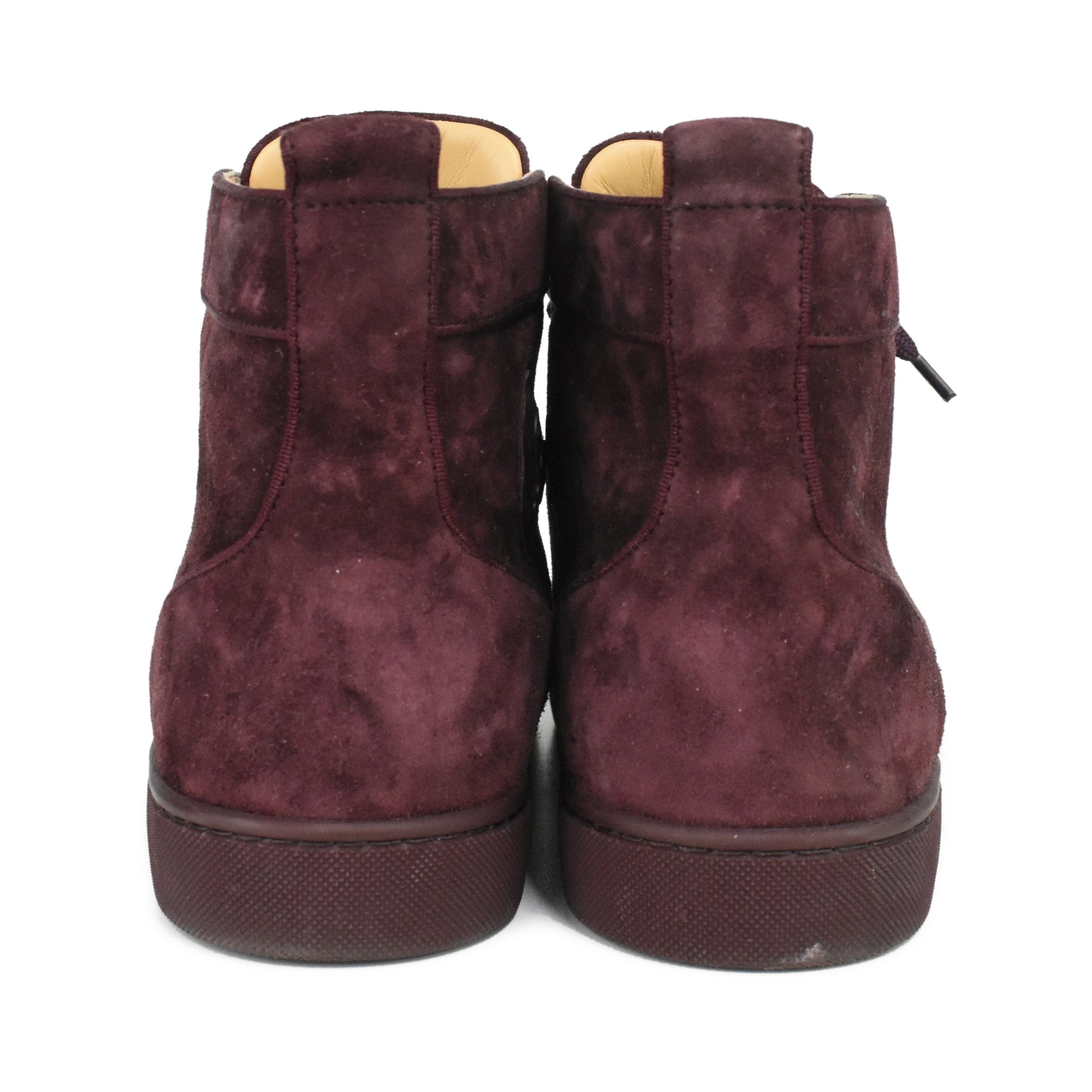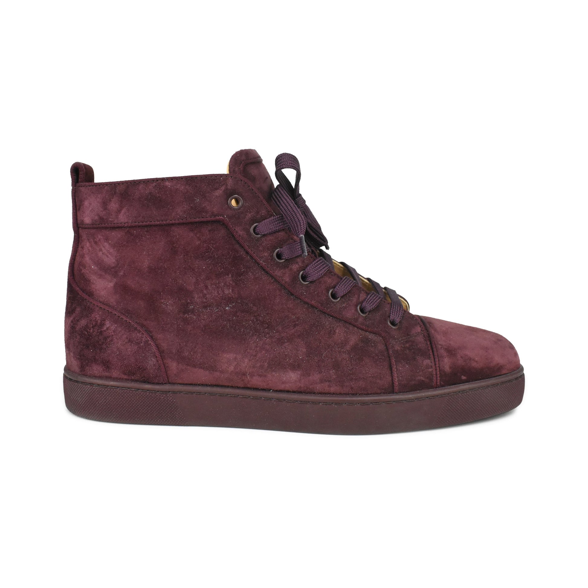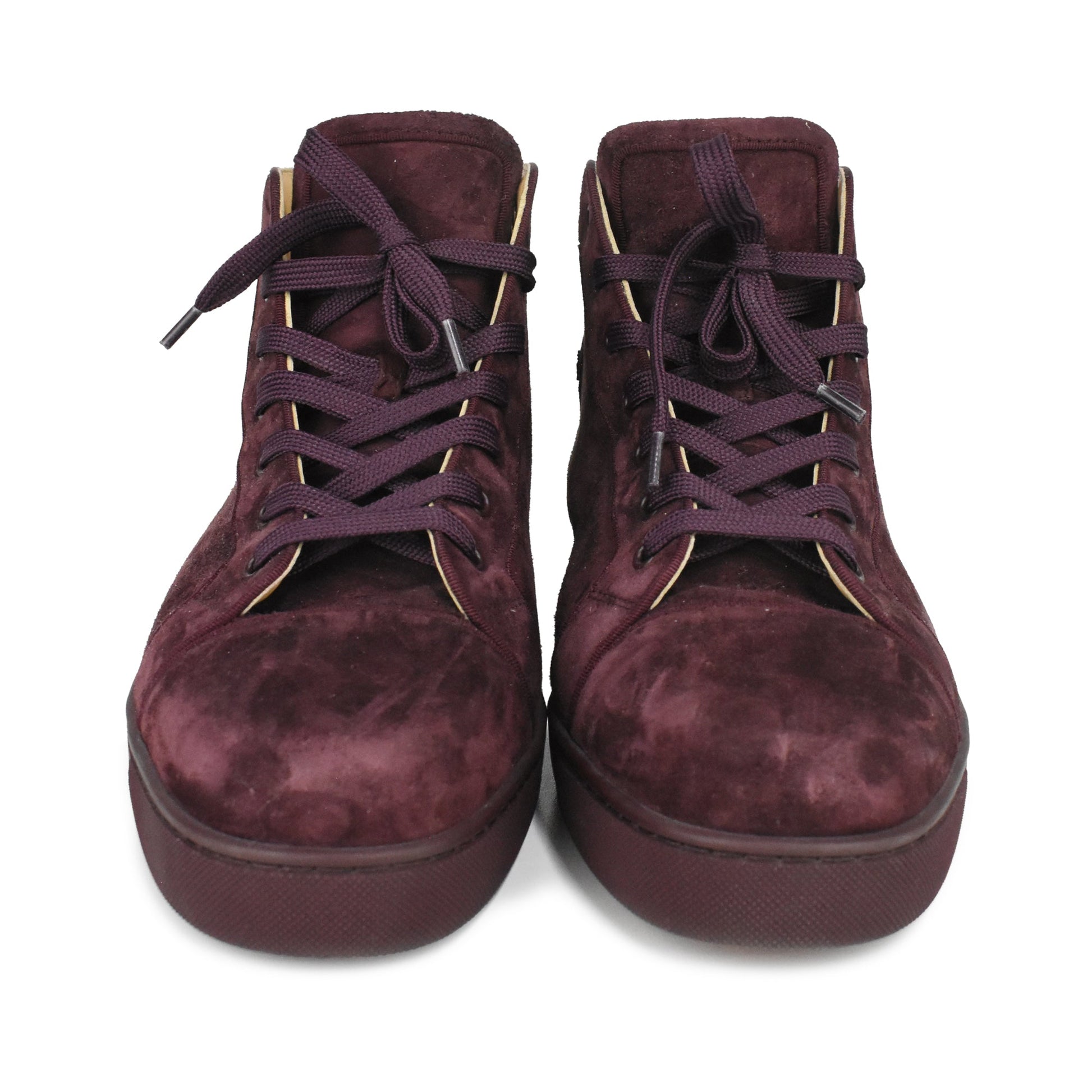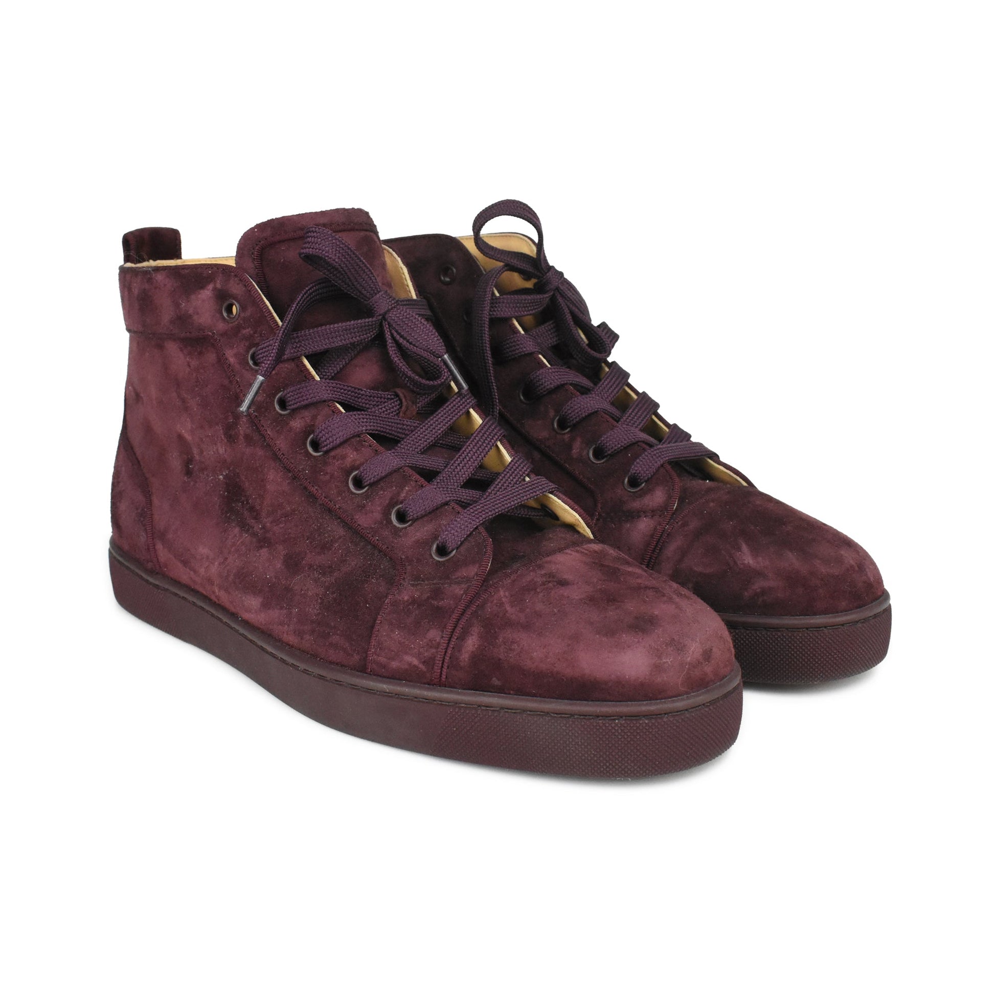 Christian Louboutin high-top sneakers in purple suede leather with purple flat laces, purple rubber sole, and logo hardware in purple on the inner sides.
