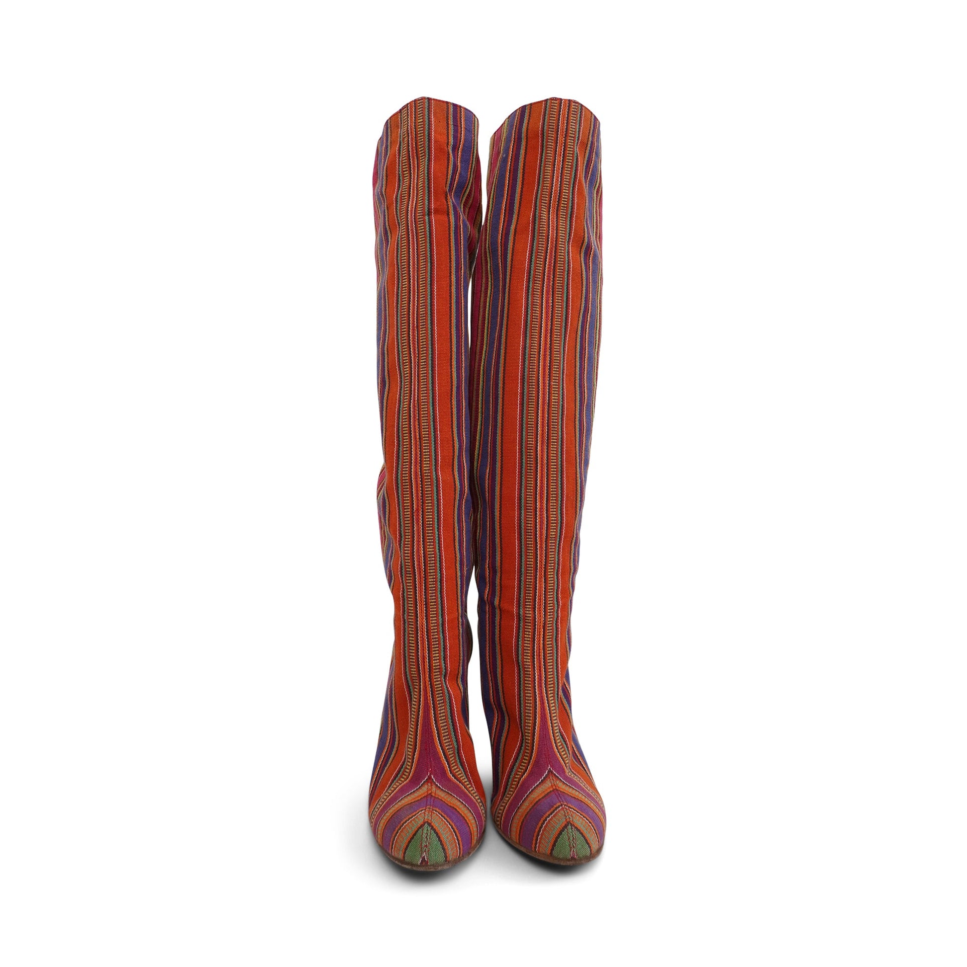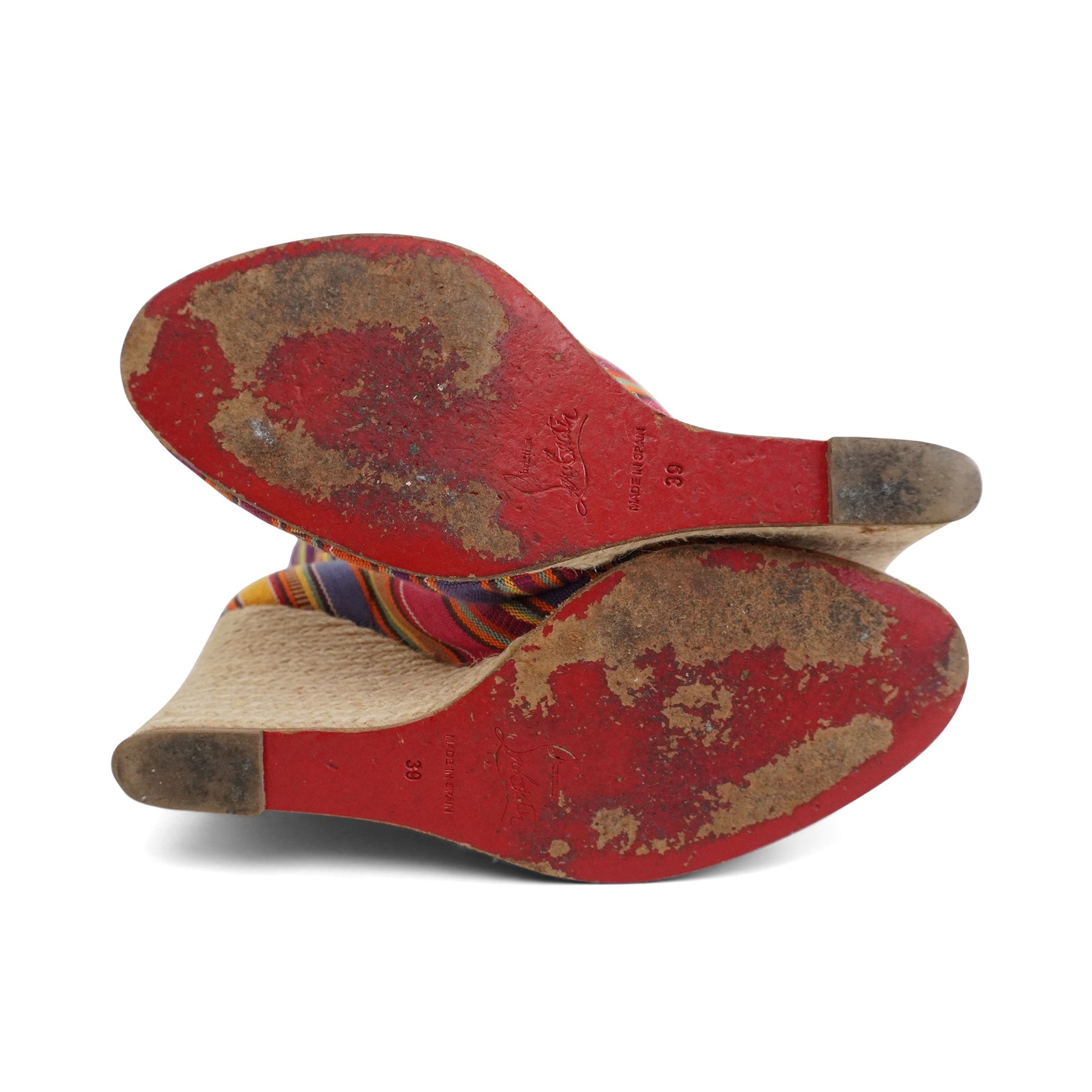Christian Louboutin 'Jessica' knee high boots in multicolour striped cotton canvas with braided twine espadrille wedge heels.