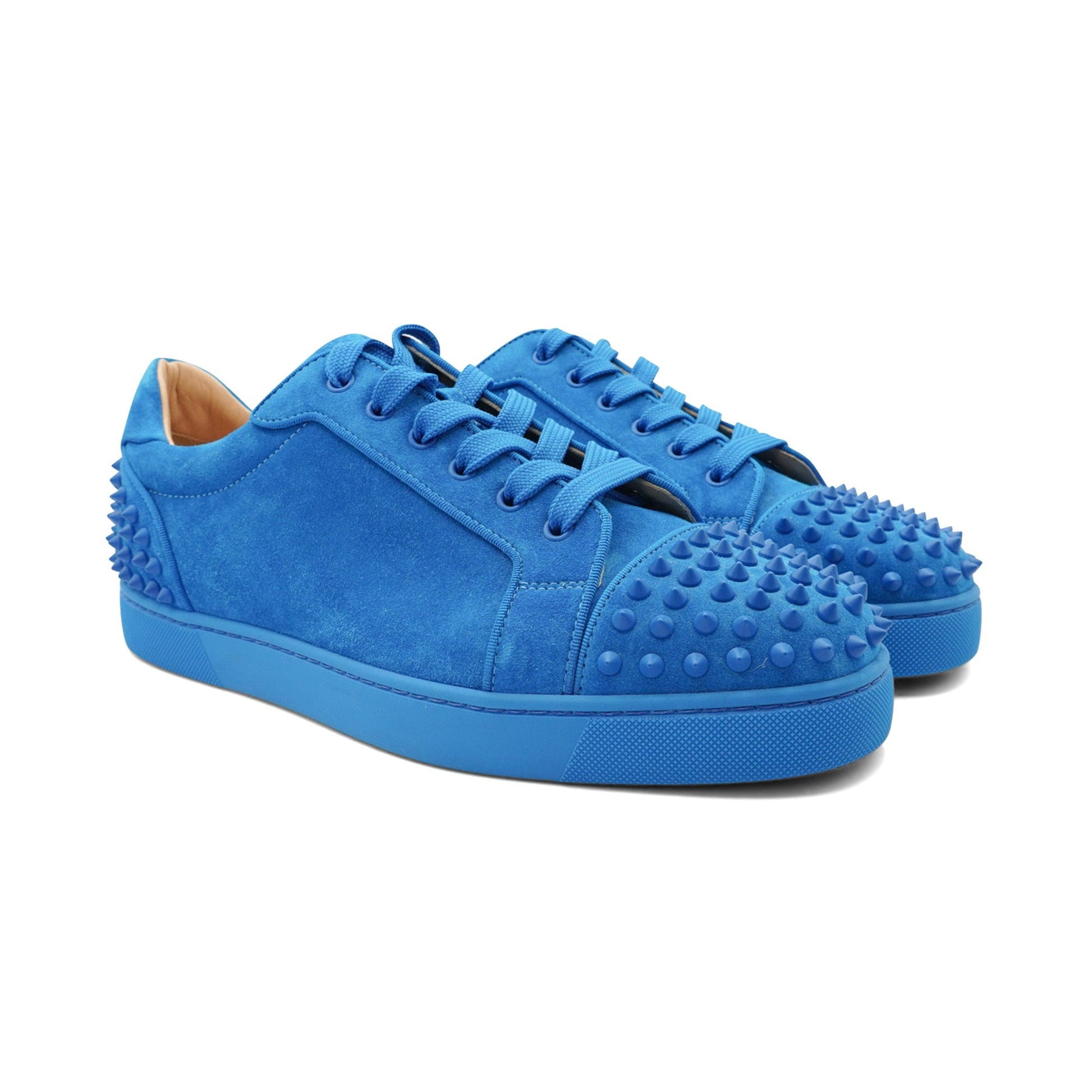 Christian Louboutin 'Louis Junior Spike' sneakers in blue suede with monochromatic laces and sole and spike stud details on the heels and toes.