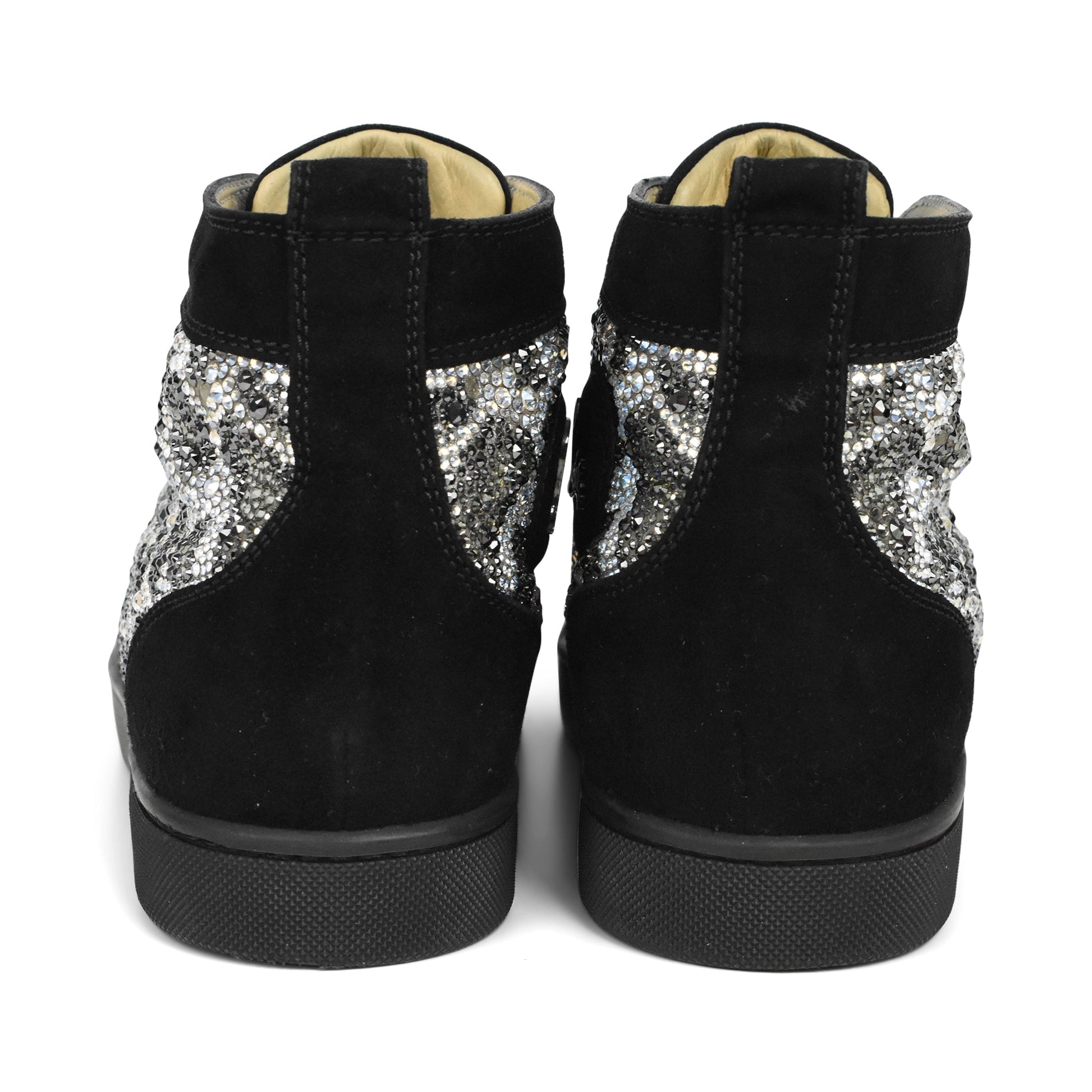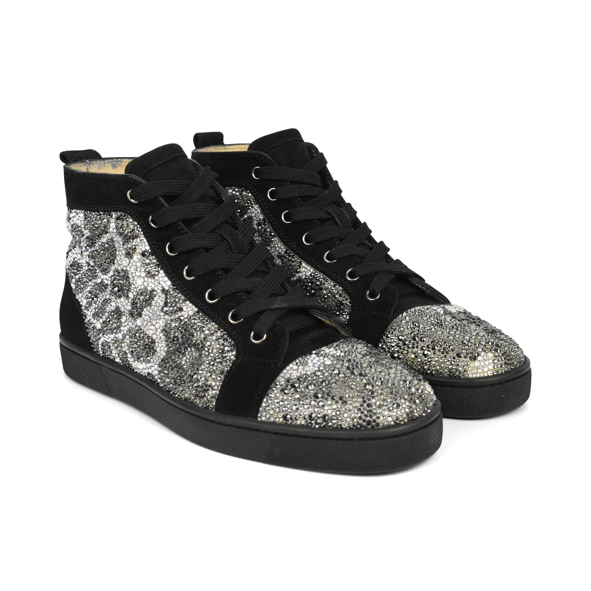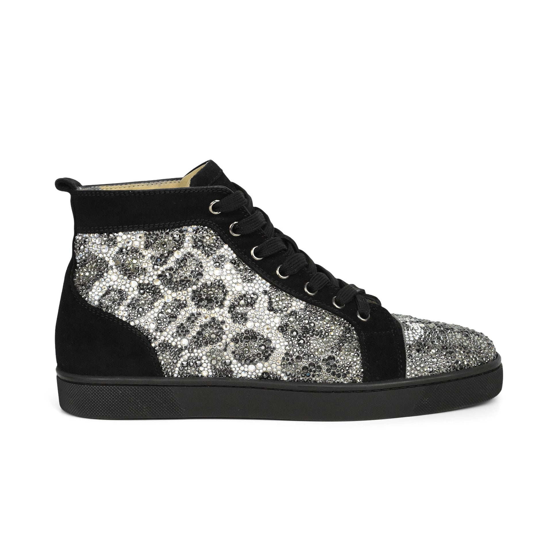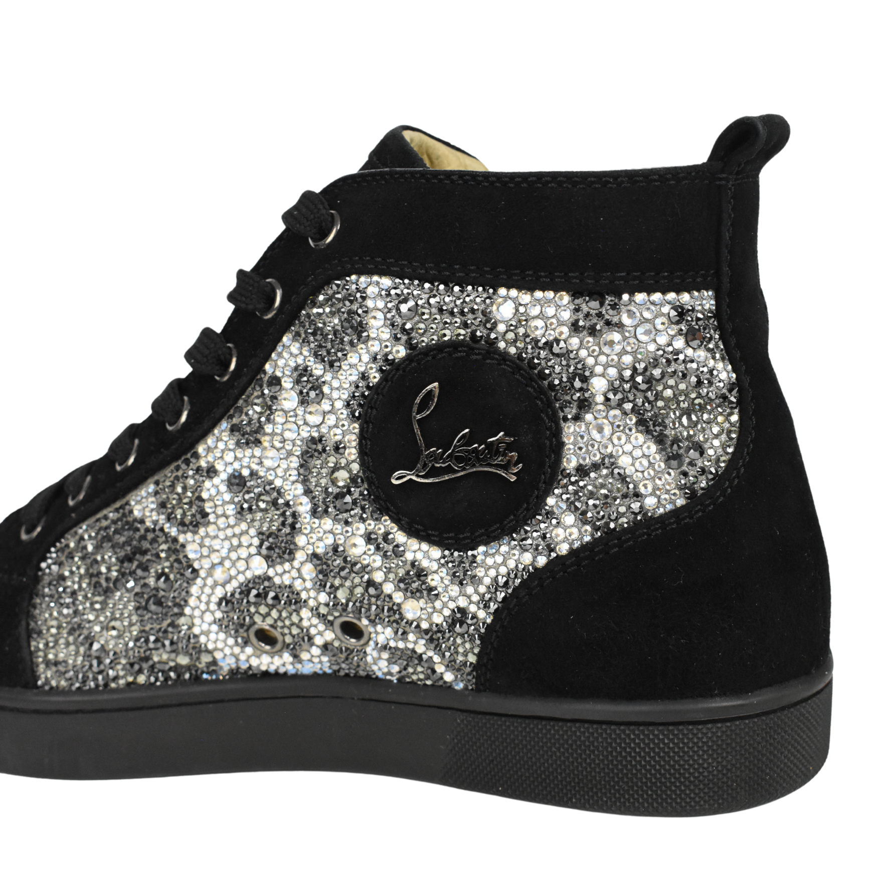 Christian Louboutin 'Louis Strass' high-top sneakers in black suede with silver and black swarovski crystals in a leopard print pattern. Features black flat laces, black suede circle patch with gunmetal hardware logo on the inner sides, and iconic red sole.