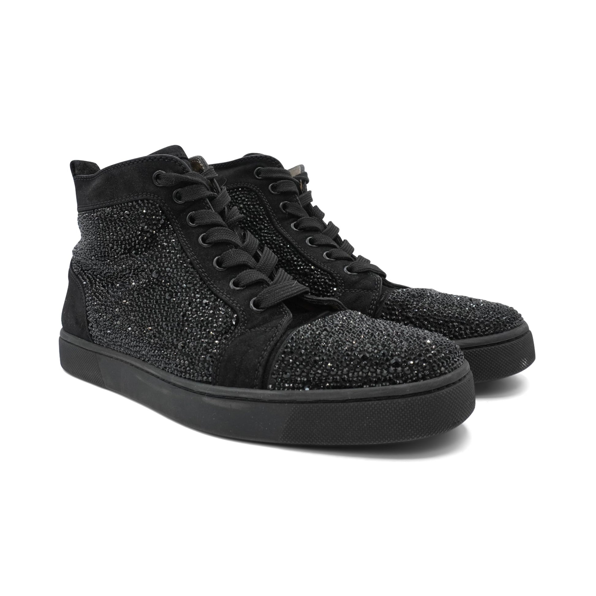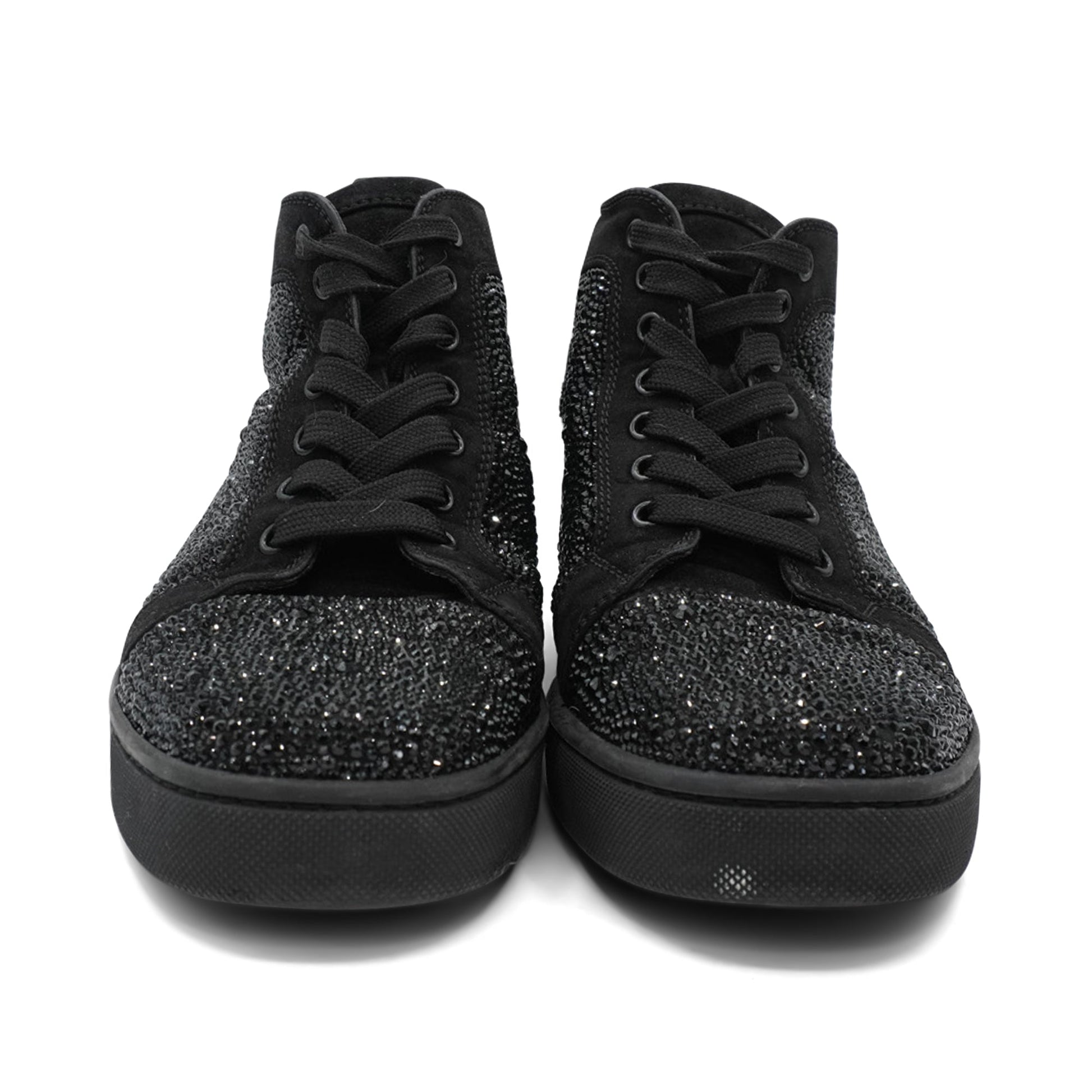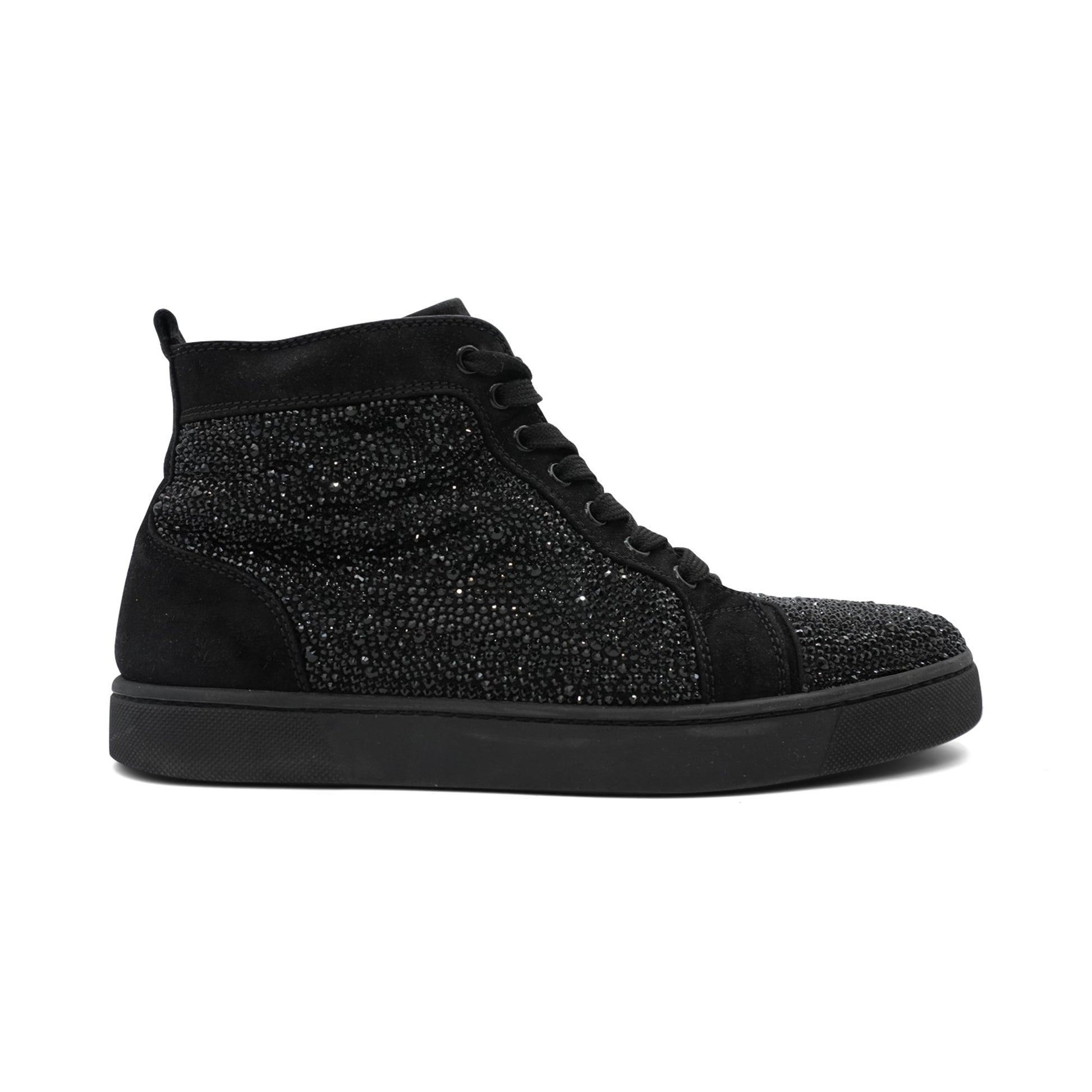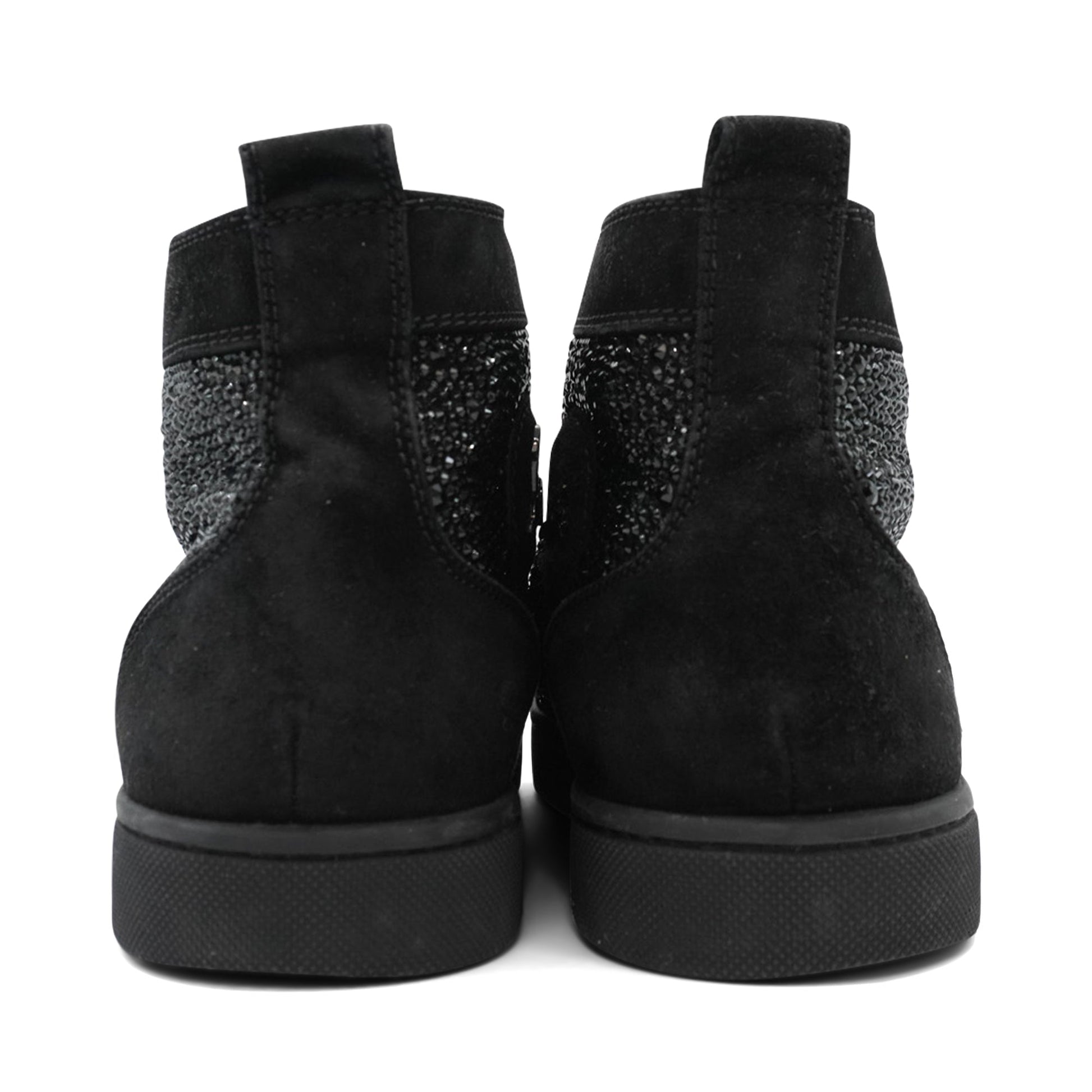 Christian Louboutin 'Louis Strass' high top sneakers in black suede encrusted with black Swarovski crystals of varying sizes. Feature metal logo patches on the inner ankle and signature red rubber soles.