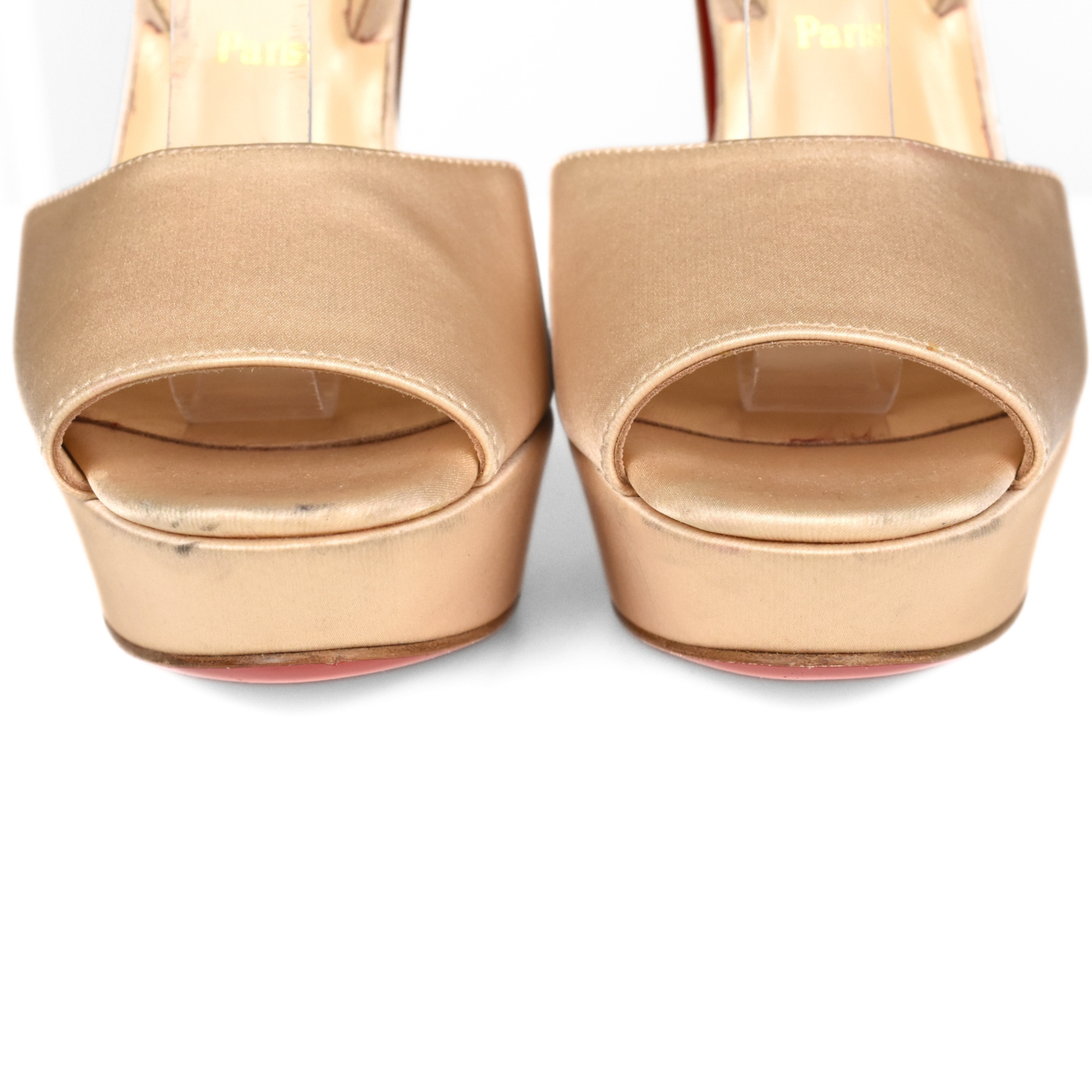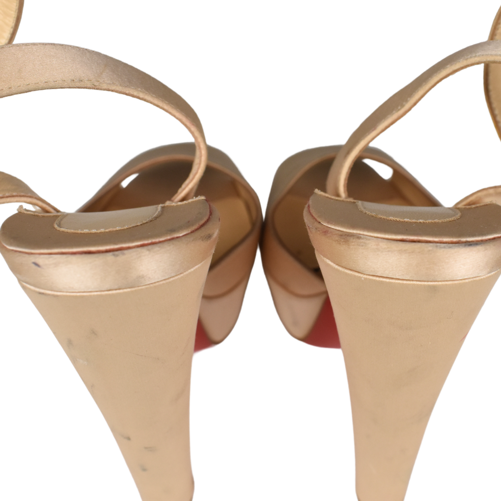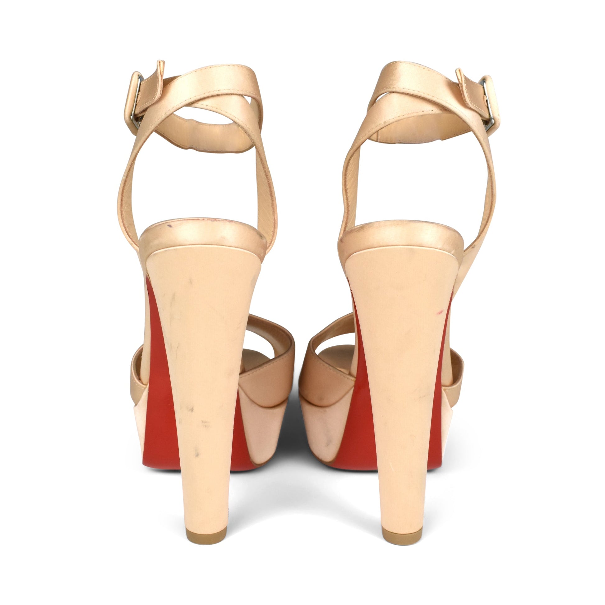 Christian Louboutin 'Loulou Dancing' peep-toe heels in beige satin. Features platform heel and adjustable ankle strap.