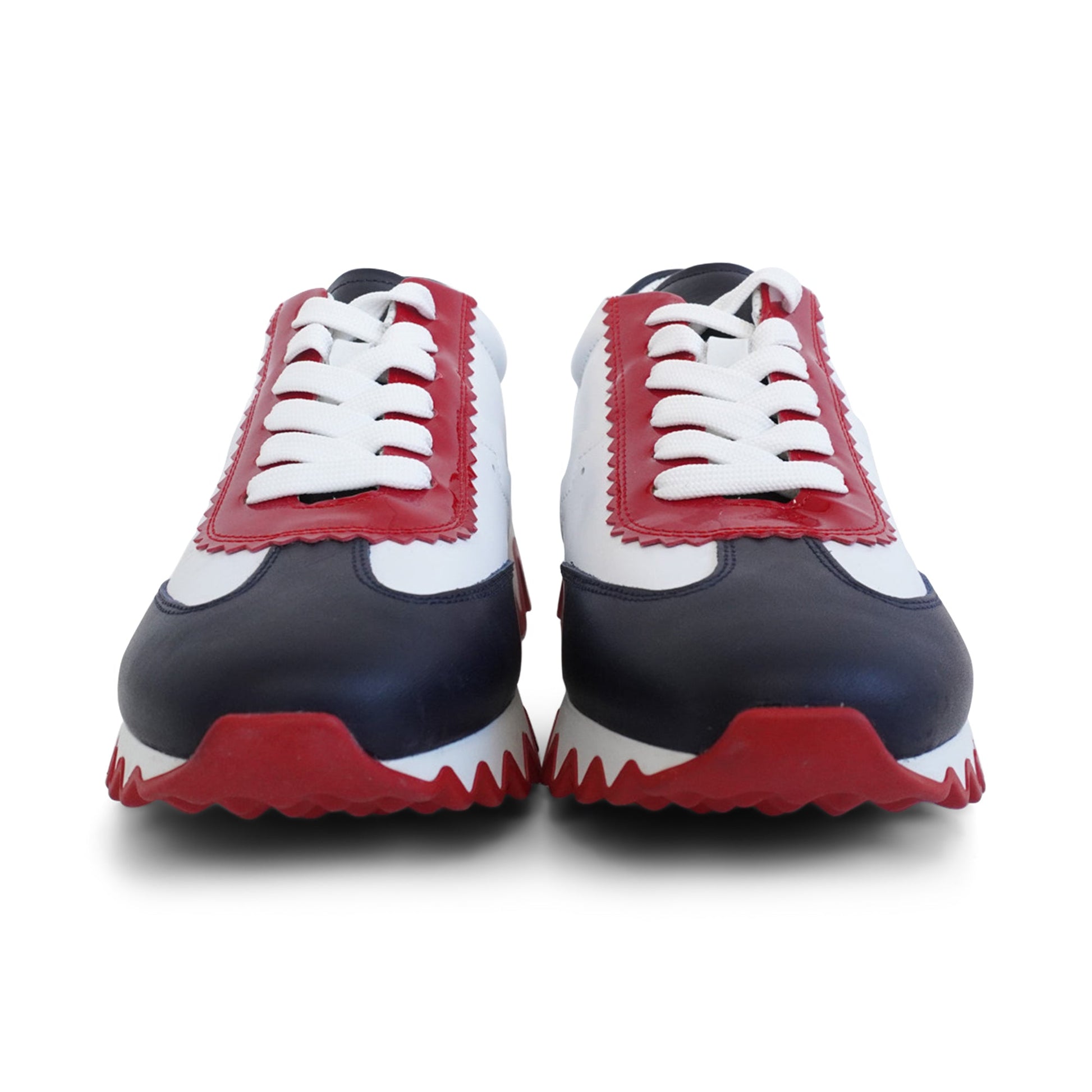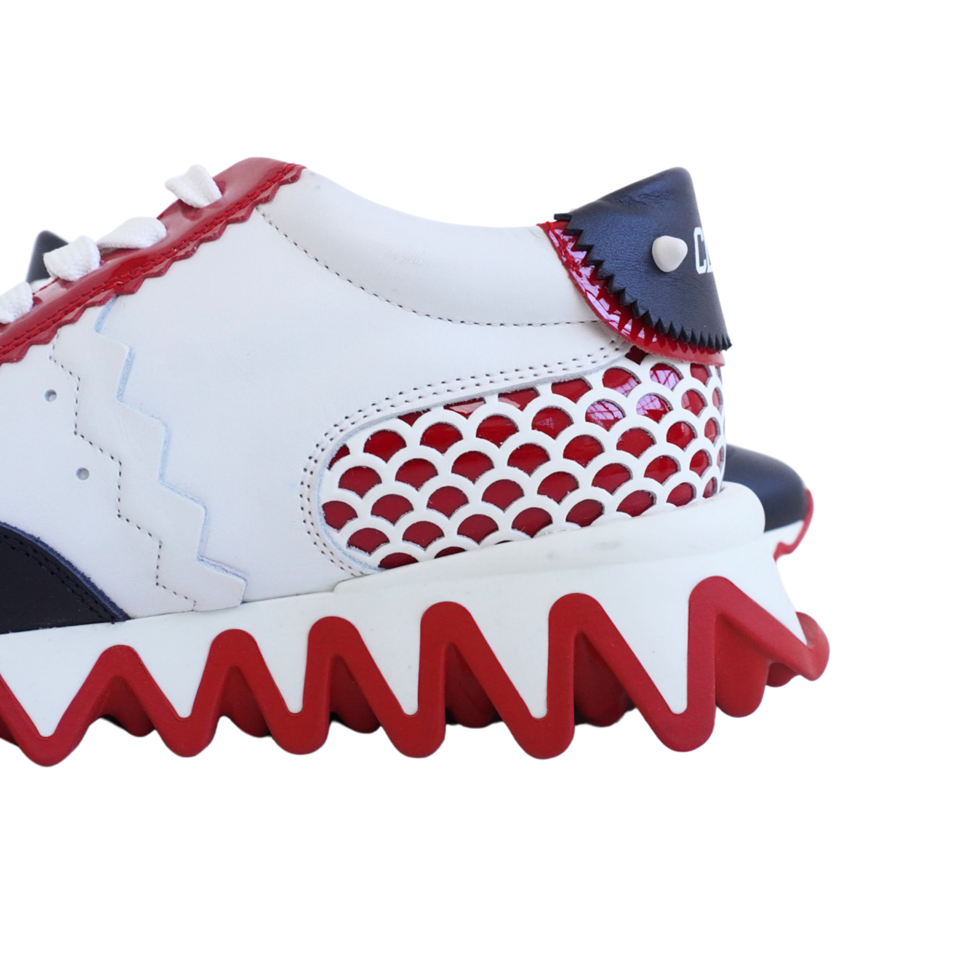 Christian Louboutin 'Mini Shark' low top sneakers in white, navy, and red leather with zig zag and scallop detailing and chunky shark tooth soles.