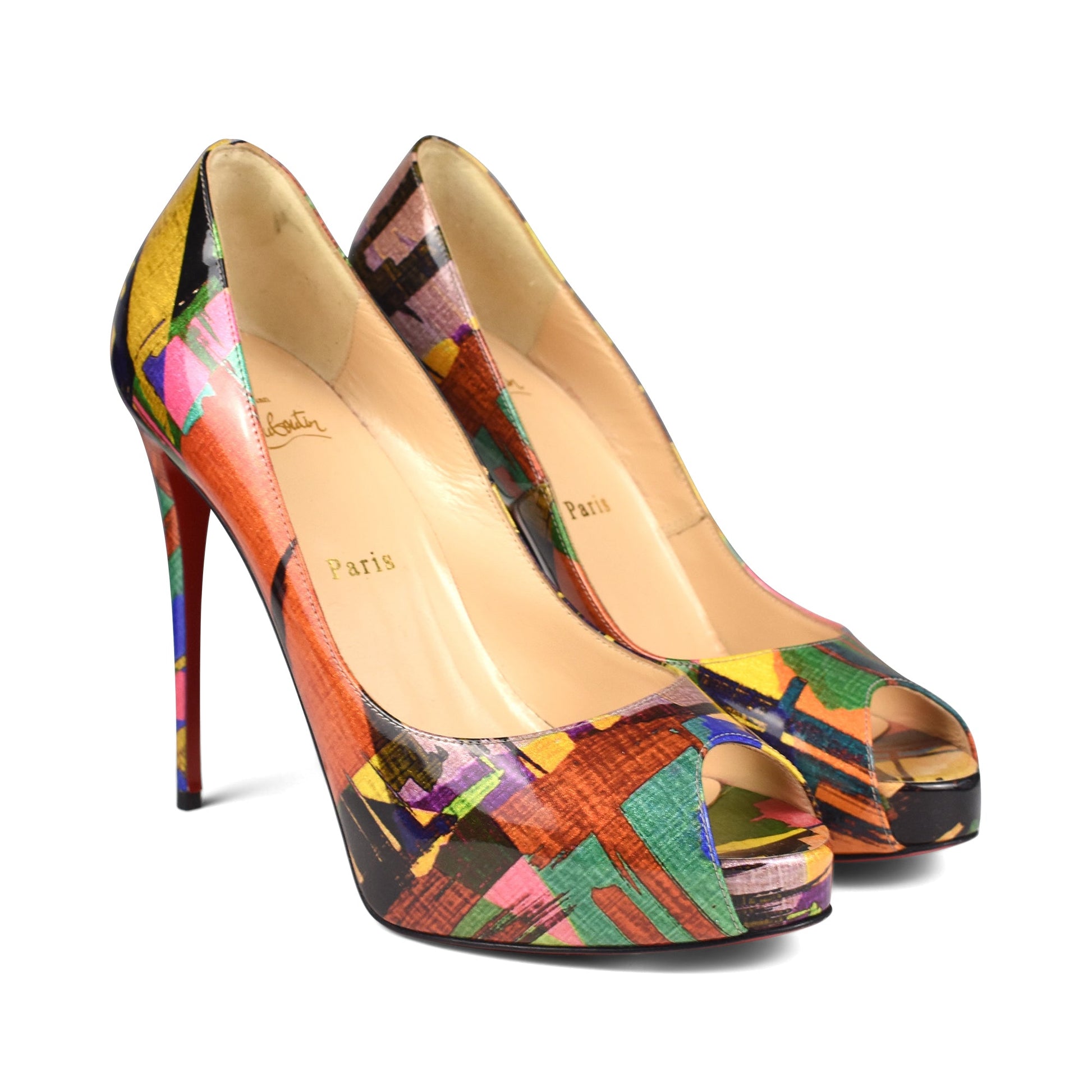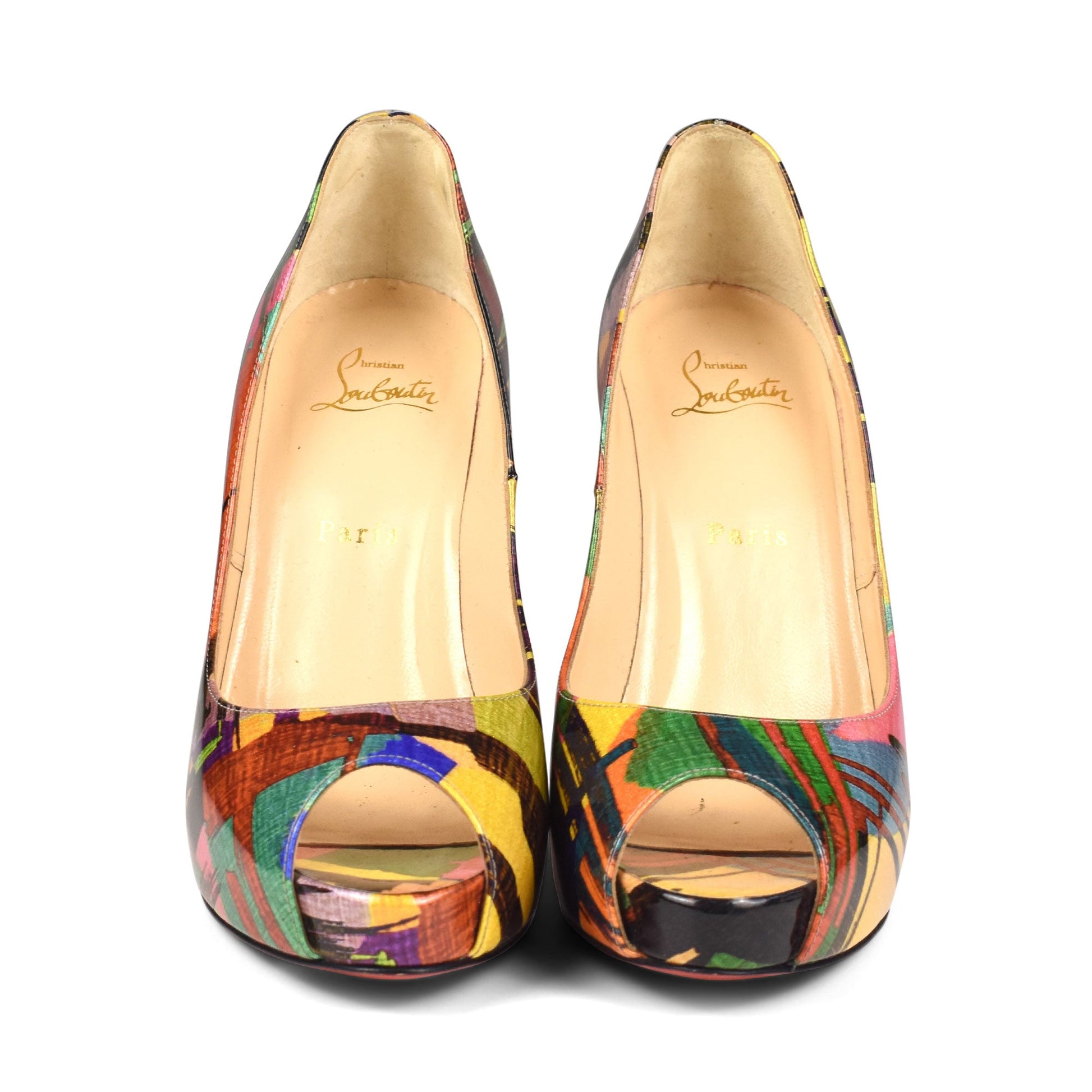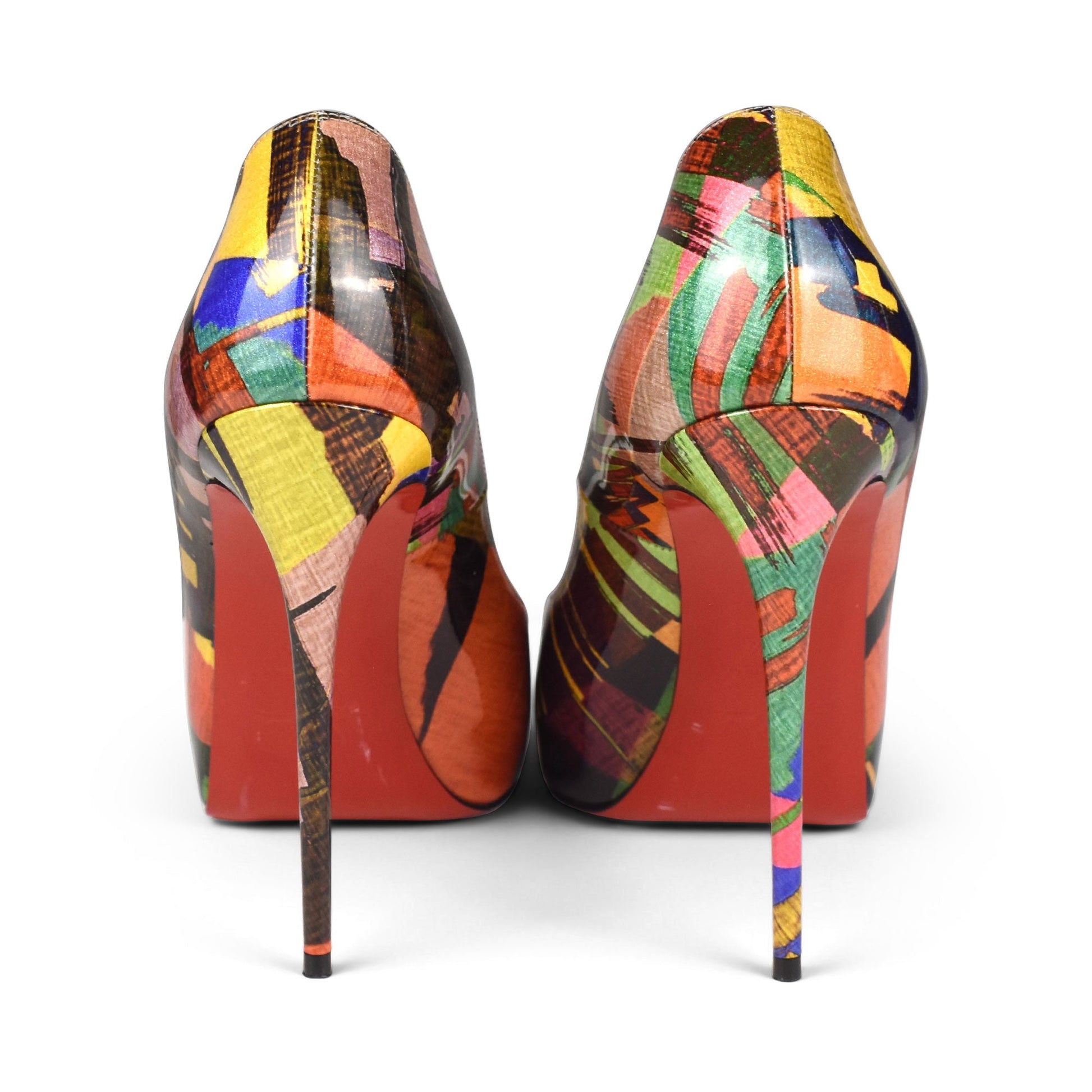 Christian Louboutin 'Very Prive' peep-toe Heels in multicolour glitter patent leather with an all-over abstract multi-colour design with a stiletto heel and red bottom sole.