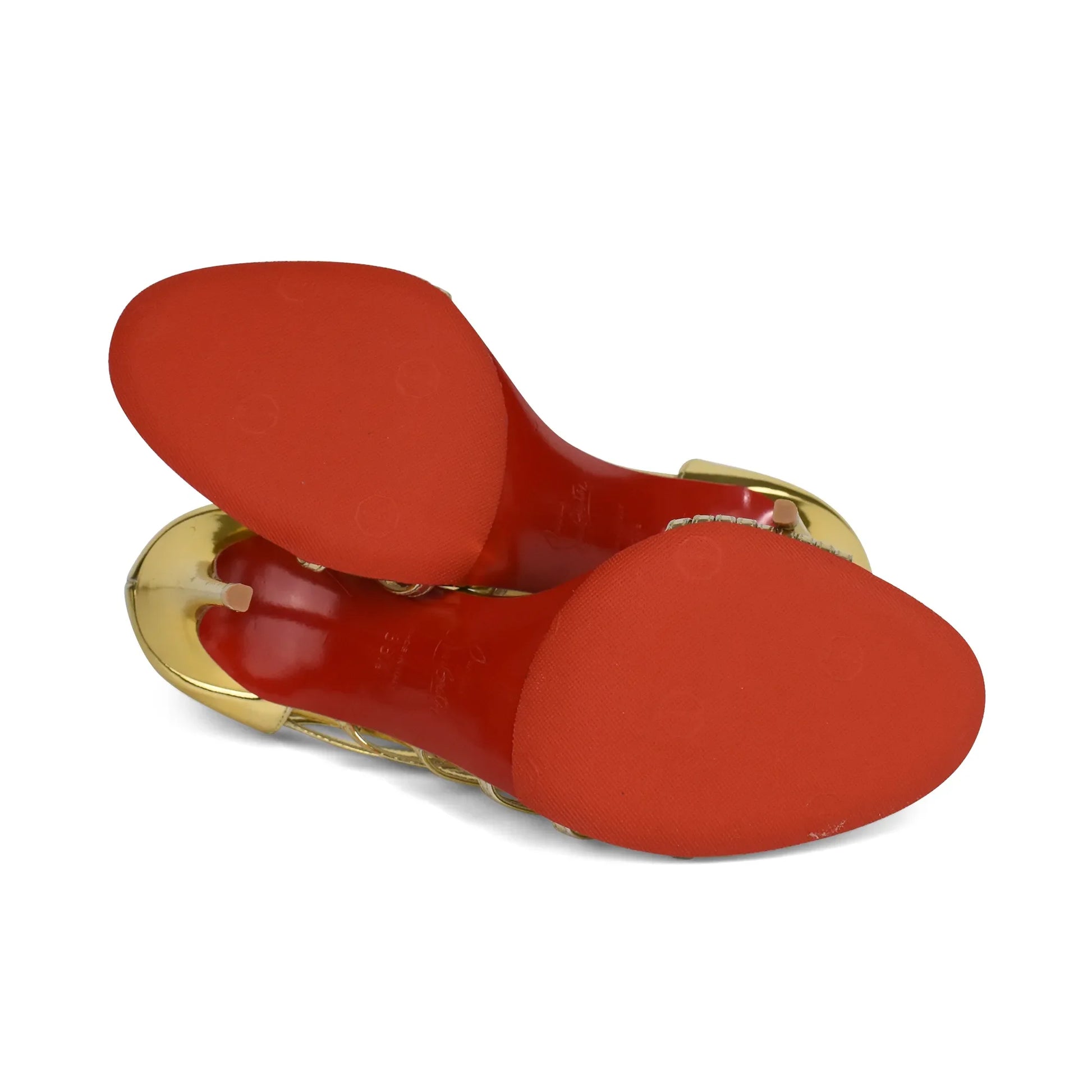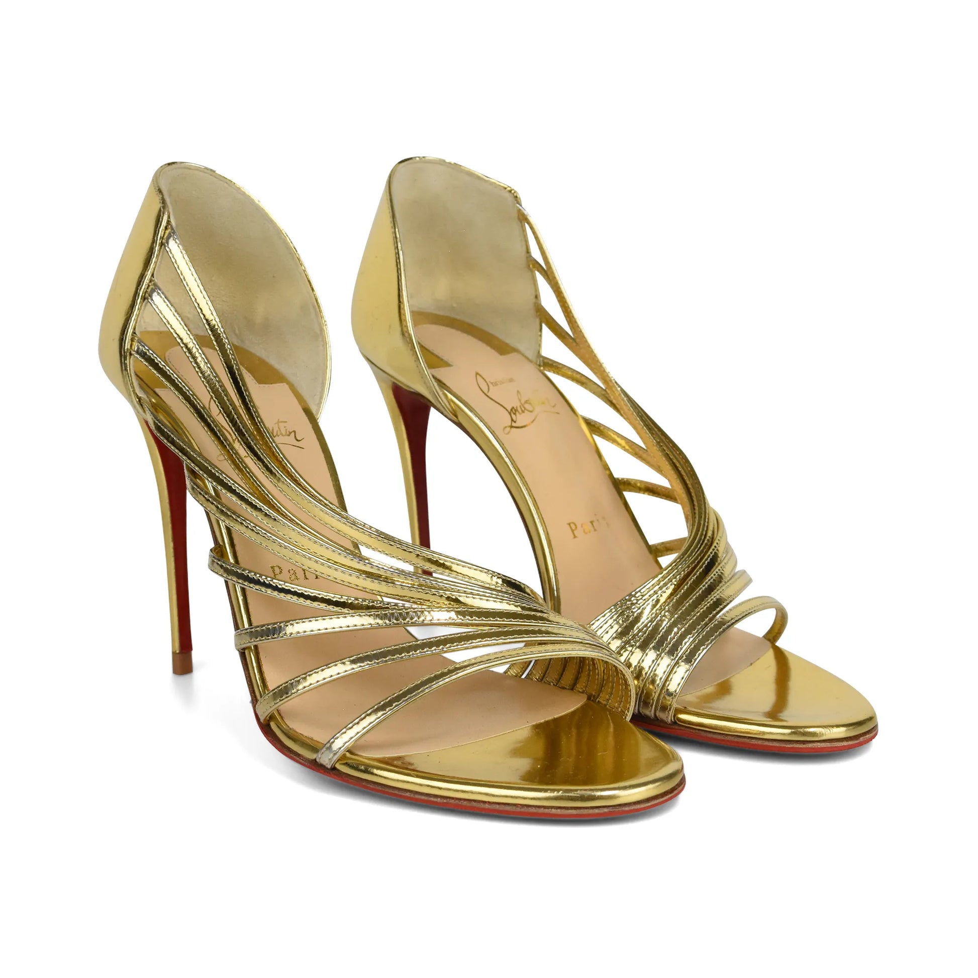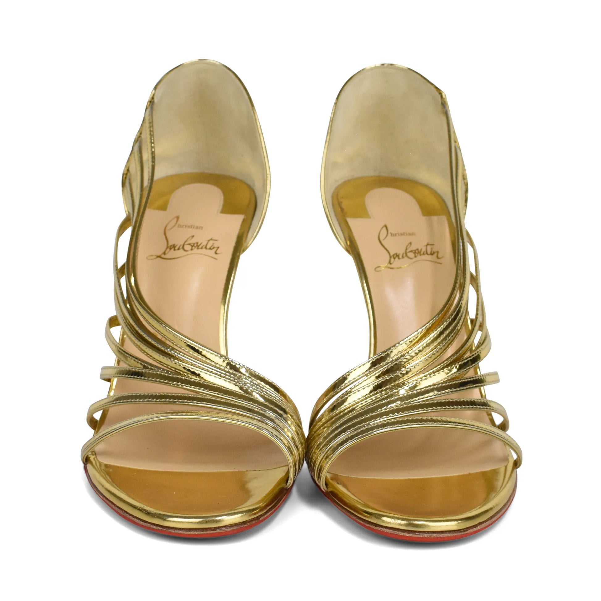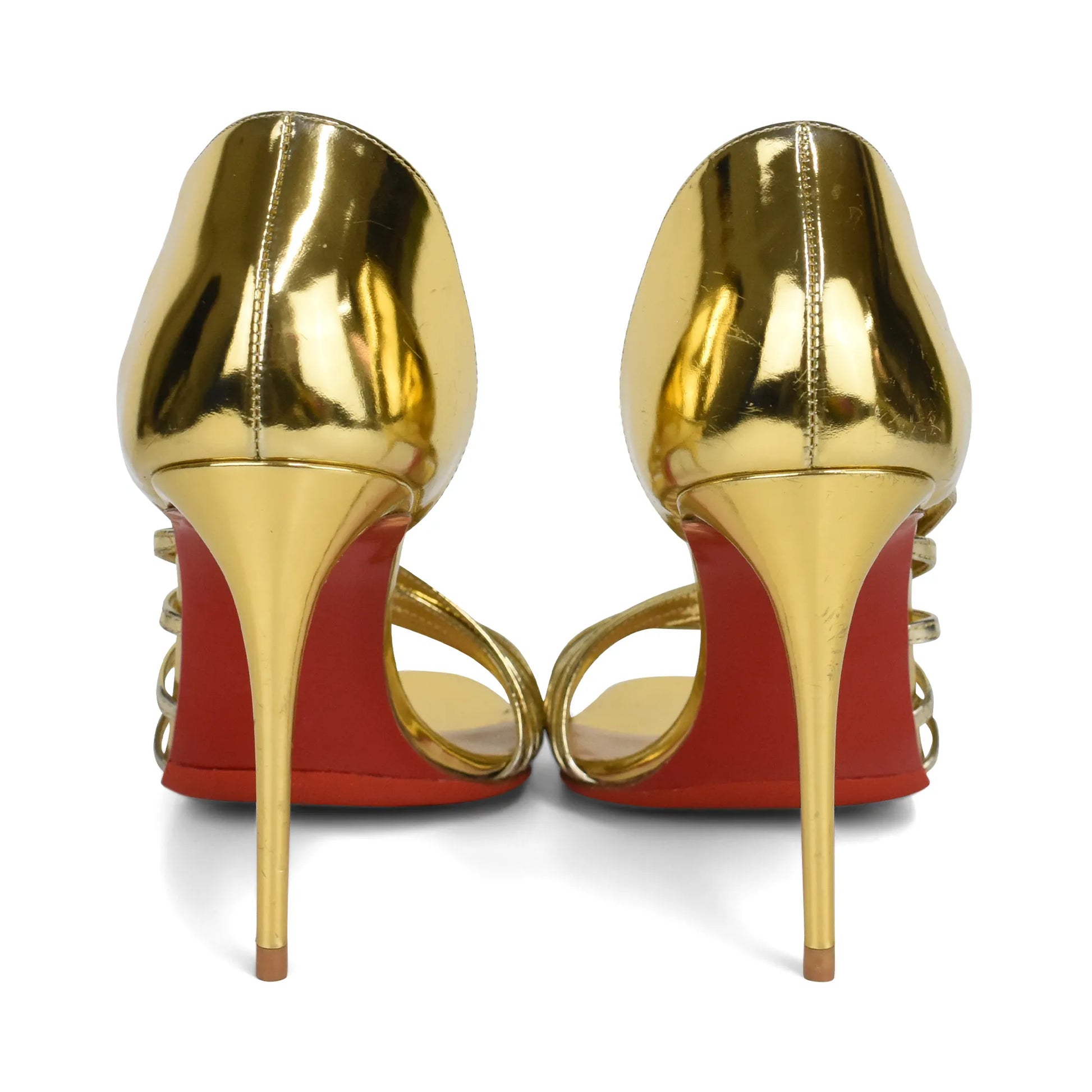 Christian Louboutin 'Norina' heeled sandals in patent metallic gold leather with multiple straps across the foot. Features a closed back, an open toe, and a stiletto heel.