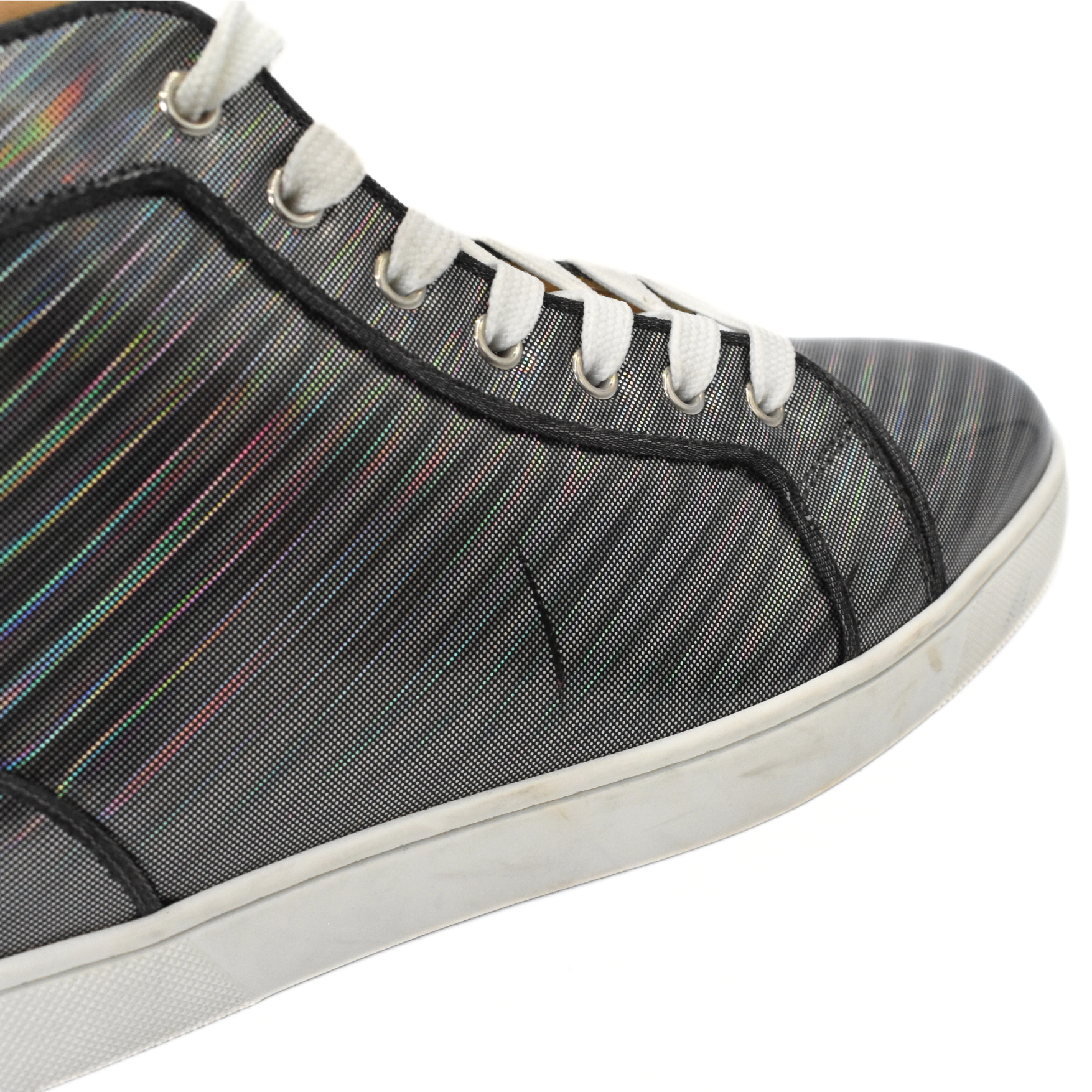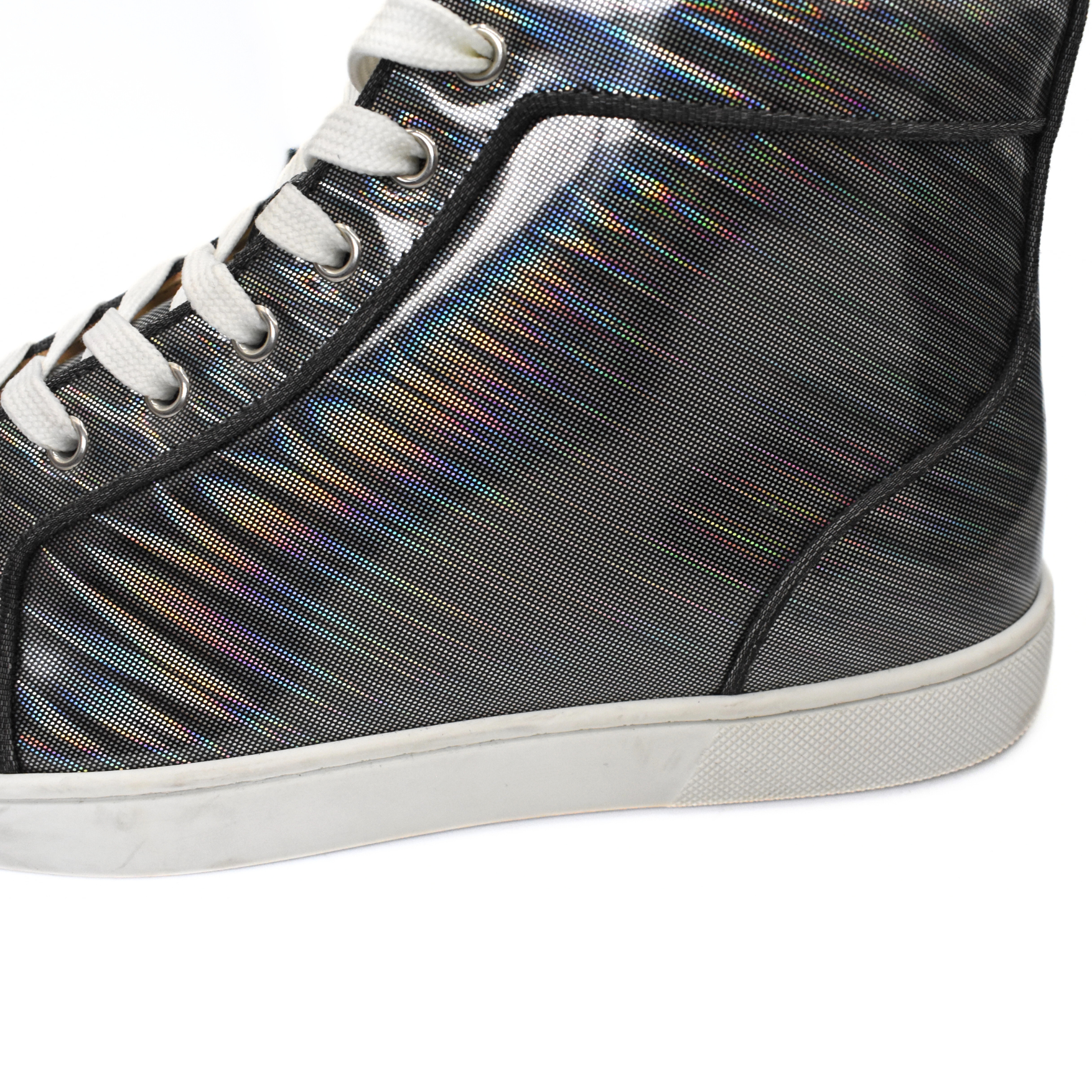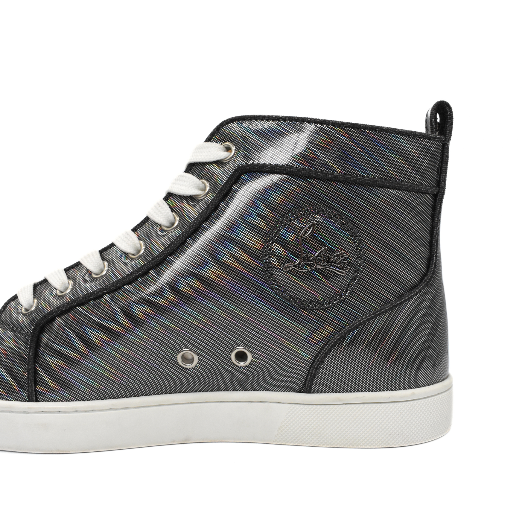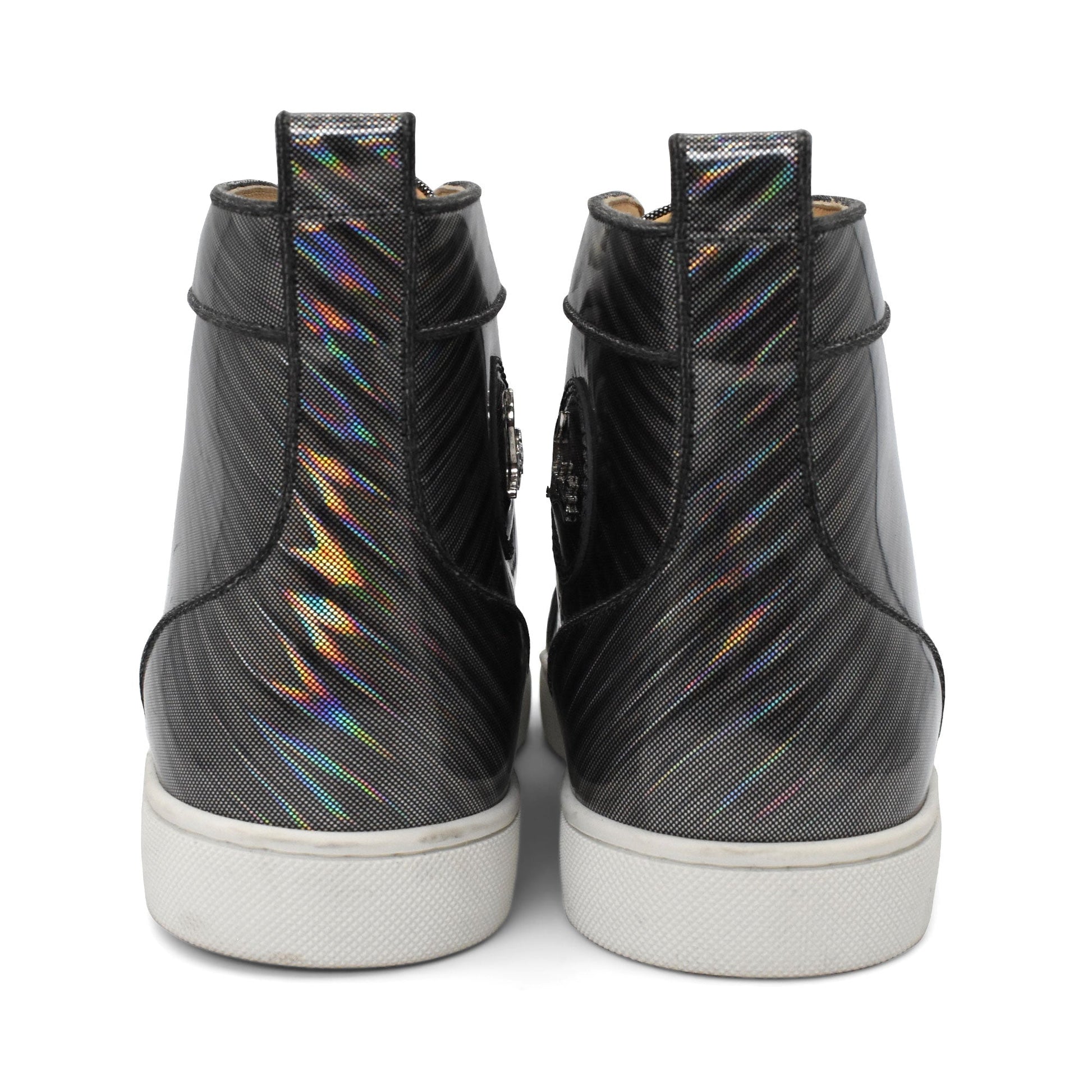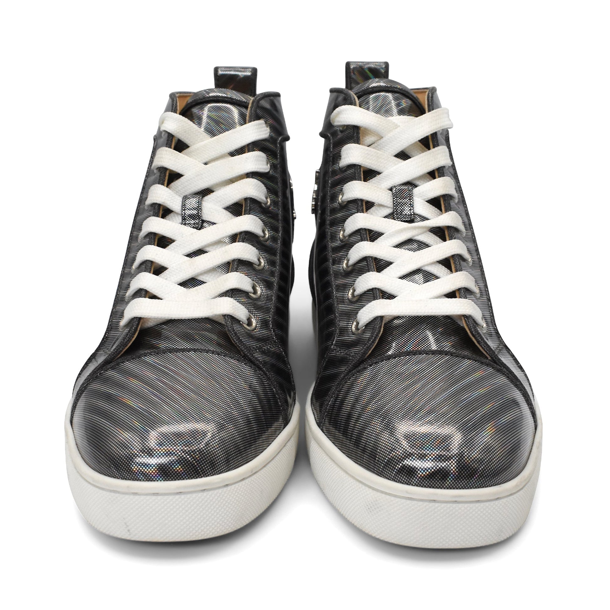 Christian Louboutin 'Orlando Electric Rain' high-top sneakers in holographic dark grey patent leather with white laces, a white rubber sole, and a silver logo nameplate on the inner sides of the shoe.