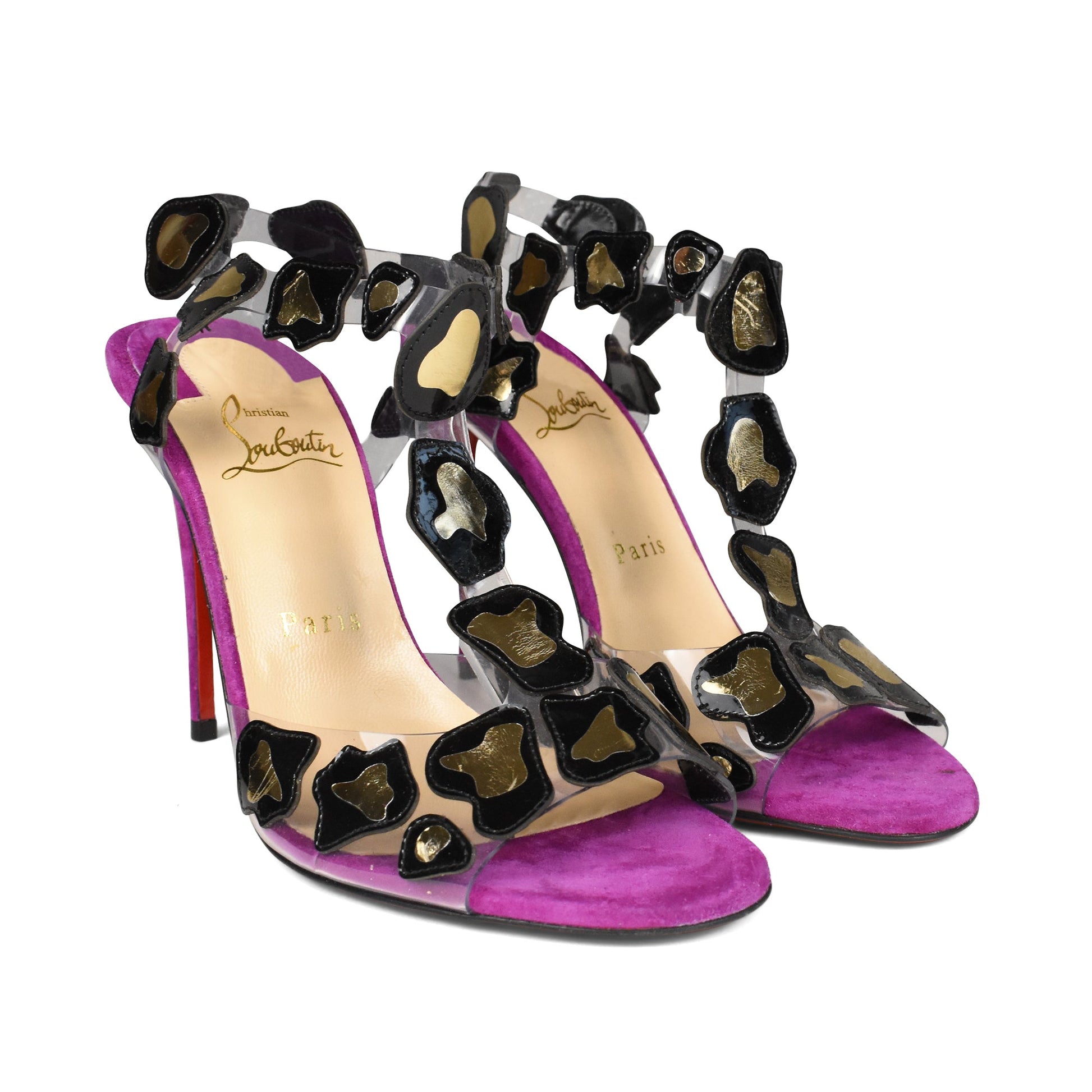 Christian Louboutin 'Parsemis' Heels in purple suede with a pvc t-strap and leopard print throughout in black and gold.