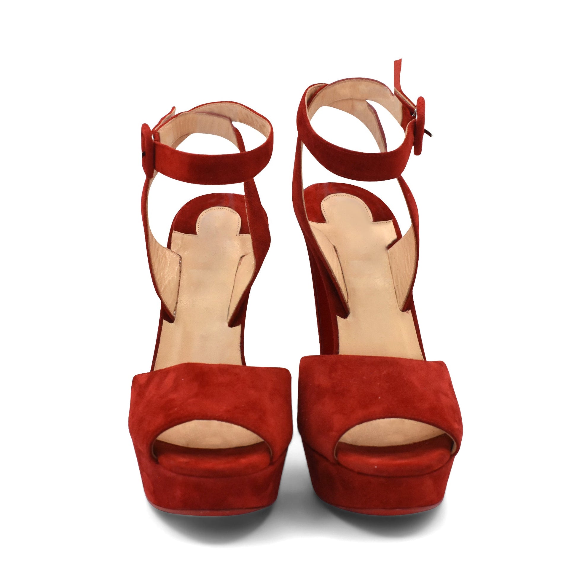 Christian Louboutin 'LouLou Dancing' platform sandals in red suede with wrap around ankle straps and peep toes.