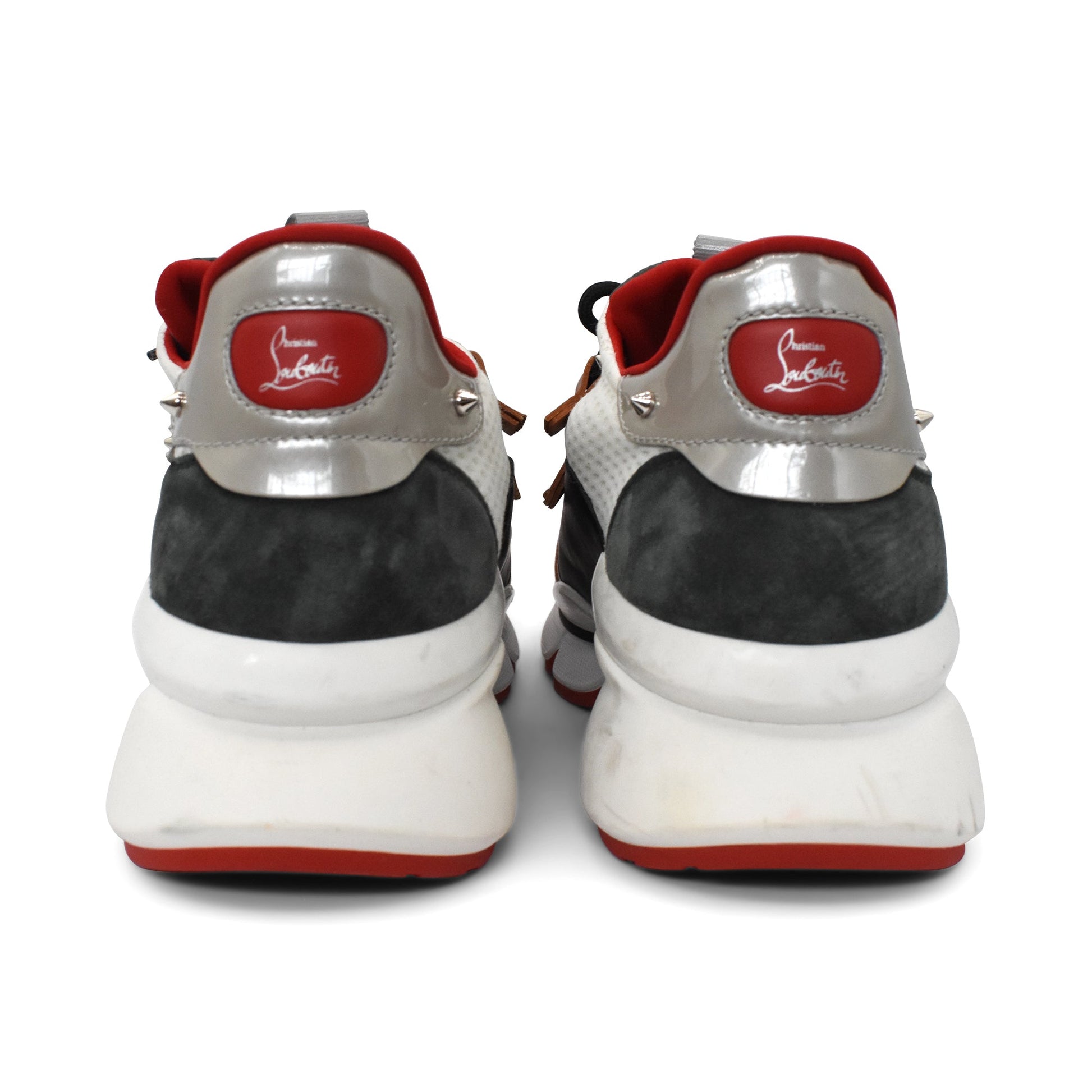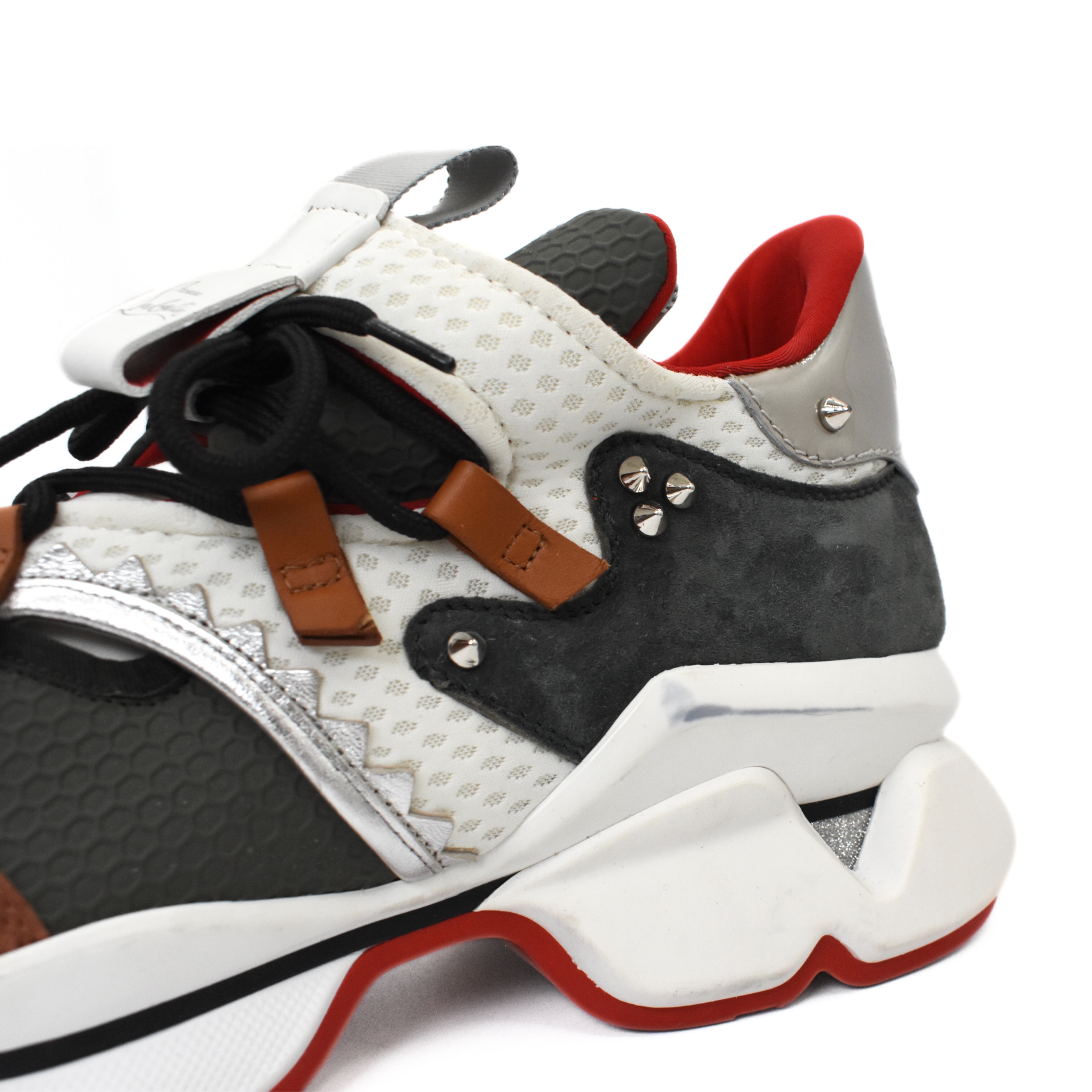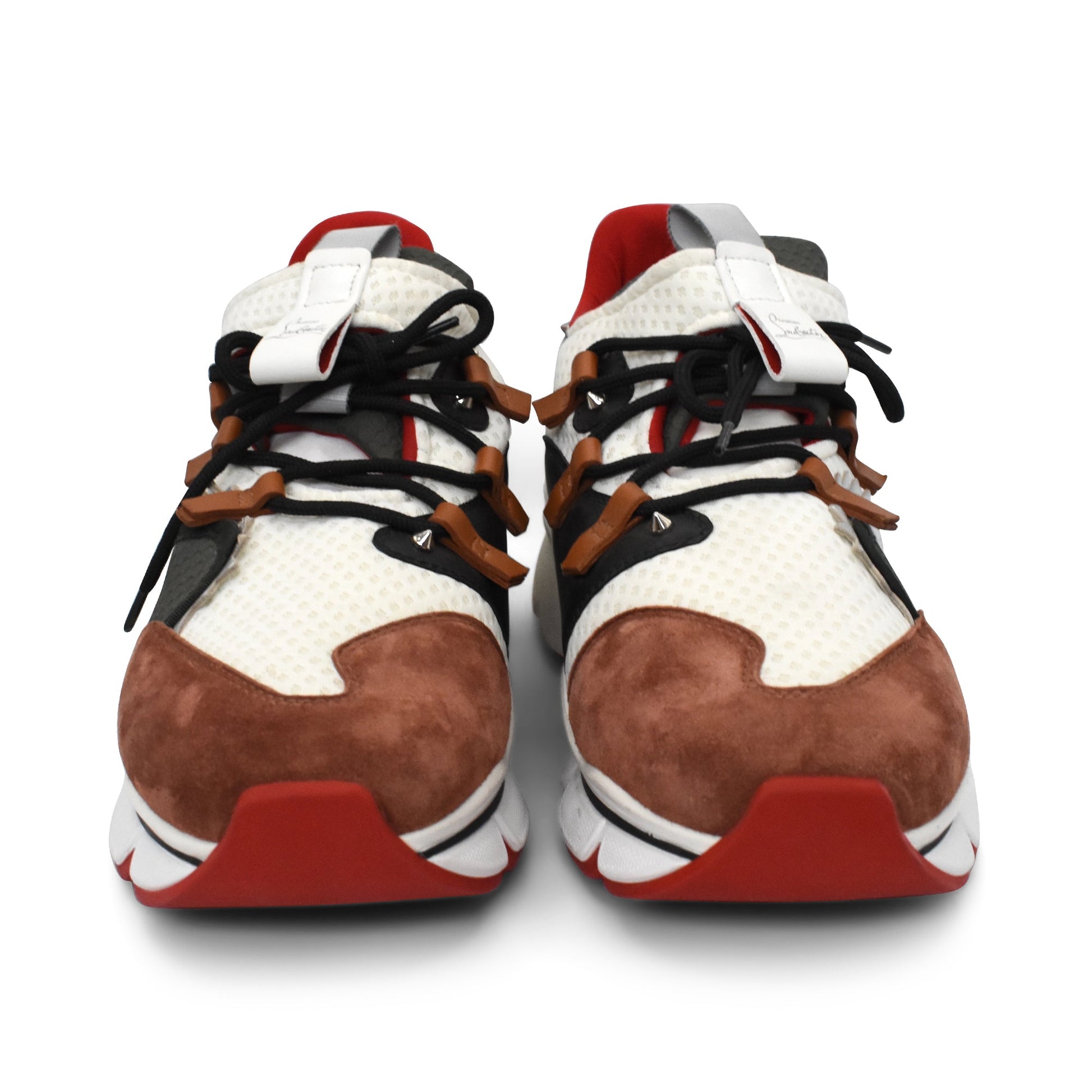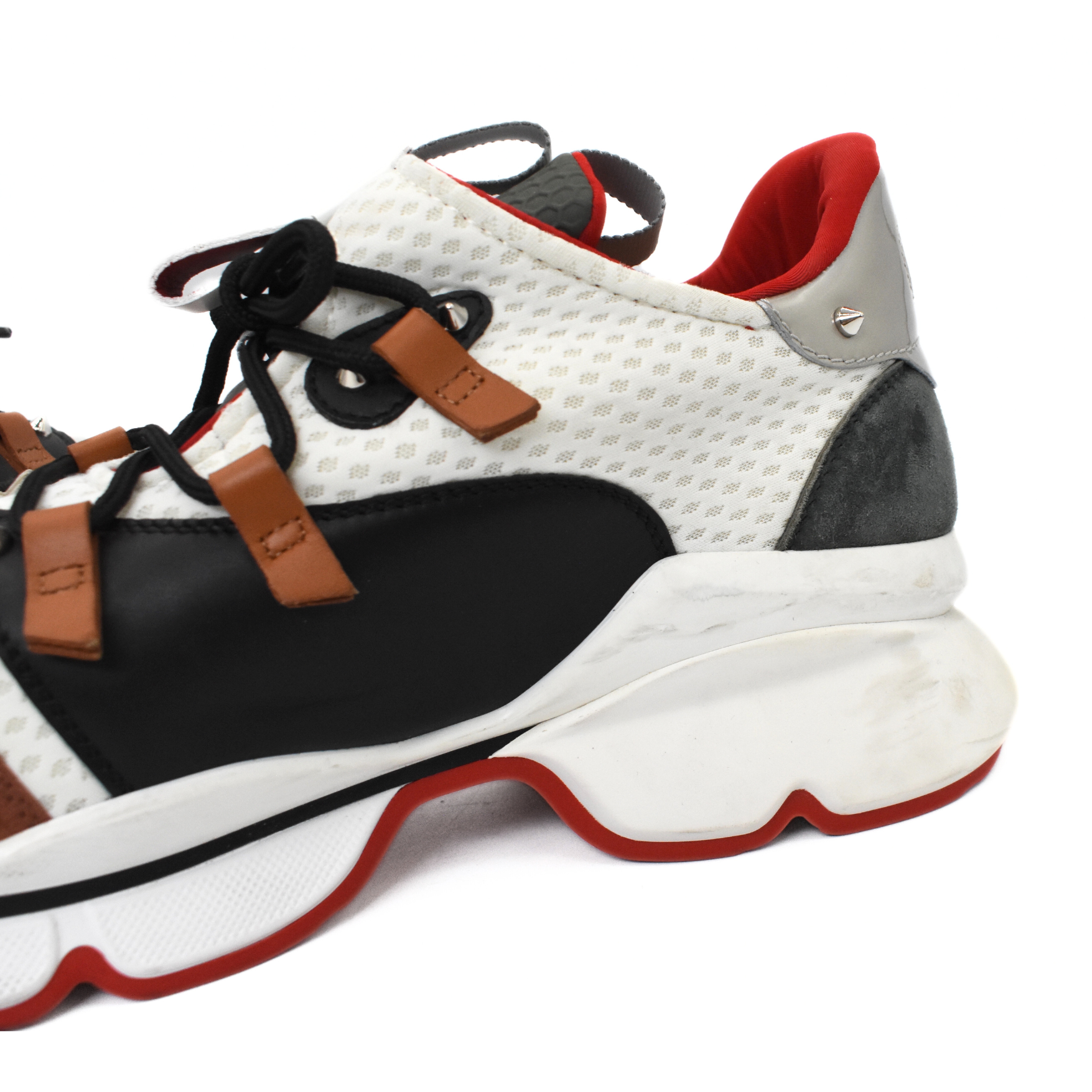 Christian Louboutin 'Red Runner' sneakers in white mesh with brown and grey suede accents, black and brown leather trim, a black lace up closure, a chunky white sole, and silver pyramid studding details.