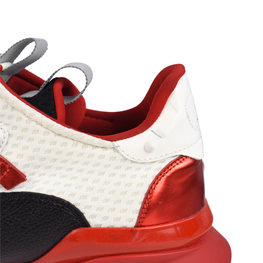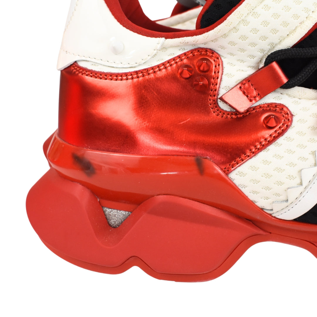 Christian Louboutin 'Red Runner' sneakers in white mesh and leather with metallic red accent panels, white and red leather trim, a black lace up closure, a chunky red sole, and red and white pyramid studding details.