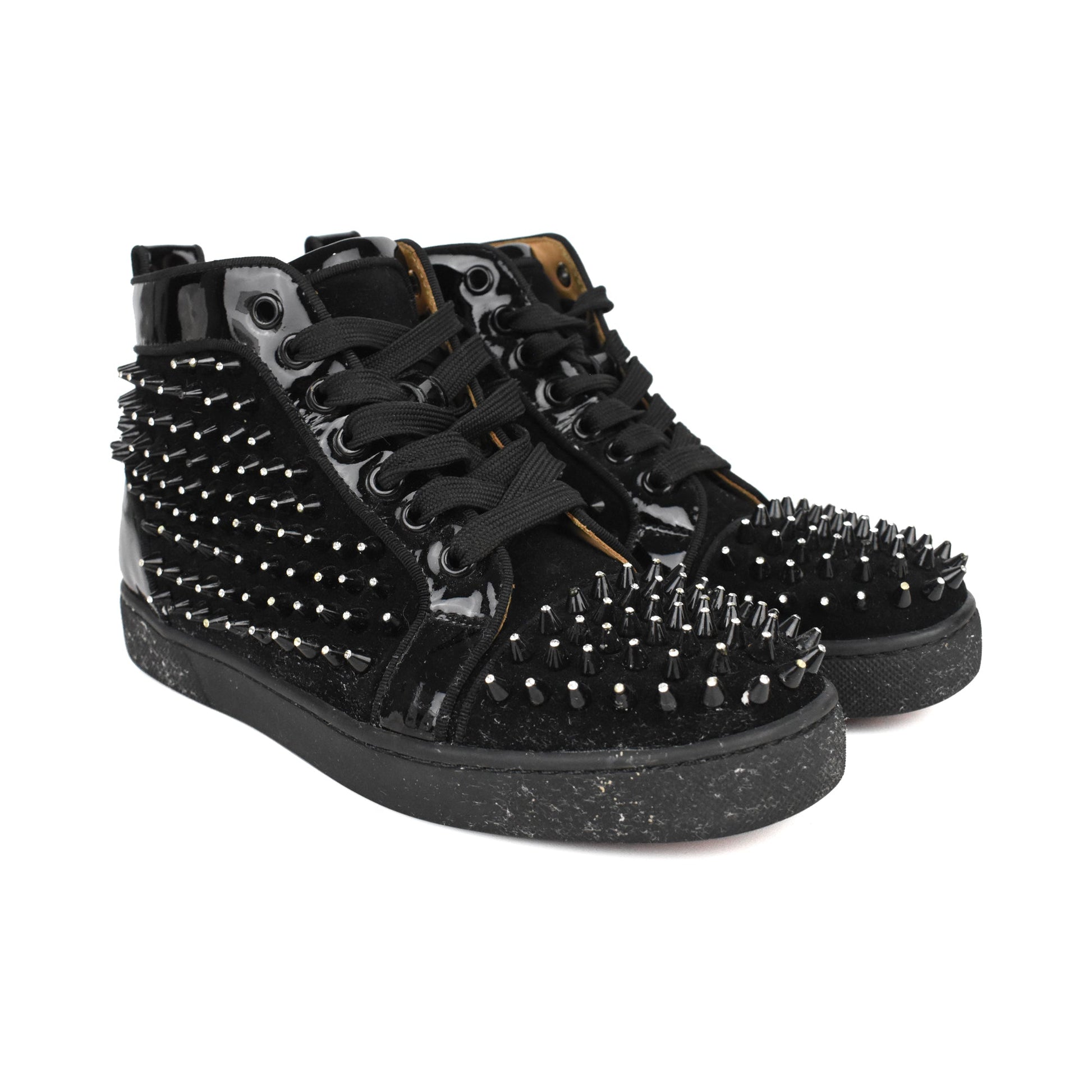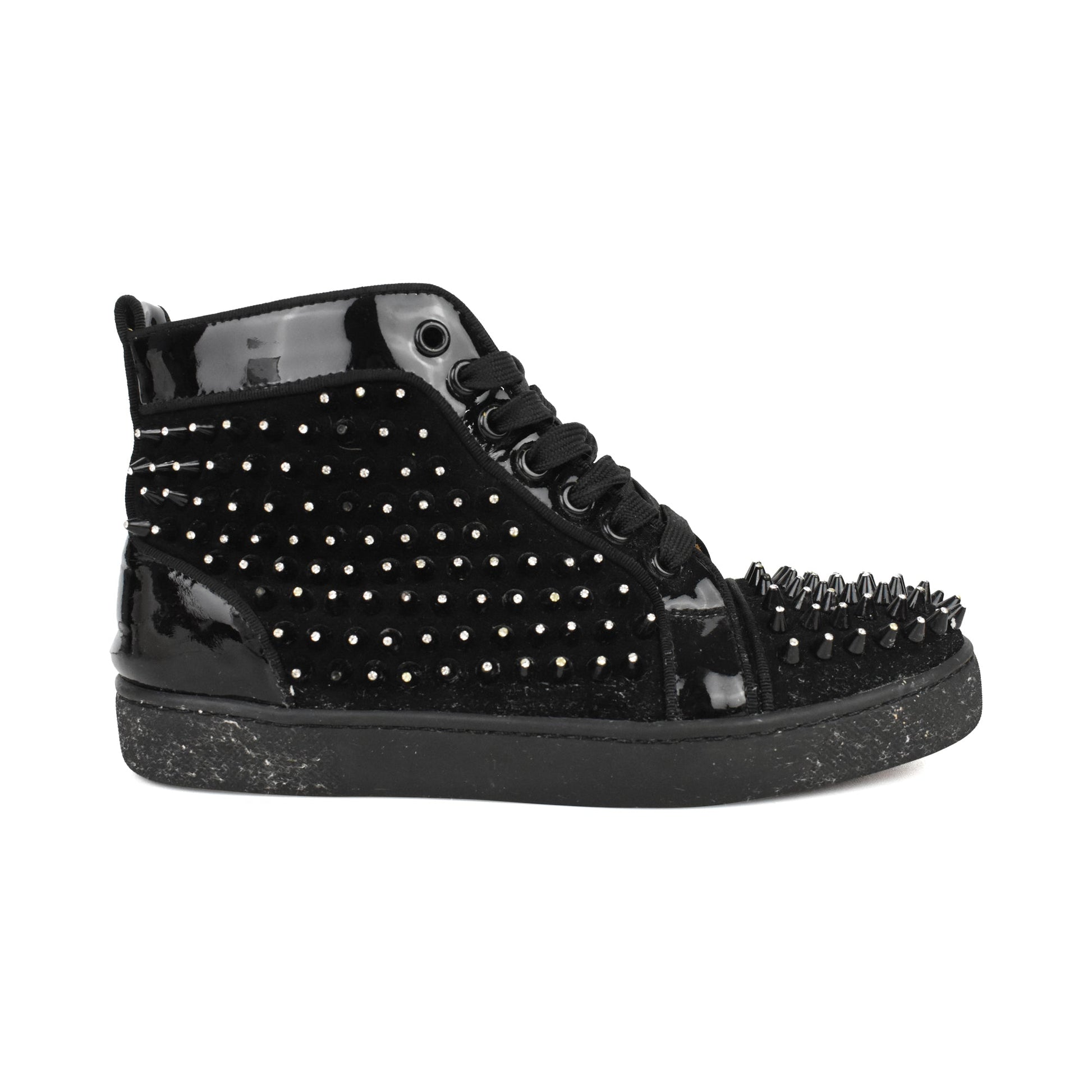 Christian Louboutin high top sneakers in black suede with patent leather trim and all-over black studs with crystal tips.
