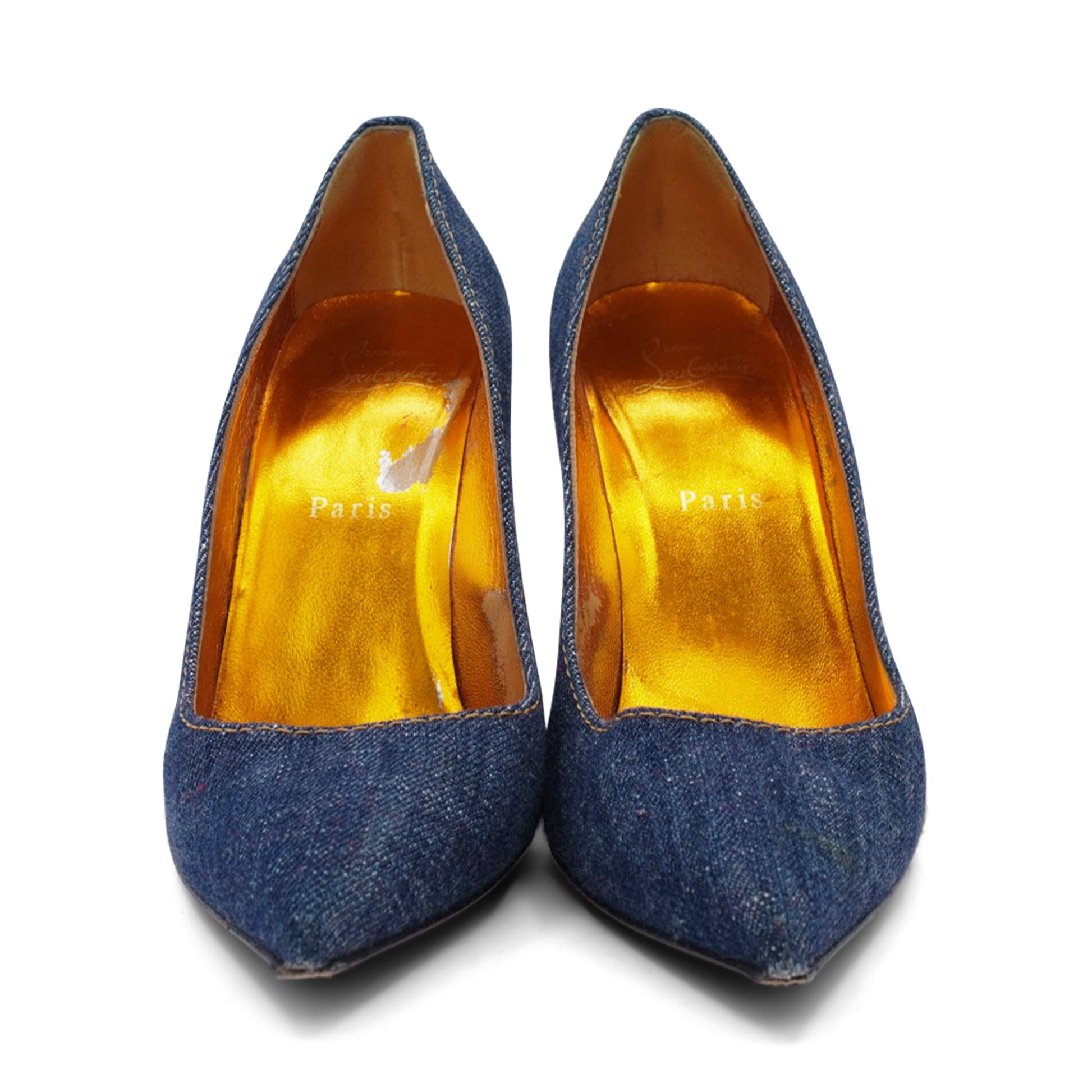 Christian Louboutin 'So Kate' pointed toe pumps in mid wash blue denim with orange contrast stitching.