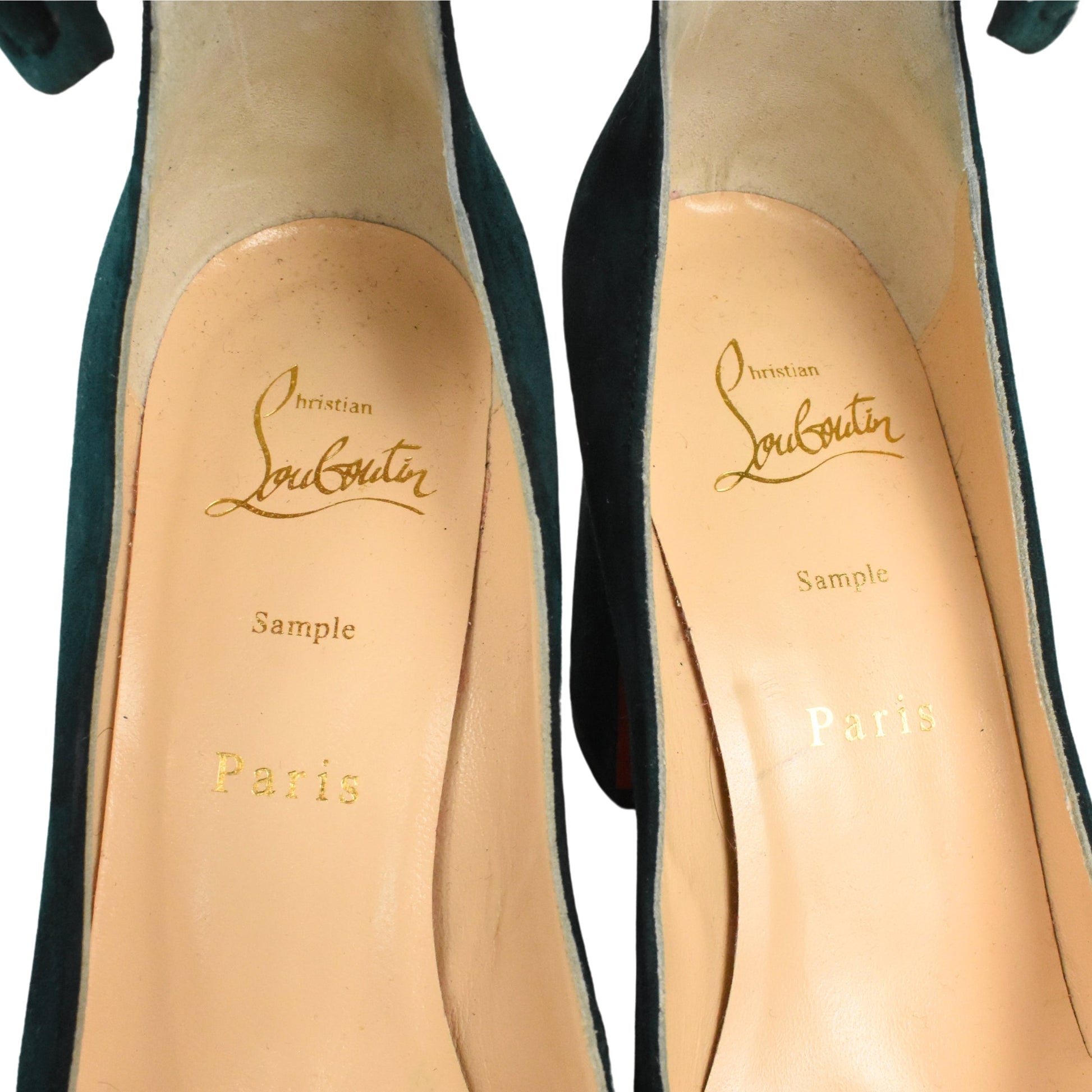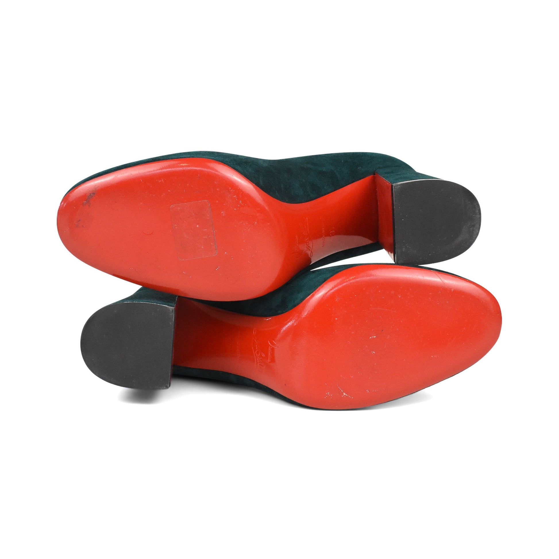 Christian Louboutin 'So Val' heels in dark green suede featuring an ankle strap with buckle hardware, a block heel, and a rounded toe.