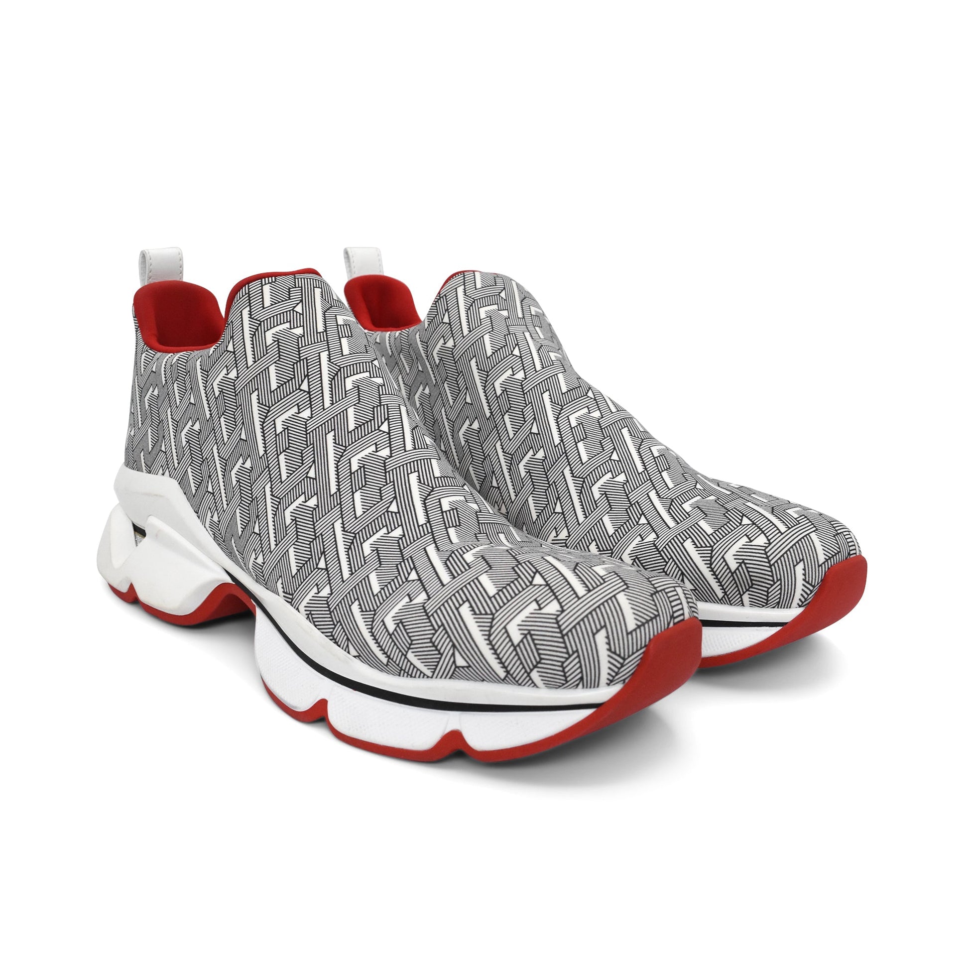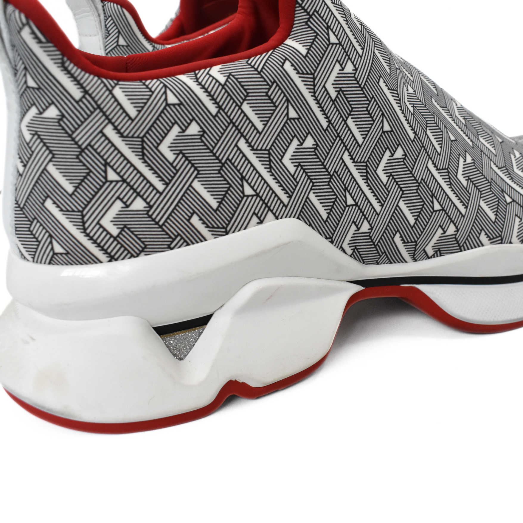 Christian Louboutin 'Space Run' sock sneakers in black and white abstract 'CL' monogram printed neoprene with red trim and a chunky white rubber sole.